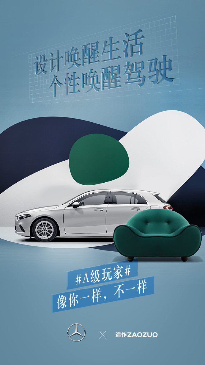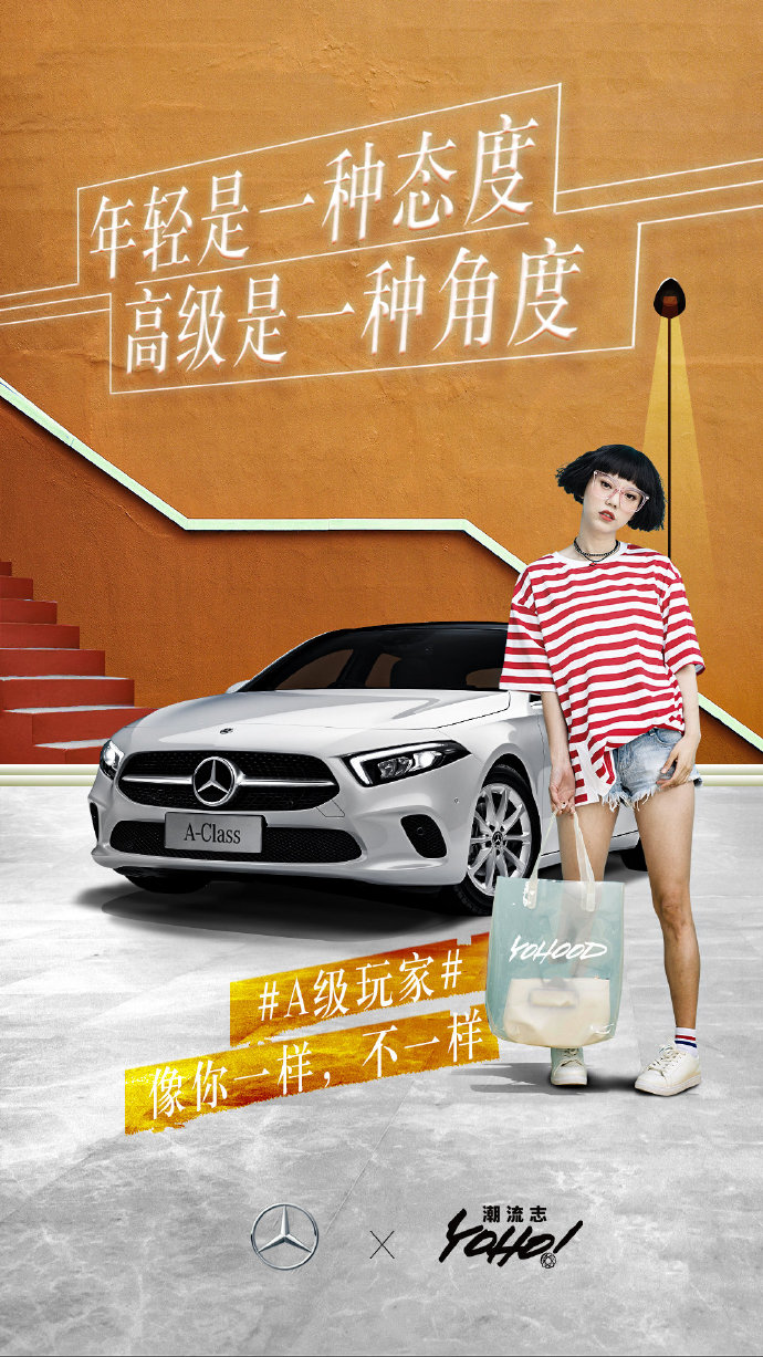梅赛德斯 – 奔驰为新款A级轿车发布了30秒TVC,60秒钟的态度广告,以及“手杖党福利”,“拯救强迫症”和“本能保镖”三个系列广告”。 在这系列广告中,梅赛德斯 – 奔驰推出了触控音控制,智能首选和自动制动等新功能。 与此同时,梅赛德斯 – 奔驰邀请Keep、Yoho潮流志、毒App等品牌制作“A级玩家,像你一样不一样”系列海报来诠释他们的态度陈述。