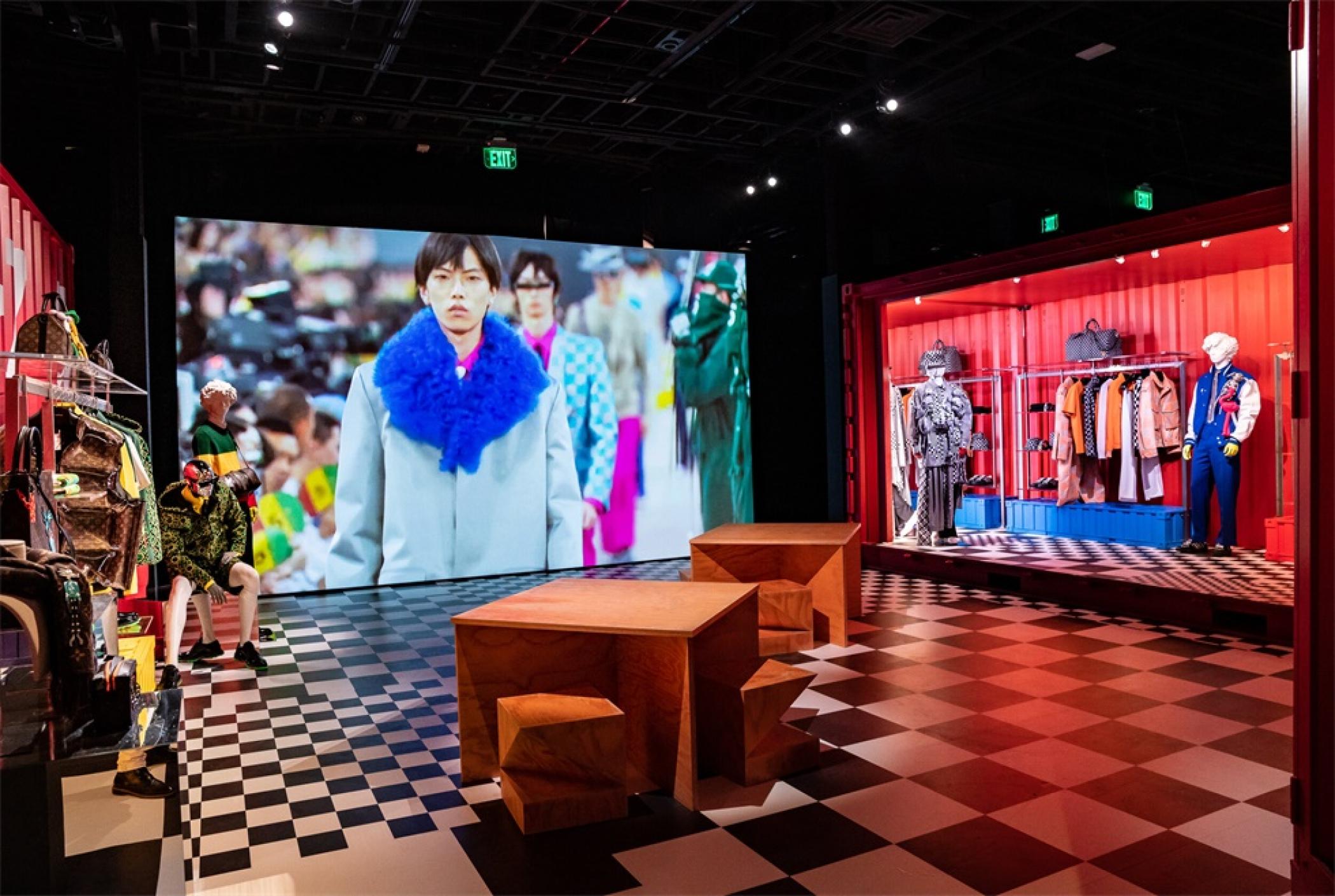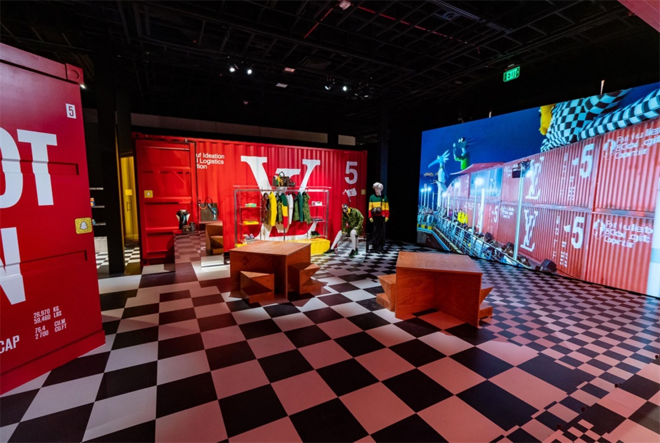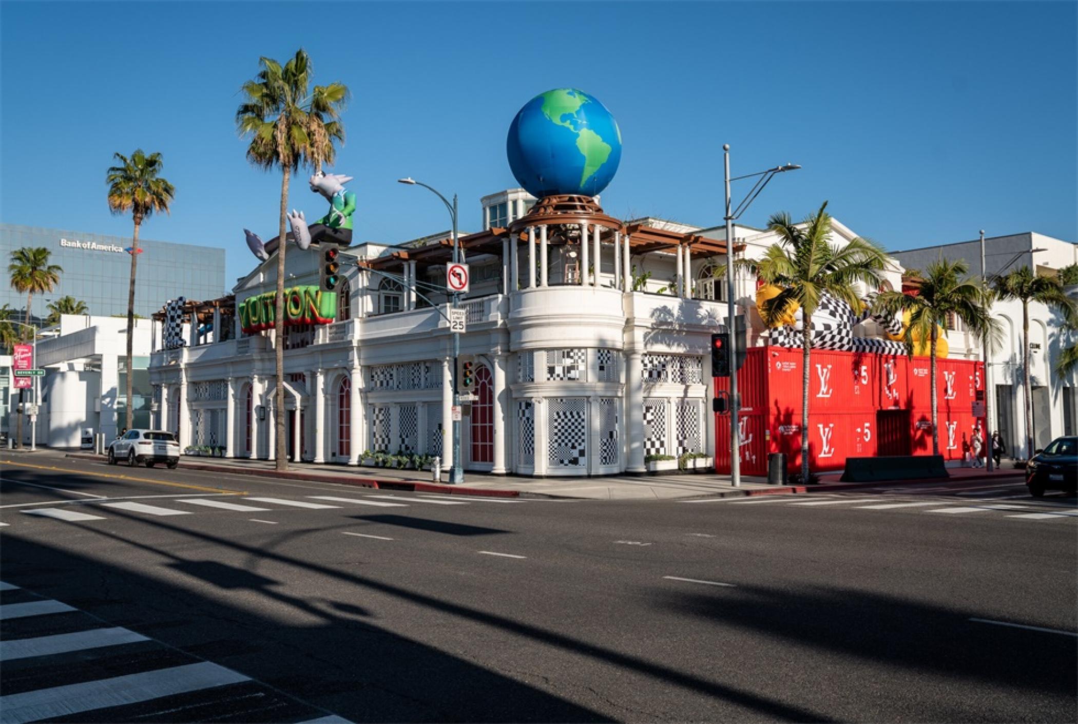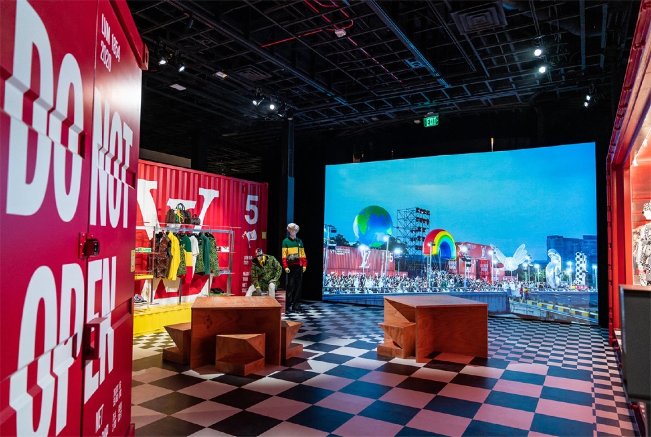 “路易.威登X”临时的艺术展示活动项目是在罗迪欧大道北端打造的一个必看的体验,吸引了大量人群和国际媒体。“路易.威登男人的临时居所”的活动时间更短,活动目的是展示路易威登2021年春夏男装系列,而装置的亮点是一个鲜红色的集装箱“入口”。集装箱主题延续在一层,作为1600平方英尺零售空间的背景,外部细节包括窗户玻璃贴和巨大的充气地球和卡通,这是整个项目的主题。