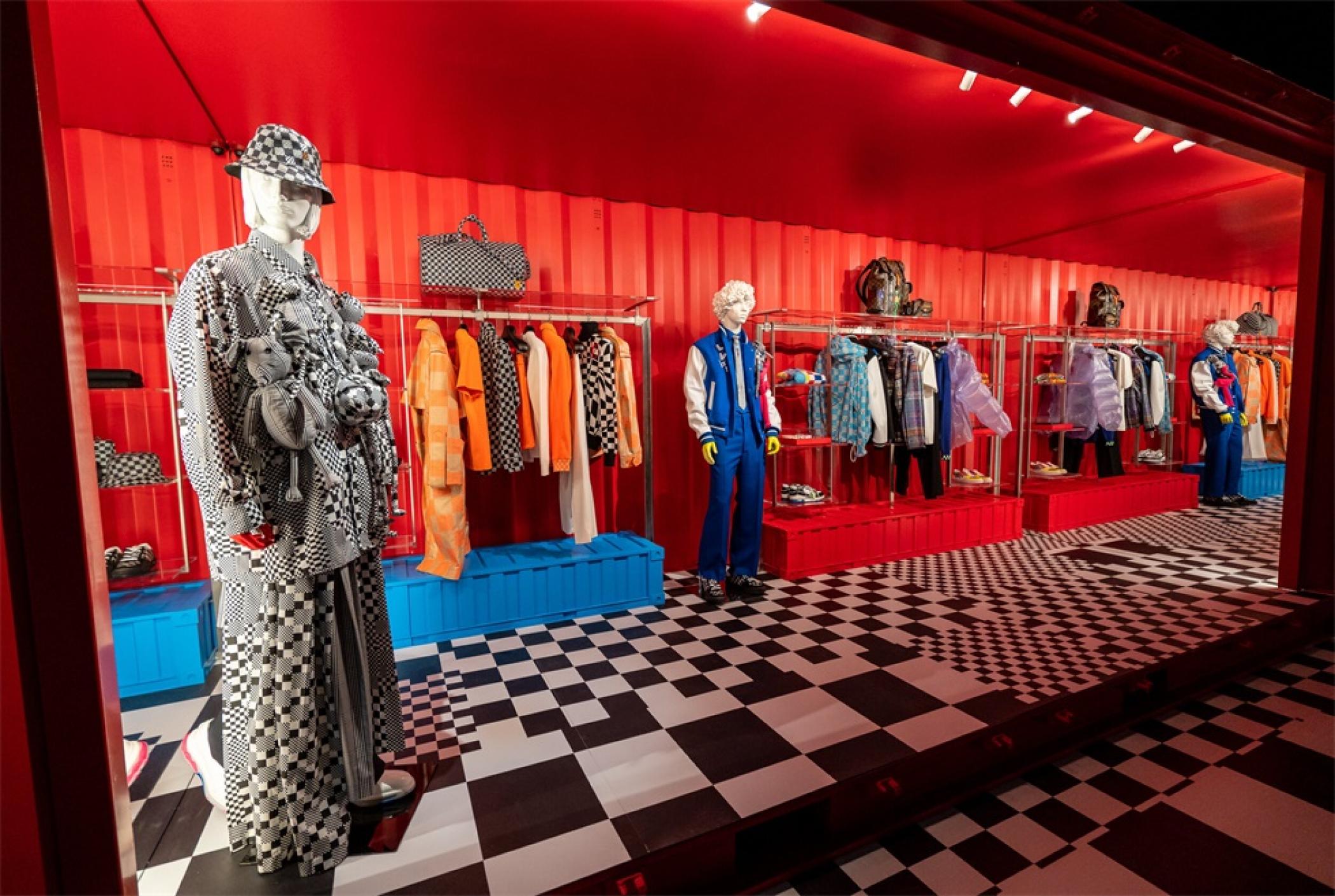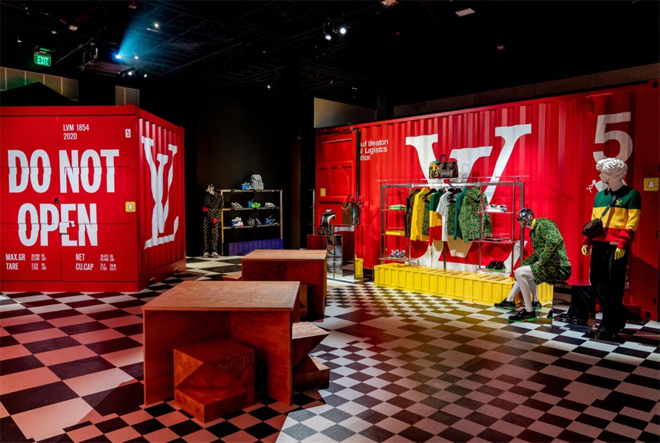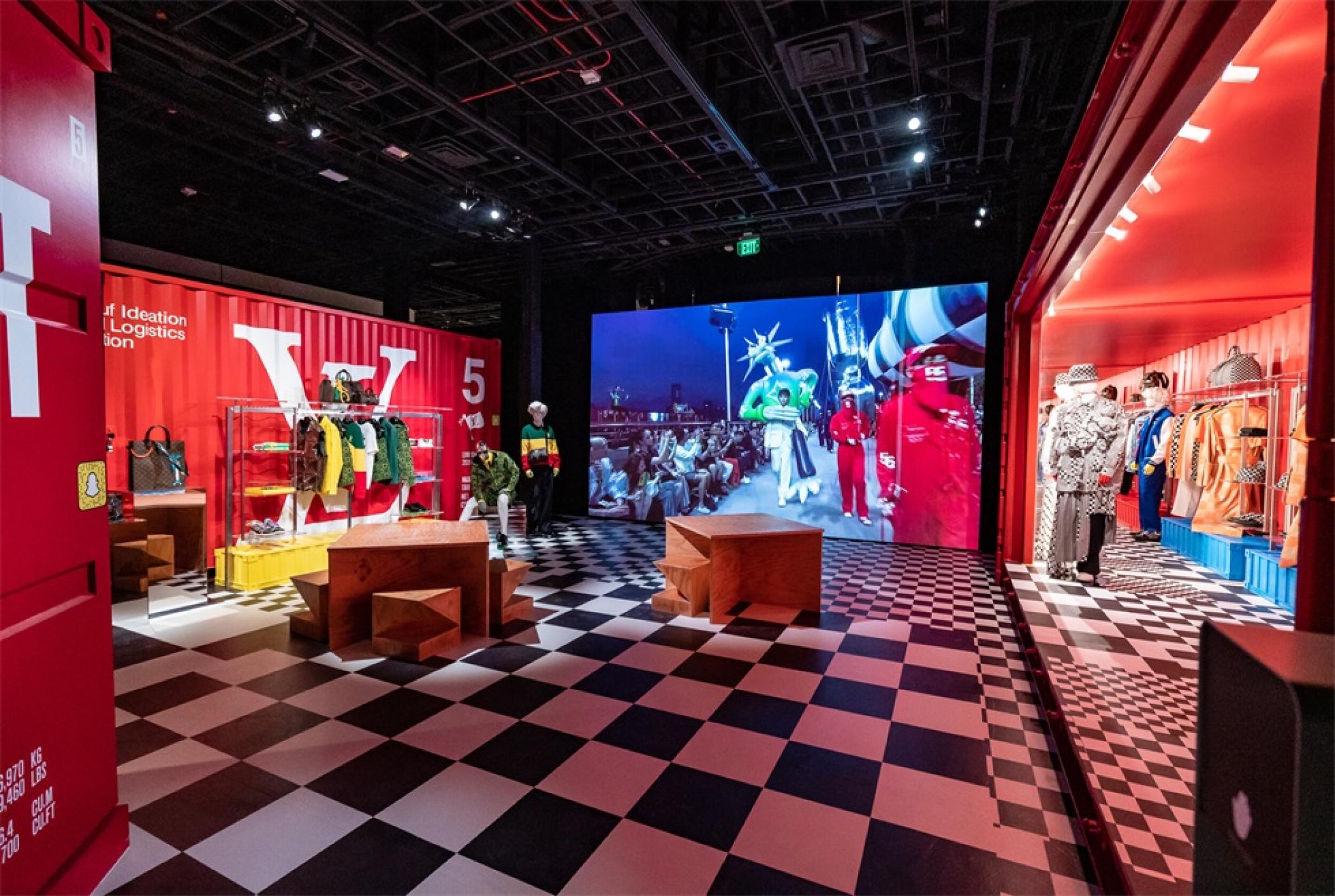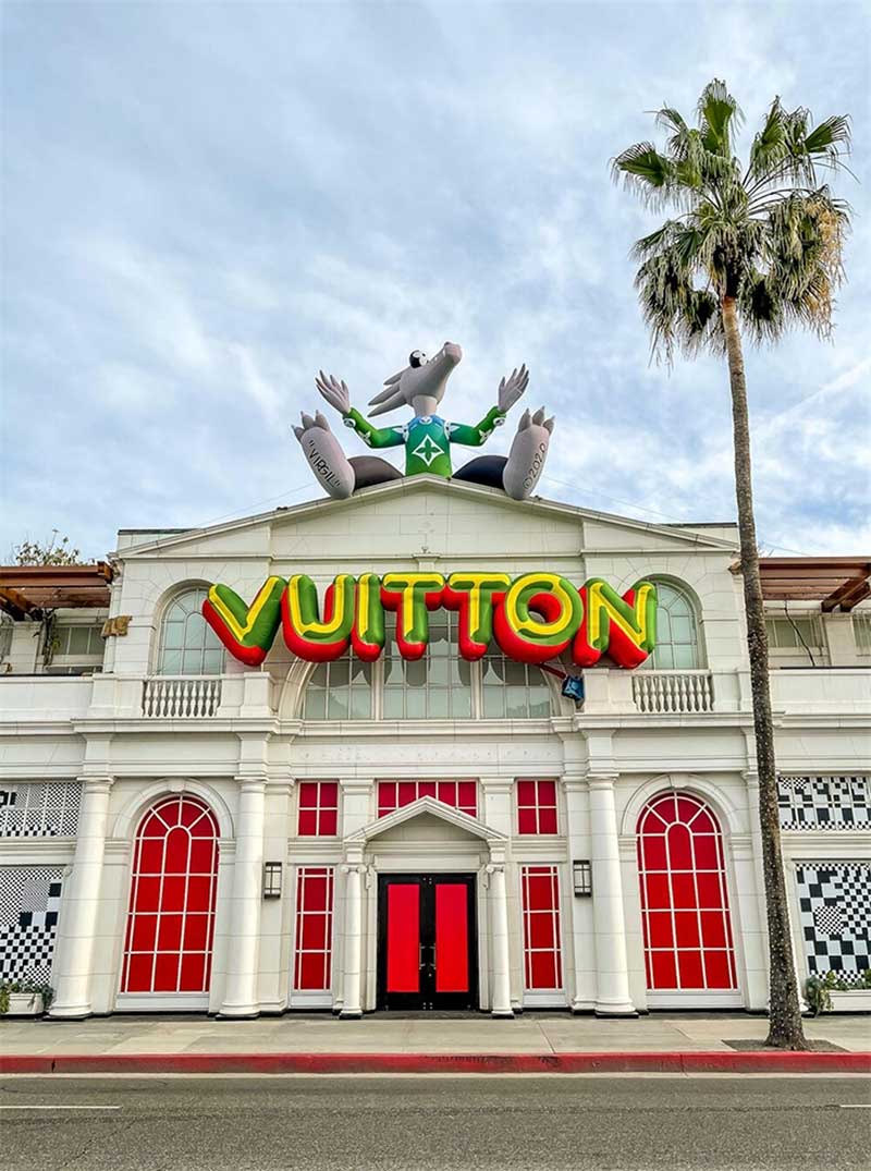 “路易.威登X”临时的艺术展示活动项目是在罗迪欧大道北端打造的一个必看的体验,吸引了大量人群和国际媒体。“路易.威登男人的临时居所”的活动时间更短,活动目的是展示路易威登2021年春夏男装系列,而装置的亮点是一个鲜红色的集装箱“入口”。集装箱主题延续在一层,作为1600平方英尺零售空间的背景,外部细节包括窗户玻璃贴和巨大的充气地球和卡通,这是整个项目的主题。