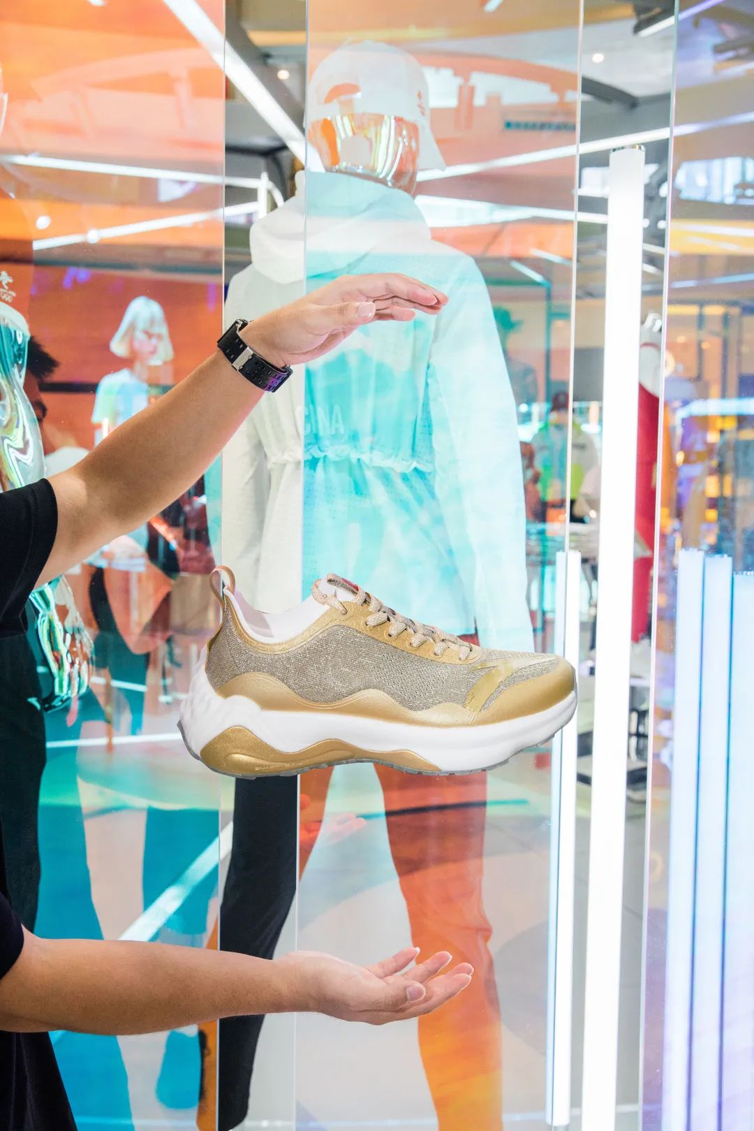 安踏冠军体验店简洁透明的圆形外观,完美的融合了五环的圆形结构,配上极具科技感的银白色调,极具赛场感,又不乏极致美学,整个空间的时尚度直接拉满。站在楼上俯瞰,极简的线条呈散射状走开,安踏的标志在圆环中异常醒目,超炫的科技空间,随便一拍都是绝美大片。呈包围态势的陈列格局,配上彩色的霓虹玻璃,令人眼前一亮,从服装到配件一一亮相,无论是国家队系列还是五环系列,各系列产品一览无余。