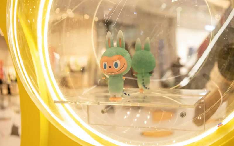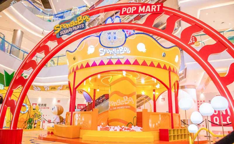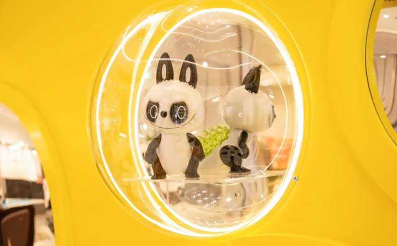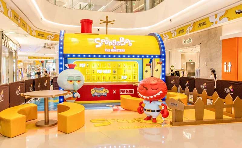 步入中庭就是大名鼎鼎的蟹蟹便利店啦,打卡怎么能放过这里呢。进入蟹蟹便利店内部,一整墙的SPONGEBOB X THE MONSTERS的玩偶瞬间吸睛,每一个都十分精致可爱。在蟹蟹便利店的背面,一左一右站立着我们店中的灵魂收银员“章鱼哥×SPOOKY”和视金钱如生命的“蟹老板×ZIMOMO”。侧面则作为展示区,不仅有4款SPONGEBOB X THE MONSTERS人物展示,周围还分布了大大小小的哈哈镜,看到自己扭扭歪歪的身体,搞怪模样瞬间冲散所有不开心。小小便利店,处处都有新发现!