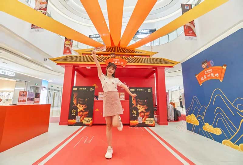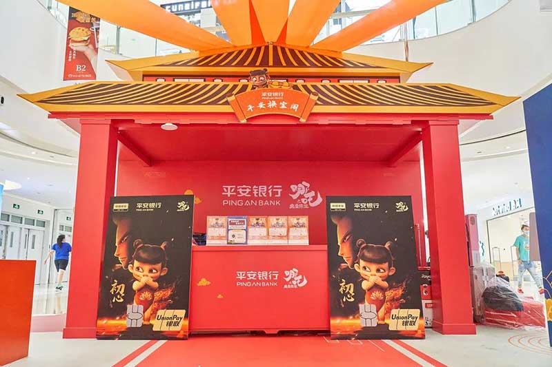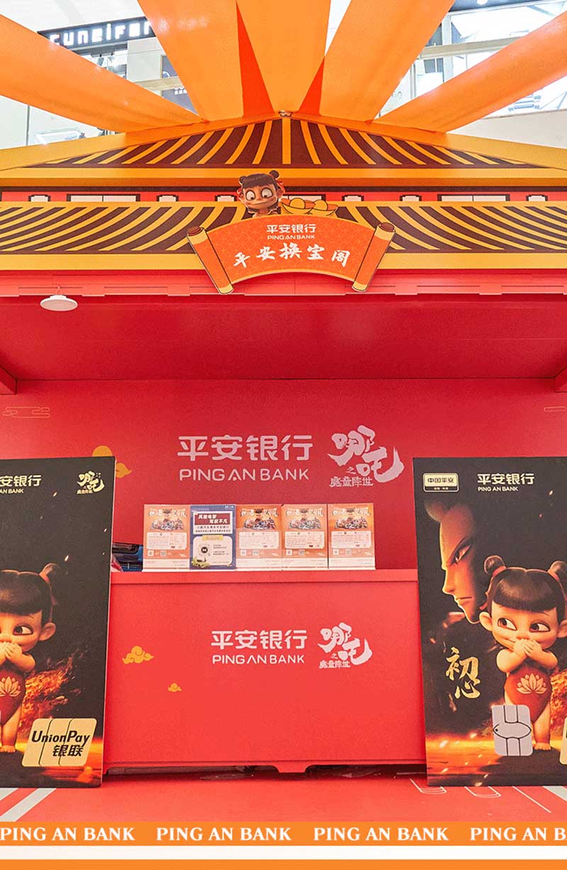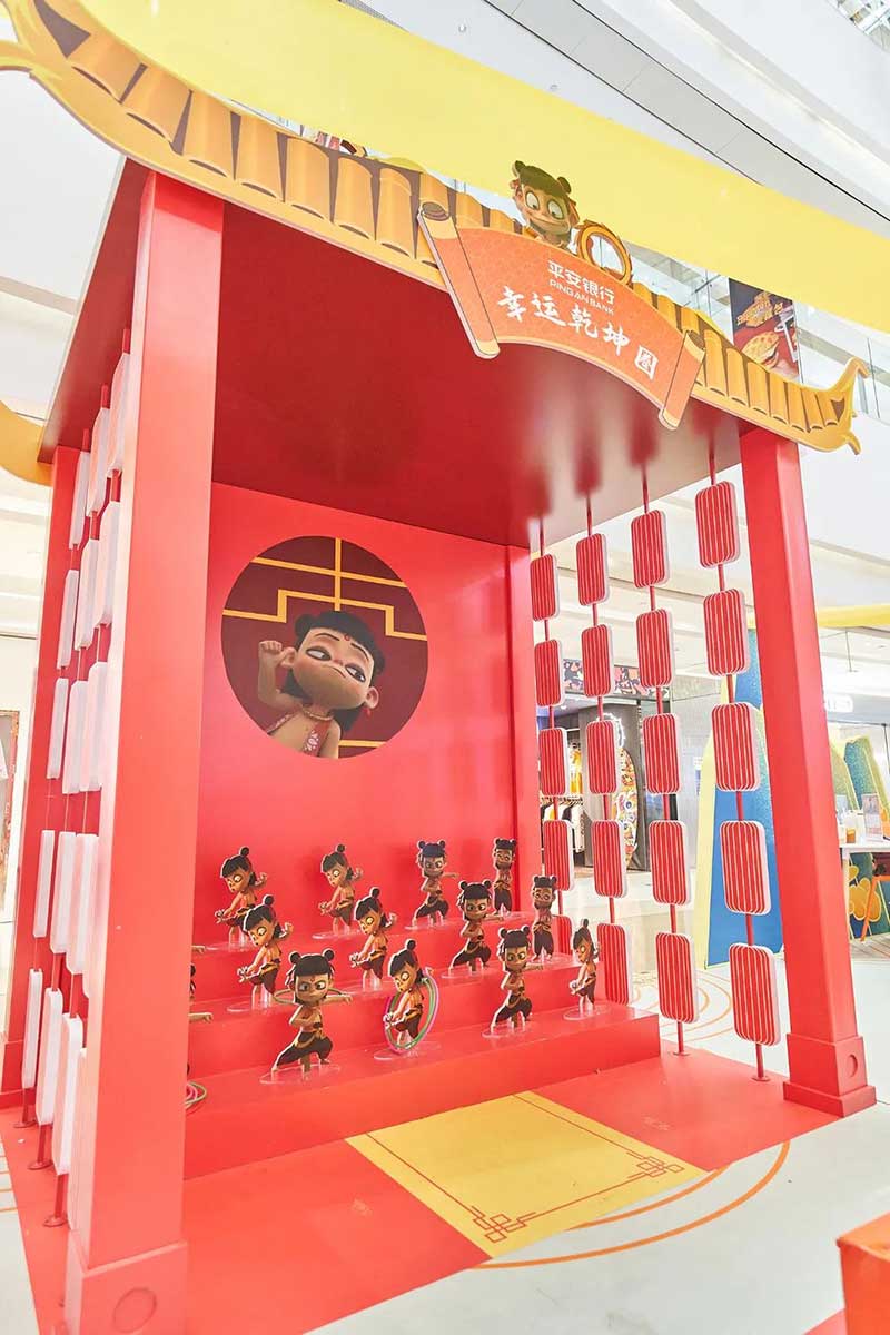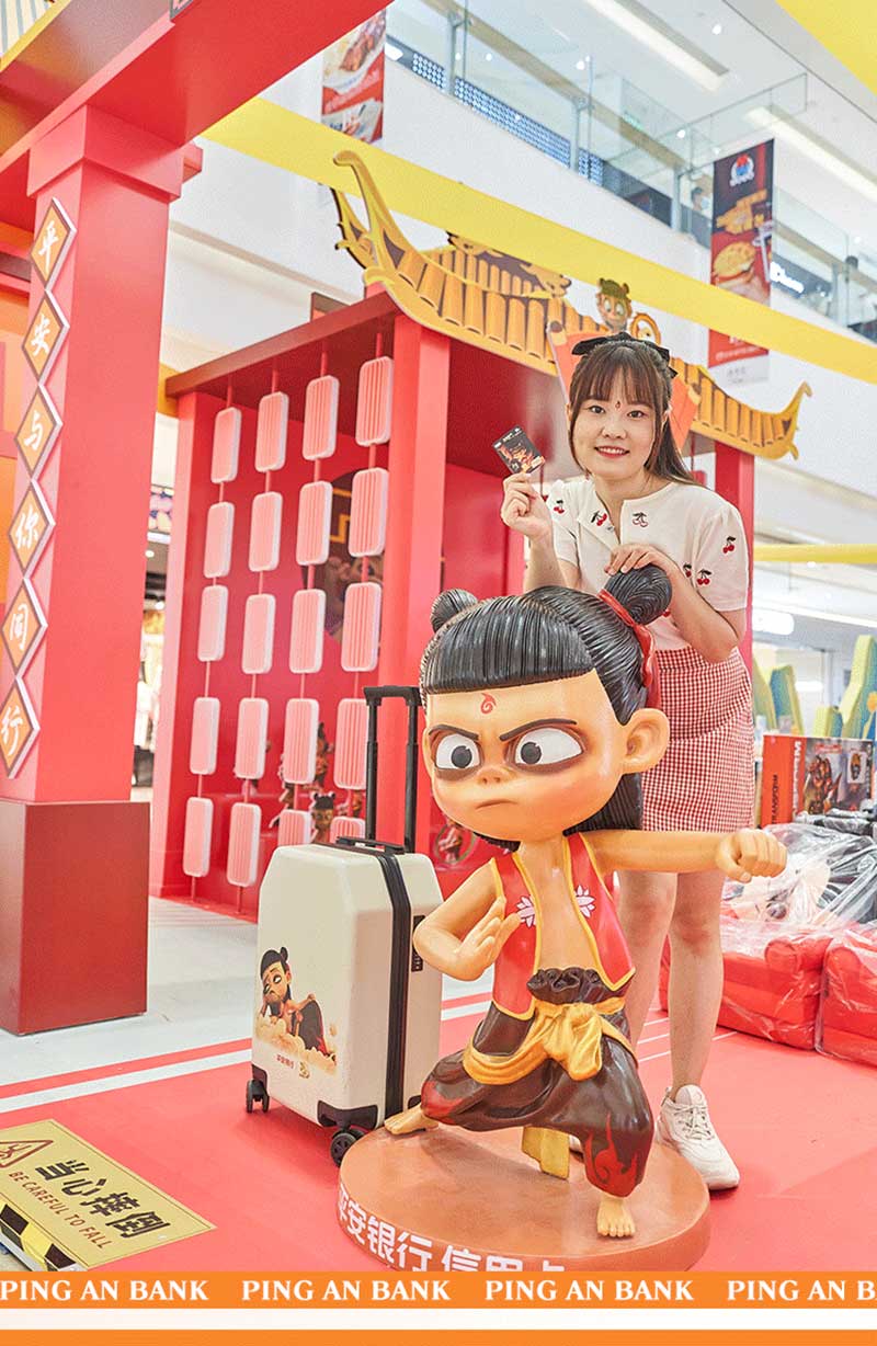 这次活动和平安银行信用卡天生燃力,“我命由我不由天”,自带bgm魔童哪吒又带来哪些惊喜,快来感受一下燃炸的氛围。走进合生汇B2层就能看到一座红色平安城,古风式的建筑造型,喜庆的红色,门口伫立着激萌的哪吒大头像,仿佛瞬间来到了陈塘关。展馆有很多有趣的打卡点,哪吒套圈游戏,考验你手感的时刻到了,手持“乾坤圈”快来把淘气的哪吒套住,路过的大人小孩都可以免费玩,体验快乐放松心情。今天除了哪吒娘、敖丙,你也可以跟哪吒来一场踢毽子友谊赛,旋转踢、交替踢,比拼次数和难度,非常适合当强身锻炼的运动,快来试试吧。