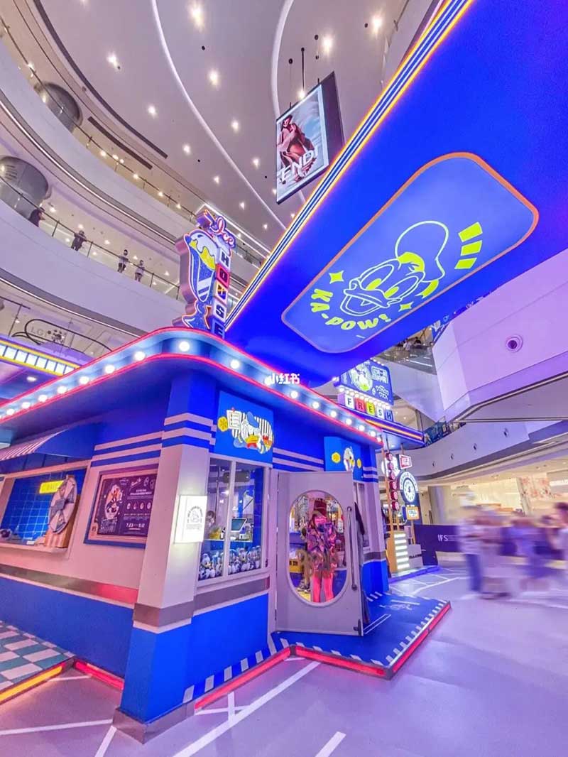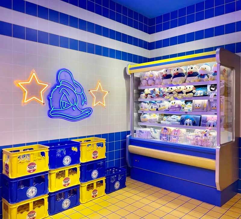 刨冰主题展内则呈现出不同的色彩冲击。蓝黄色的格纹撞色搭配,与霓虹灯图案鲜明呼应,极具年代感的墙面、地砖等细节满满的醒目视觉设计,传递出新潮艺术风格。店内极具主题个性的冰柜主题陈列柜内,独一无二的唐老鸭主题面粉袋、铝罐、汽水罐等主题摆件皆在其中,这些时下火爆的鸭鸭产品正是营造氛围的不二利器,每个角落都激发达人凹造型拍片欲望,是城中网红达人必打卡的潮流热点,独家定制风格与创意艺术的融合,带来全新的体验氛围。