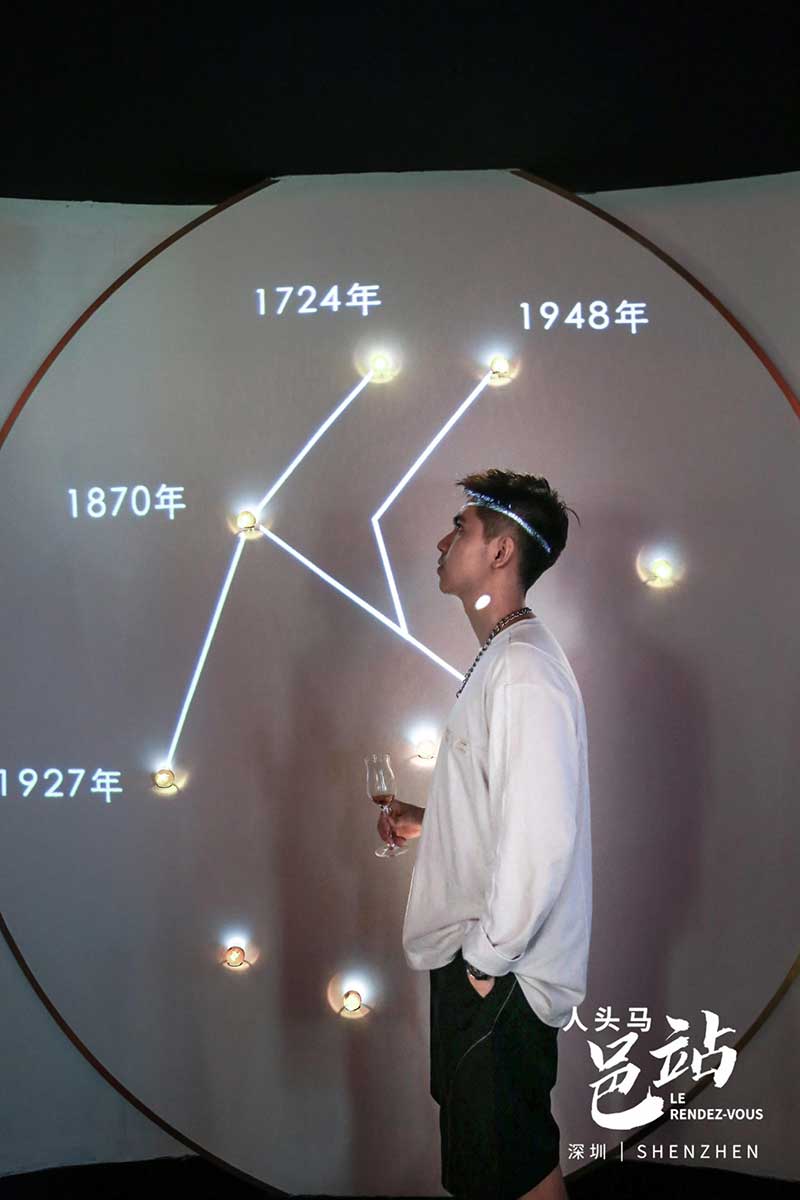 在拍摄区域内,来宾可以挑选自己心仪的人头马专属场景作为背景,在人头马邑站里拍下旅途剪影;也可在小程序里“探索人头马宇宙”并解锁星光,触摸人头马传承近三百年的精彩故事。当所有星星被点亮时,来宾还能亲手将星星连结,绘制专属的人马星座,并获得一滴“生命之水”。