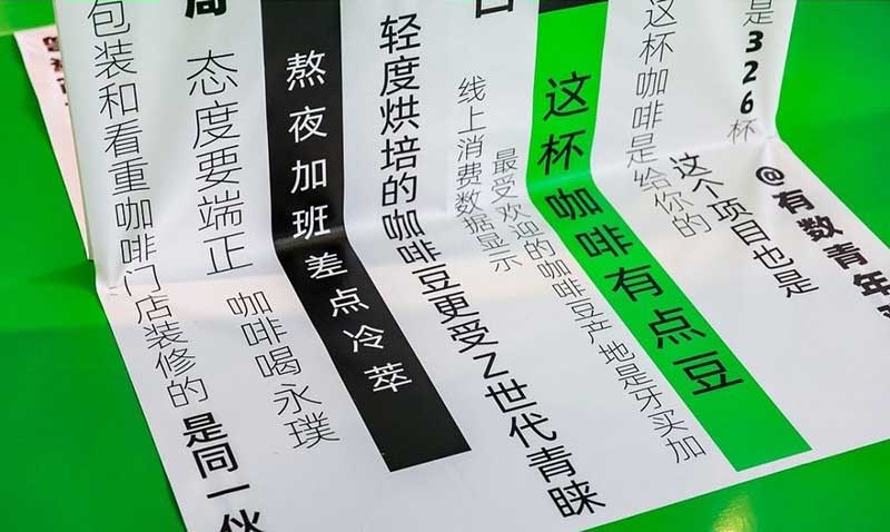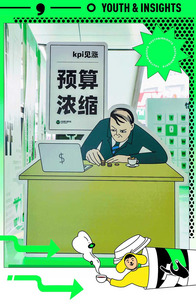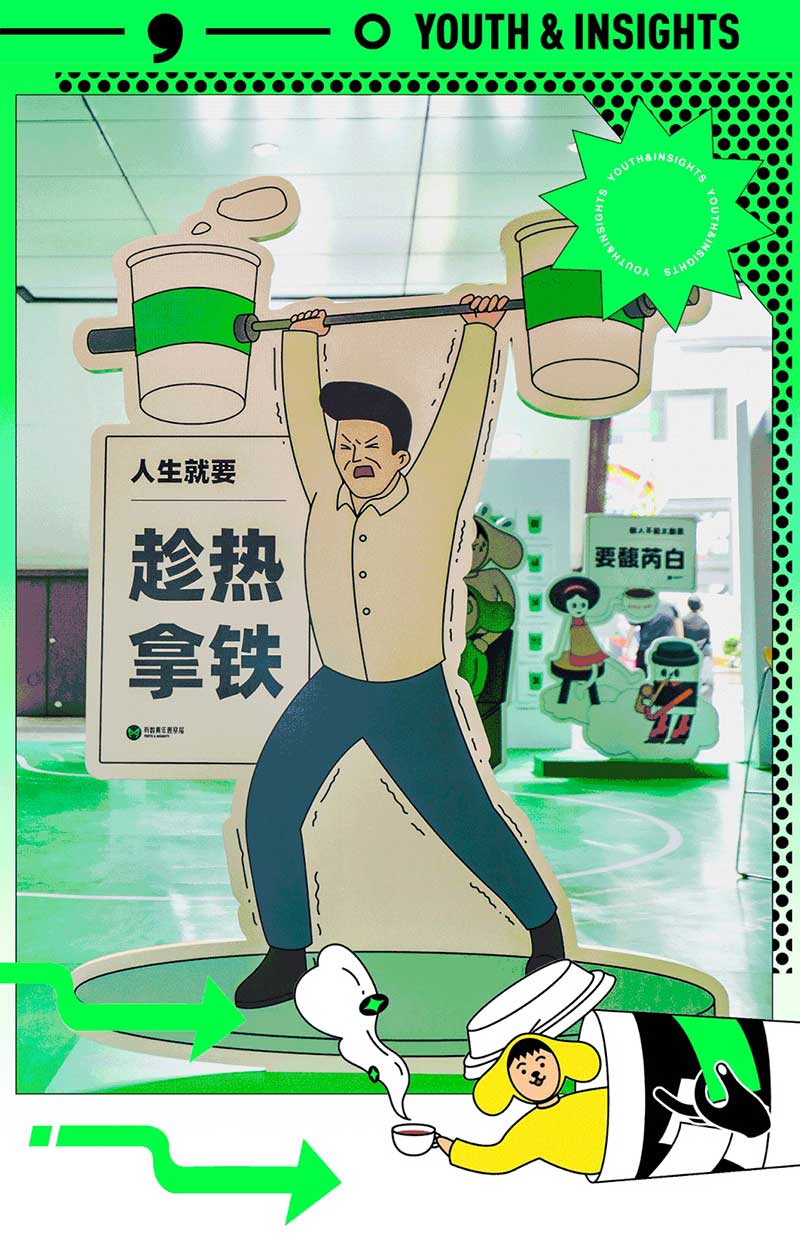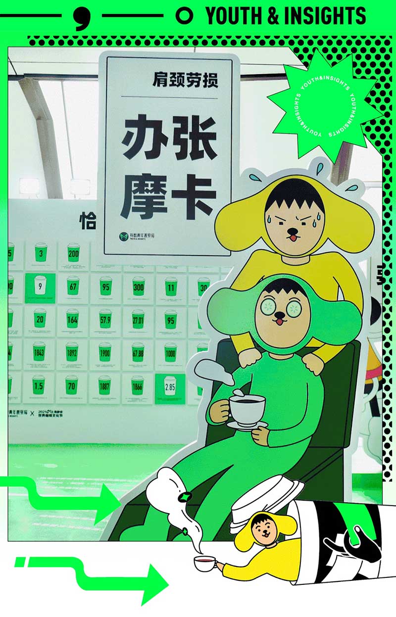 活动现场,有数青年观察局的线下快闪店和沉浸式展览成为整个咖啡节上最热门的打卡点之一,手持咖啡的爱好者和行业从业者们纷纷与趣味谐音梗立牌拍照,并聚集在展览前分享学习咖啡文化的冷知识。“差点冷萃“的橘老师、“趁热拿铁“的张伟、”预算浓缩“的老板、”办张摩卡“的狗东狗西……这些以往只存在条漫里的IP形象,在有数青年观察局举办的线下沉浸式咖啡展览中,成为咖啡节上最亮眼的打卡点。