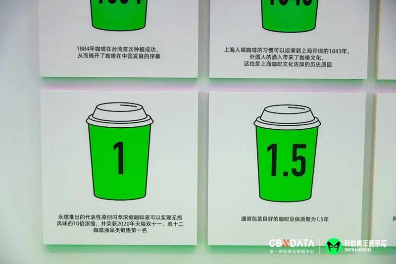 有数青年观察局还在展览上专门设置了咖啡文化冷知识创意墙,近百条咖啡冷知识以咖啡杯的视觉形式进行展出,既增加了观众逛展时的打卡欲望,也让观众在逛展的过程中,对咖啡文化有进一步的了解,无形中推进了咖啡文化的进一步普及。