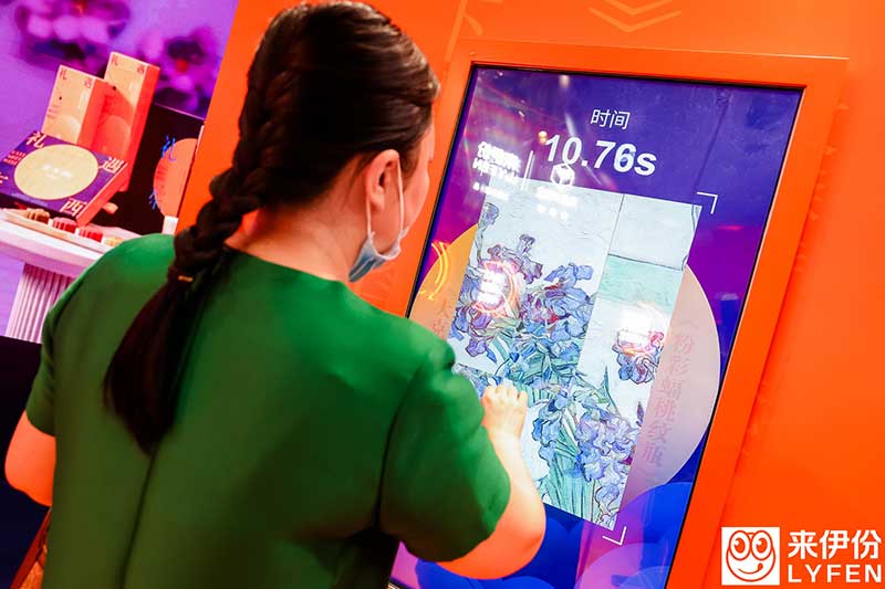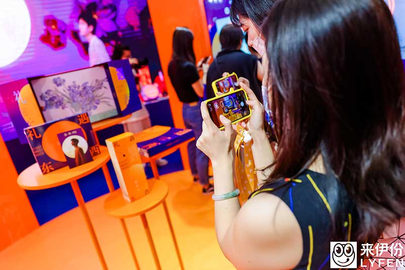 整个快闪店分为四大板块章节,首先是“关注新鲜”板块,在进入场地之前,打开手机现场扫码关注来伊份天猫官方旗舰店,20元天猫优惠券直接送上,收下这份见面礼之后,新鲜之旅正式开启;接下来便是第二板块“幸运月饼”,来到打卡点许下今秋愿望,幸运随着月饼而降临,打卡成功就可以获得“王一博中秋限定明信片”一张;第三关是“中秋灯谜”板块,猜灯谜可以说是中华儿女的专项技能,选择自己要挑战的灯谜,答题成功便可再次获得一款“王一博中秋限定明信片”,另外在灯谜的背面还有独家的馆藏图鉴,东西艺术之美,在此交融呈现;最终章节,“礼遇圆满”板块,参与拼图游戏,就有机会获得“王一博中秋限定海报一张”,全程打卡完毕,可以说是收获满满了。