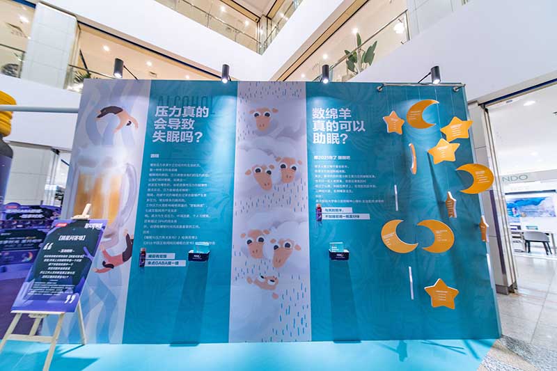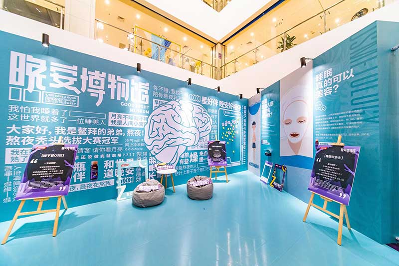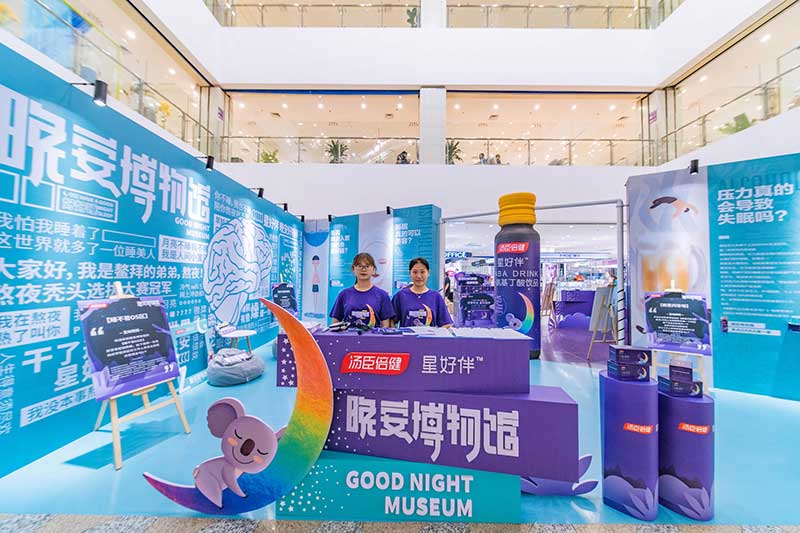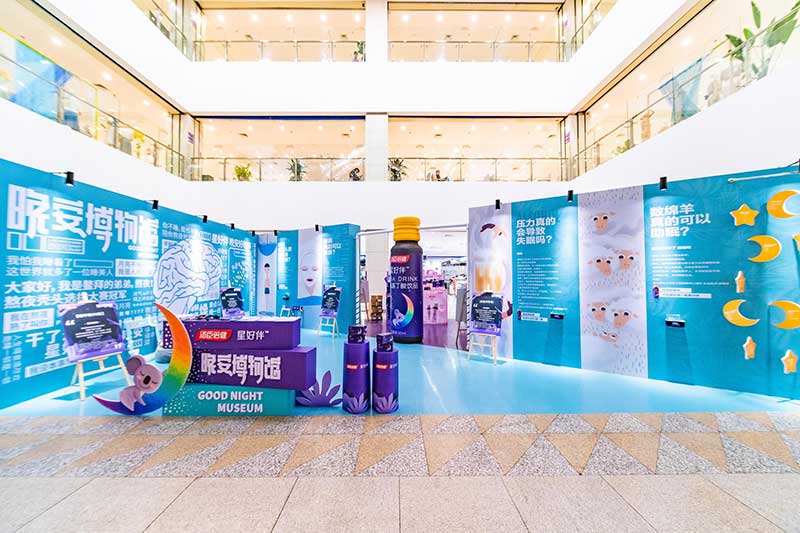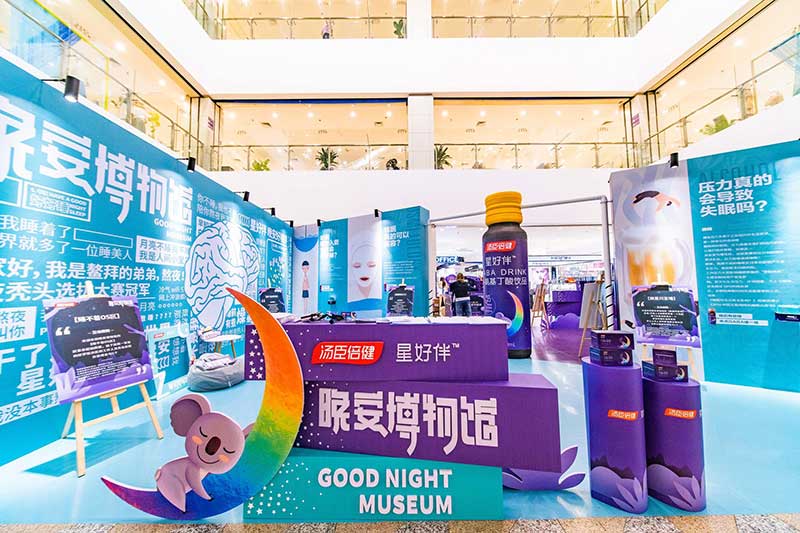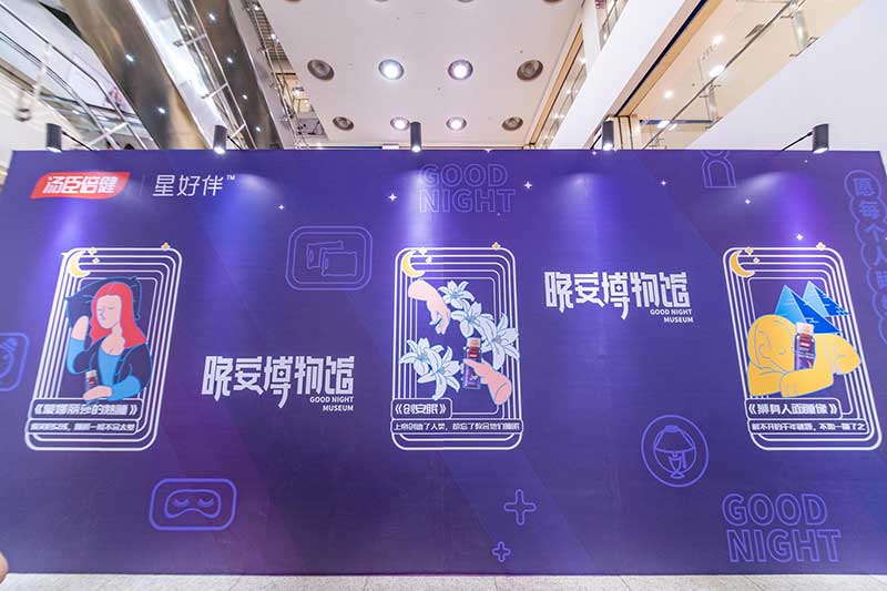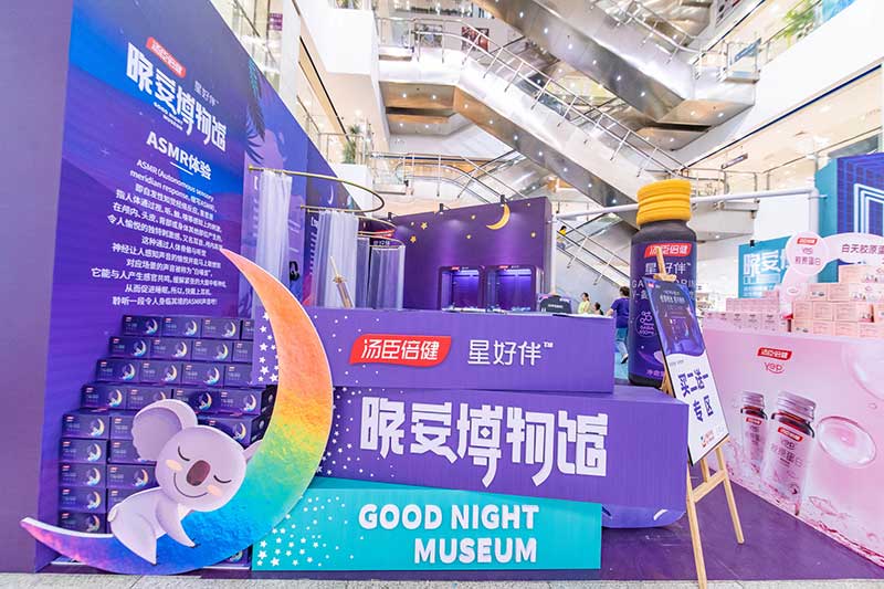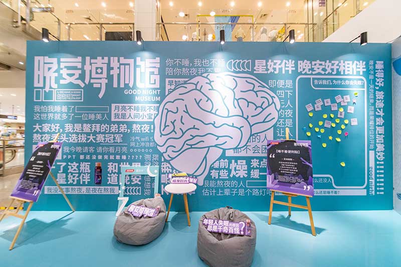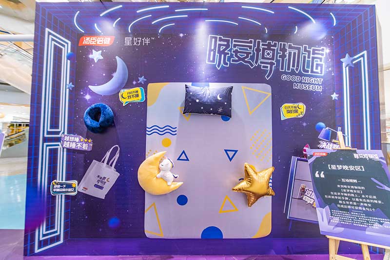 汤臣倍健通过晚安博物馆,带来全新睡眠产品星好伴GABA饮品,为年轻人的“养眠”大计添砖加瓦。晚安博物馆的C位出道,以抓马的设计、走心的内容、深刻的内涵吸引了一批又一批的顾客前来围观。店内共设置了7个互动打卡空间:“睡不着OS”的趣味弹幕墙让人深有共鸣;“睡不着便利贴”让人看了直呼世另我;“睡眠冷知识”和“摘星问答墙”的睡眠知识让人不停“涨姿势”;“ASMR体验区”带来的颅内高潮向用户打开新世界的大门;用“好梦扭蛋机”扭出各种助眠好礼;“星梦晚安区”主题拍照打卡搞怪又可爱。
