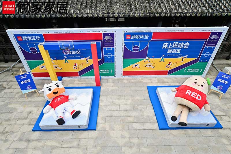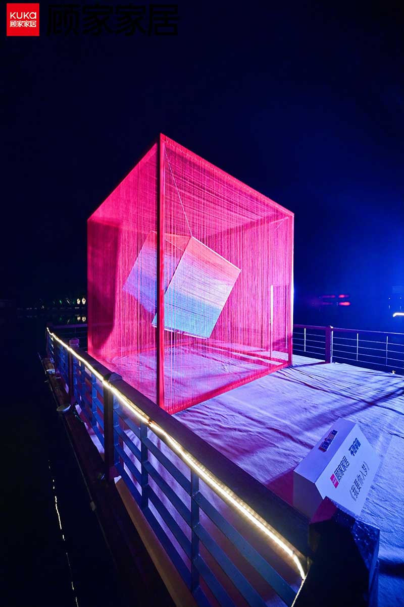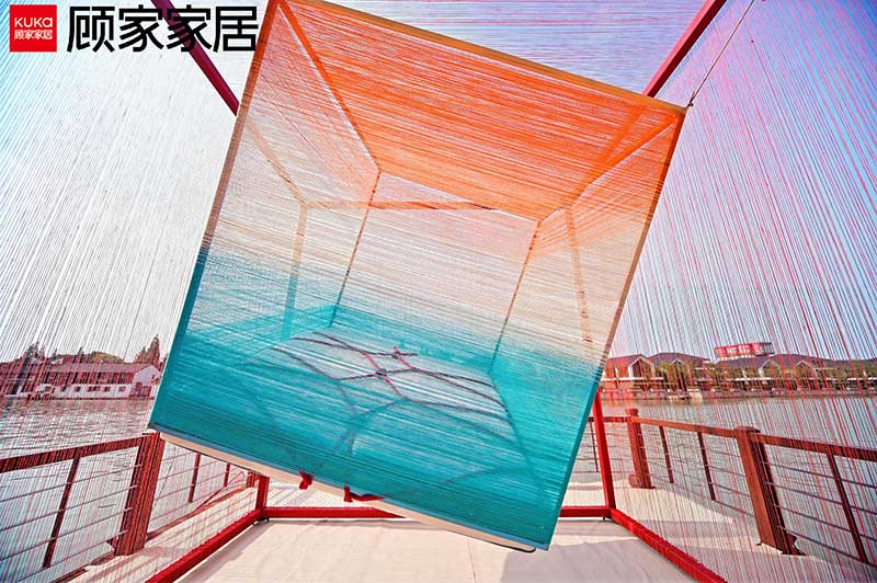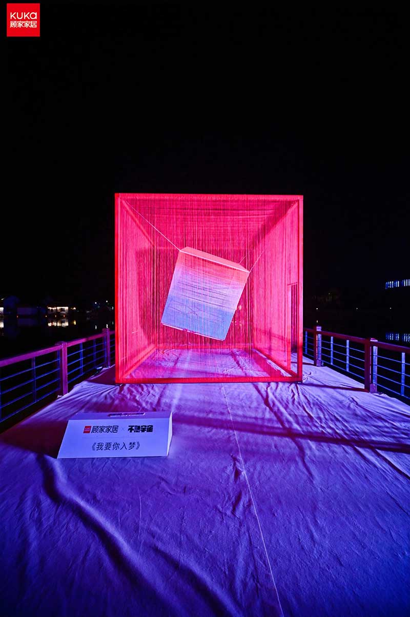 格外值得注意的是,此次亮相朱家角不急宇宙的“我要你入梦”深睡box,是不急宇宙的5位主创连同工人,连续工作一周,用40万米长的红色鱼线排布而成。不急宇宙认为,家是对于通感的追逐,情绪、环境、个体之间相互影响、变化,向往的家才得以由此进化。以巨大数量级隐喻神经元,以艺术装置还原大脑在进入深睡状态时的脑电波,顾家家居携手杭州亚运会,为其专属打造的顾家亚运深睡垫,仿佛一个控制中枢,通过交叉缠绕的丝线,将深度睡眠的因子传送至每一个神经元。线条合围的世界里,家、个体、宇宙,甚至多维空间,被以通感的形式来强调。红线密集交织成了一个正方体,好像无尽的时空,带给人格外震撼的视觉体验。