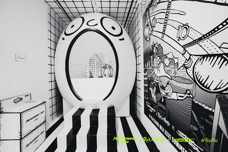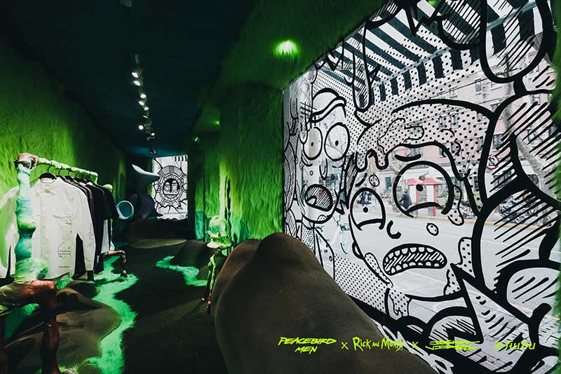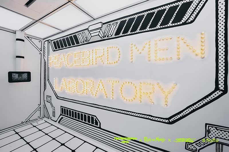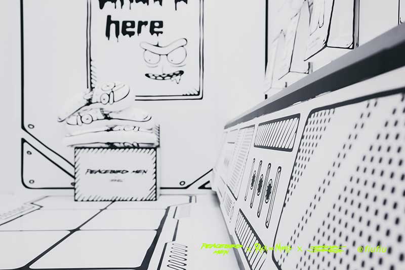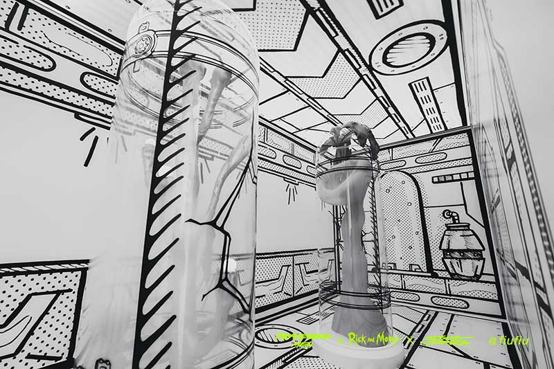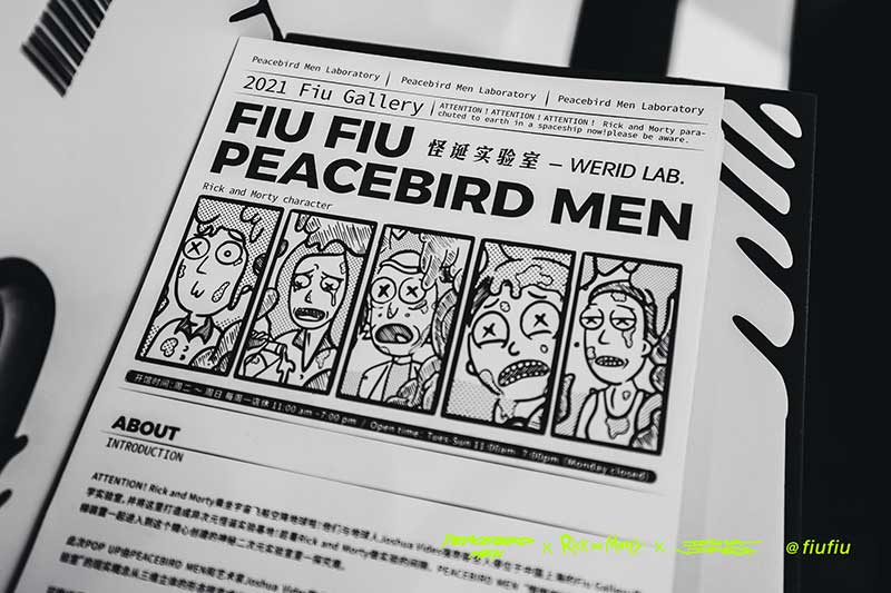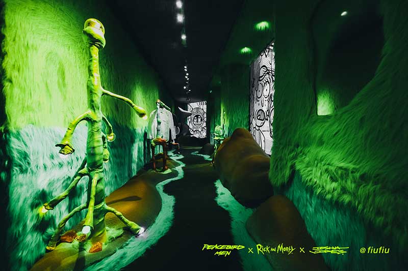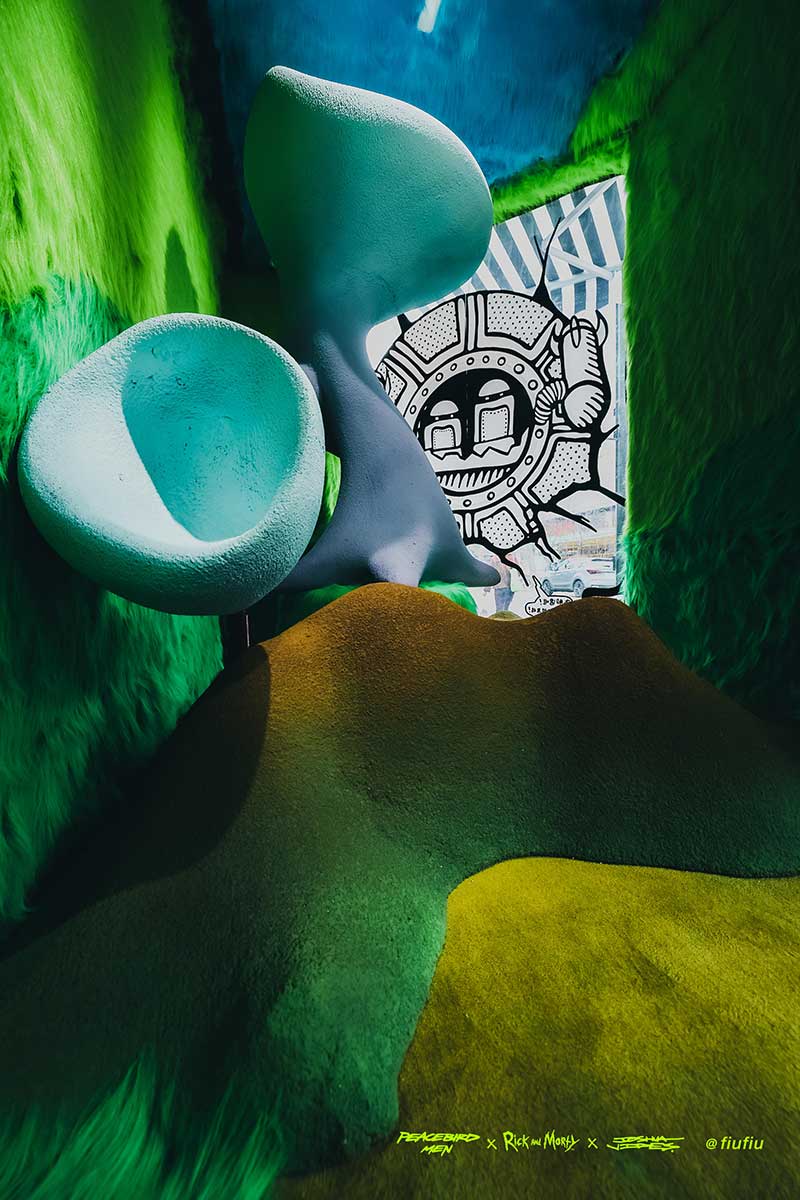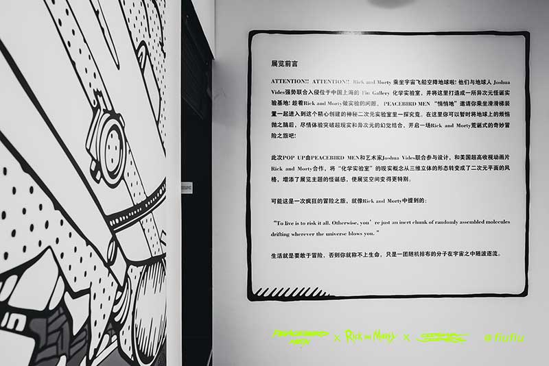 Peacebird man 和 视觉艺术家Joshua Vides强势联合Rick and morty打造异次元世界 ——瑞克和莫蒂#怪诞实验室#,位于地球魔都的[Fiu Gallery]由3D世界直接被切换成2D,场馆变成了化学实验室,向地球人类发送探险信号速来开启一段荒诞之旅!