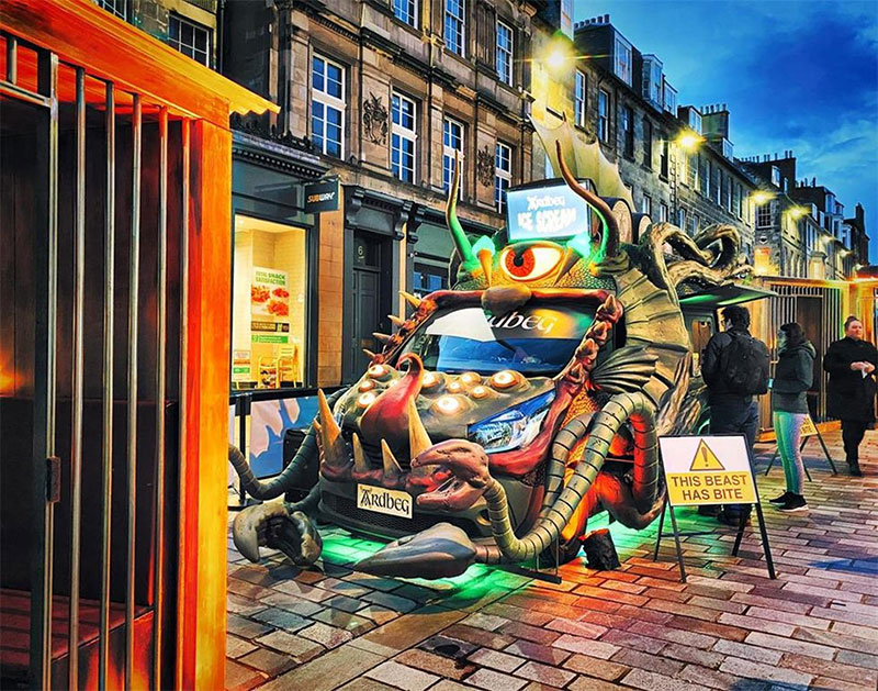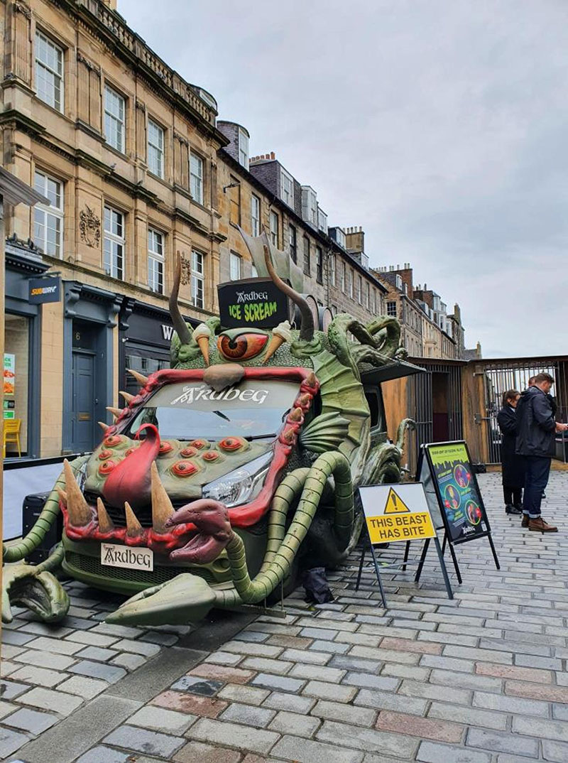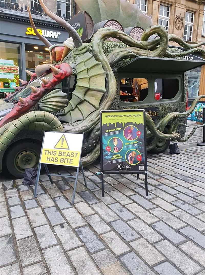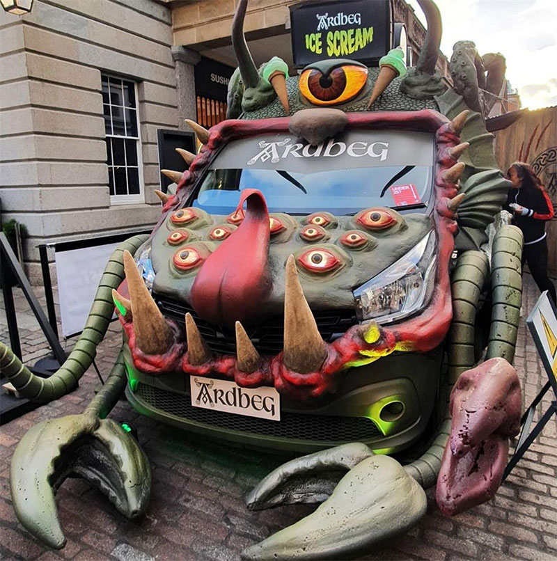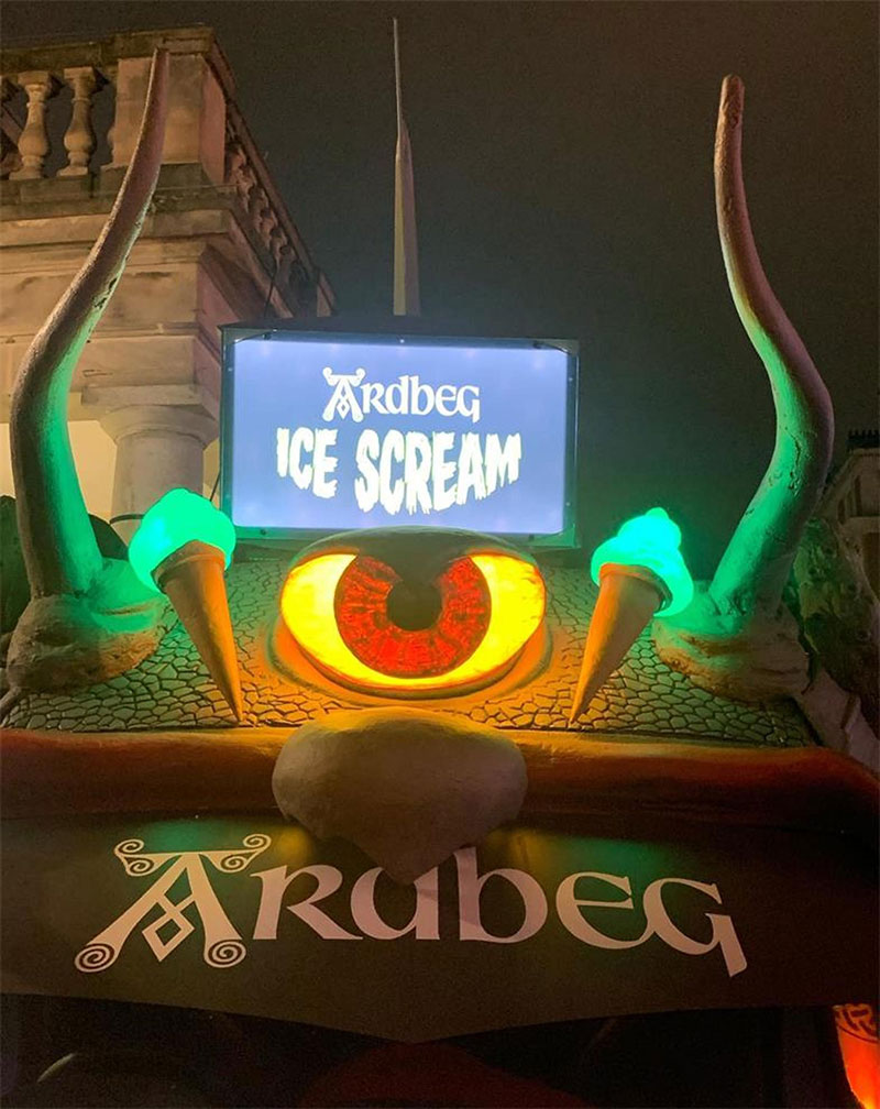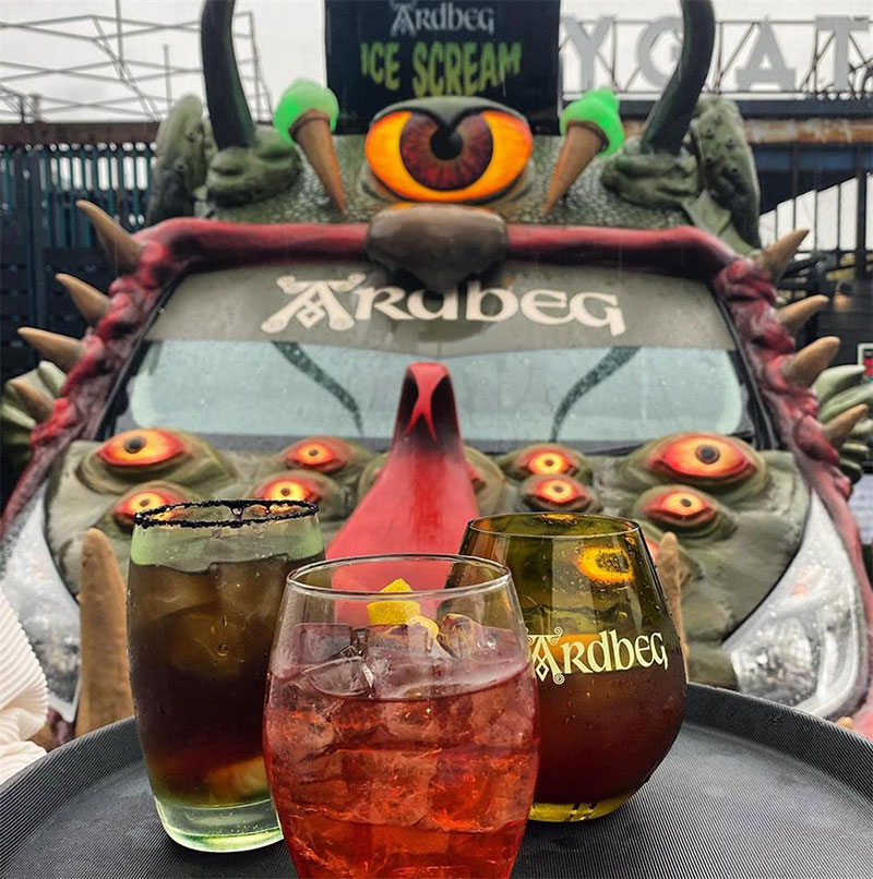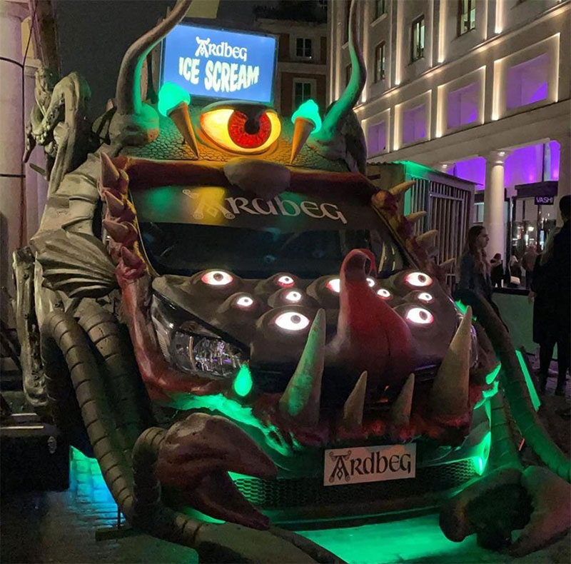 Ardbeg与英国著名的冰淇淋店Ruby Violet合作设计了三款冰淇淋,每款分别加入了Ardbeg三种烟熏味最浓的单一麦芽威士忌(Ardbeg 10 年陈酿、An Oa 和 Wee Beastie),冰冷的棘手的冰淇淋都带有邪恶的泥炭味。这辆货车将配备一个“烟雾怪物”笼子,品牌将在那里举办可预订的45分钟鸡尾酒品尝会。在里面,会员们将享用鸡尾酒,包括用威士忌和可乐制成的烟熏茶“樱桃唇膏”,草本和巧克力味的“Begroni”,以及用 Ardbeg 十年陈酿制成的“新时尚”。