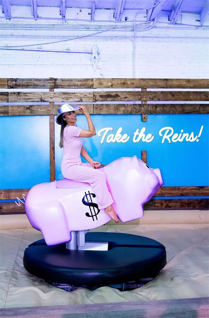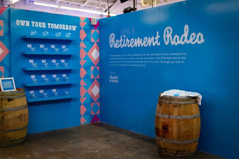 当客人进入洛杉矶的体验现场,品牌大使将首先鼓励他们开始与品牌的Stacks Cards进行财务对话,在我们的Stacks Beacons学习他们的财务健康水平,并在我们五颜六色的签到区拍几张照片。签到进入后,客人们进入了债务拳击馆,这是一个互动空间,帮助他们释放财务困扰,并学习如何处理特定类型的债务。在感觉自己像一个债务冠军后,客人将进入了“现金淋浴”区,在这里将强化了财务健康是这场活动的重要部分。现场的第三个区域是与嘉信理财合作的“退休牛仔竞技会”。客人们骑着一个特制的机械储蓄罐,体验股市是如何狂飙的,当你坚持的时间越长,你的表现就越好。
