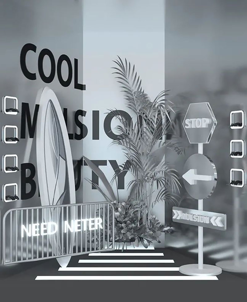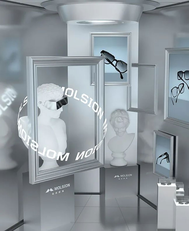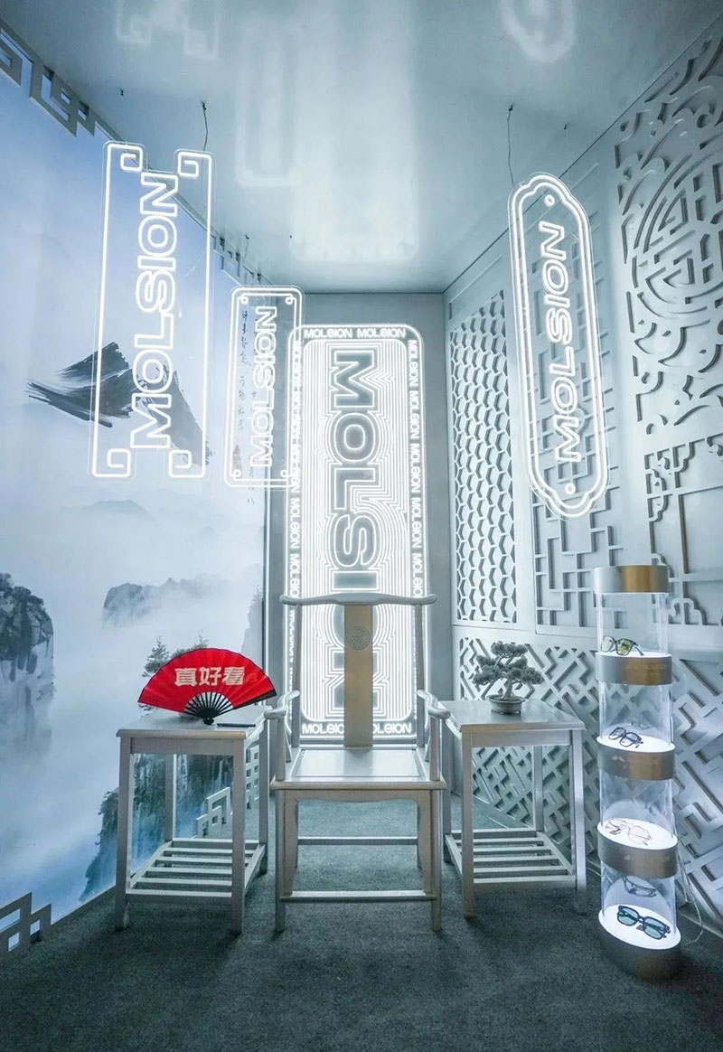 同样是眼镜品牌类目的快闪项目,陌森的这场设计相对简单,设计图和现场效果图对比,每一个场景都是为了拍照打卡而生。饭圈的粉丝流量让这个项目收获了很多线上传播的热度。