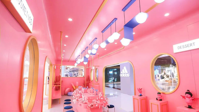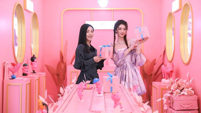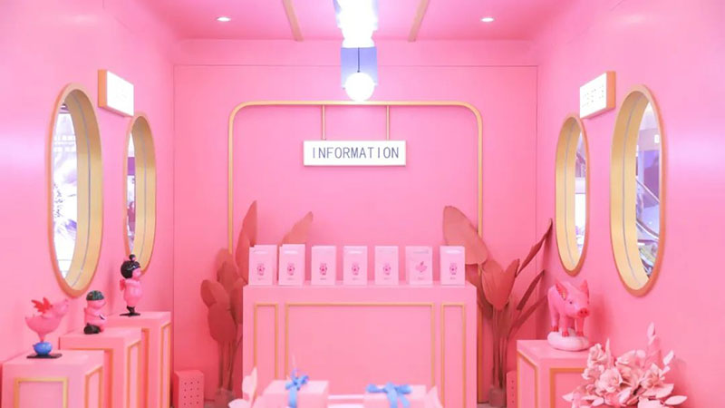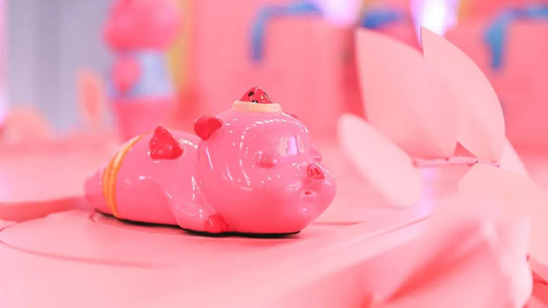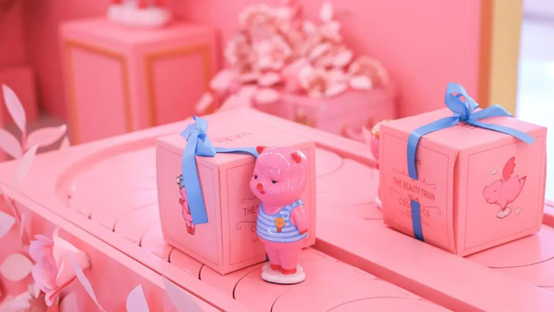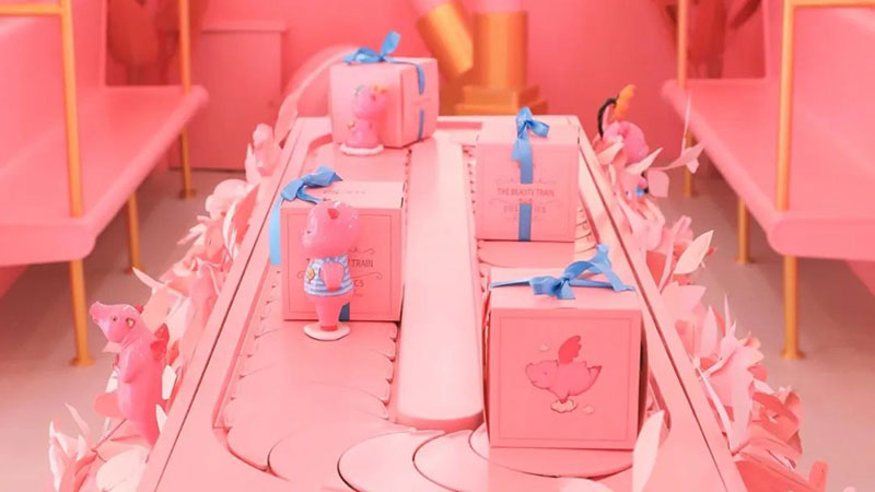 本次美妆节将美妆与美食趣味融合,结合当代年轻人对美有多面追求的特点,从「春色环游列车」到“人间系列”雕塑艺术作品,整体采用治愈温暖的粉色调,展示出春日里少女心满满的幸福感,打造时尚潮流的艺术氛围。一只只憨态可掬的粉色小猪,构成了一条通往幸福的道路。充满着可爱与治愈的粉色被赋予在艺术品与车厢之上,向人们传达幸福的多重含义,为生活带来无限可能。