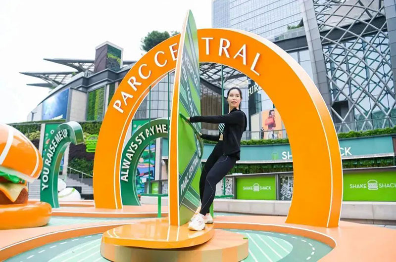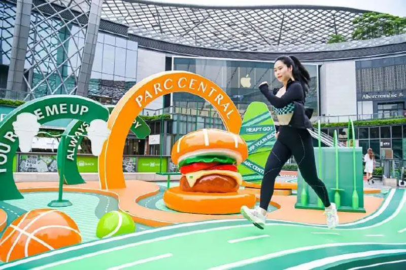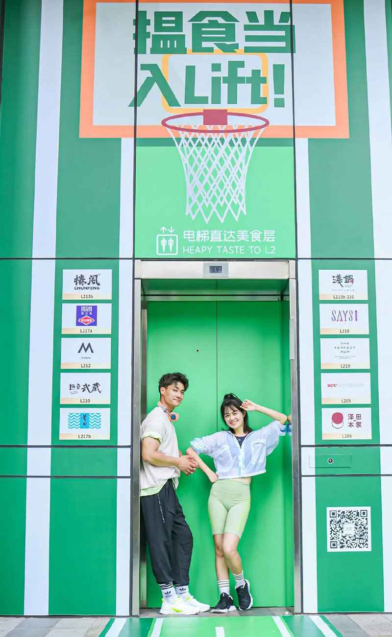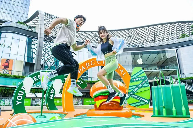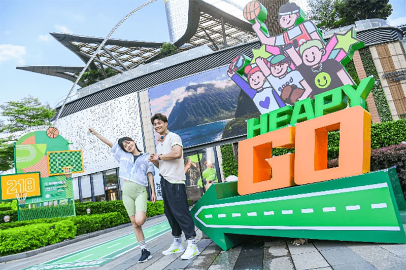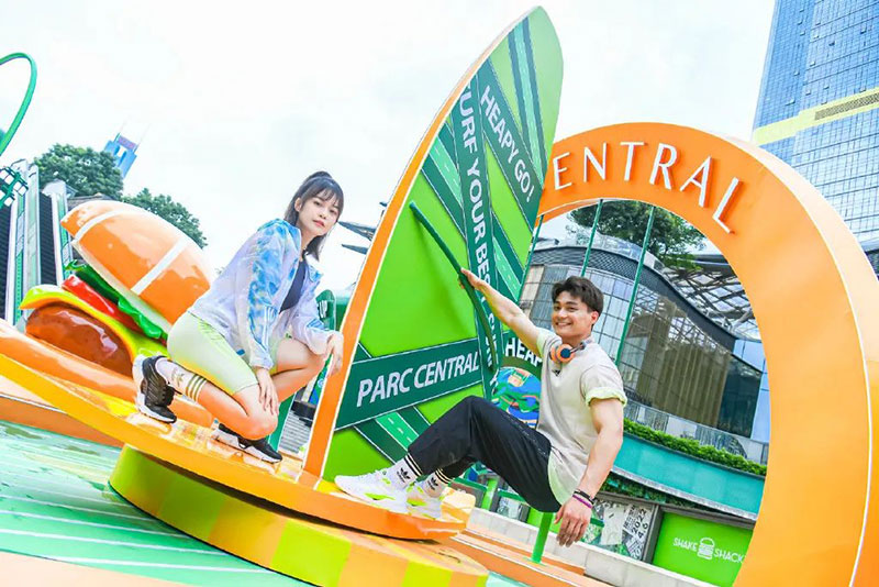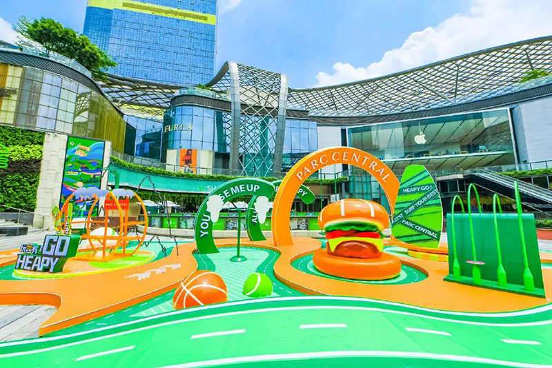 广州天环广场运用了独特的开放式花园环境的优势,打造了首条全球商业空间超1公里的绿色“玩食”跑道,以此打破了休闲娱乐的时空限制,创造出了前所未有的社交新体验。以天环Parc Central L1北广场为起点,亮绿色专业级塑胶跑道从室外到室内一路延展,沿途还伴随着有趣的粤式标语。来到天环Parc Central B1户外广场,HEAPY型动主场设有专业起伏滑板道,穿梭于多个潮玩运动打卡点,缆车、滑板、杠铃、风帆和飞盘等设施让人们体验到最新潮社交游戏的魅力。室内还有2个“冻”感十足的小舞台,B2层「CHILL浪一夏」充满阳光活力,还有L2层「机“冻”蛋治」的玩食机械臂,让人们随时随地感受到绿色运动的魅力,瞬间提升心身愉悦感。