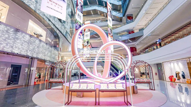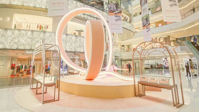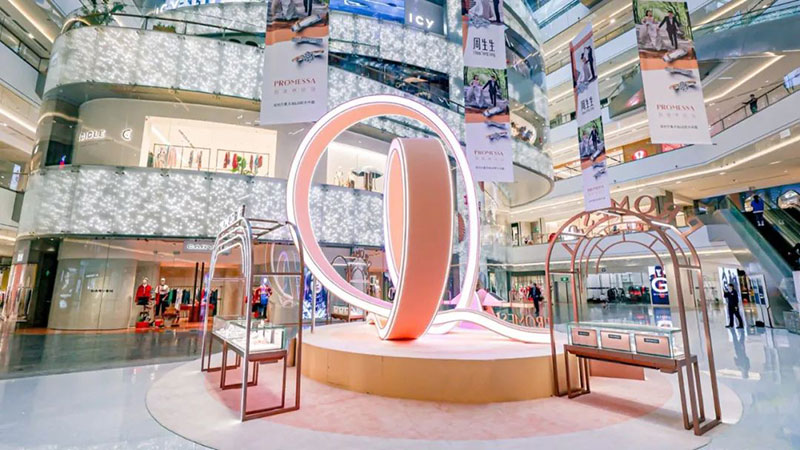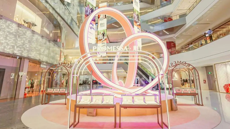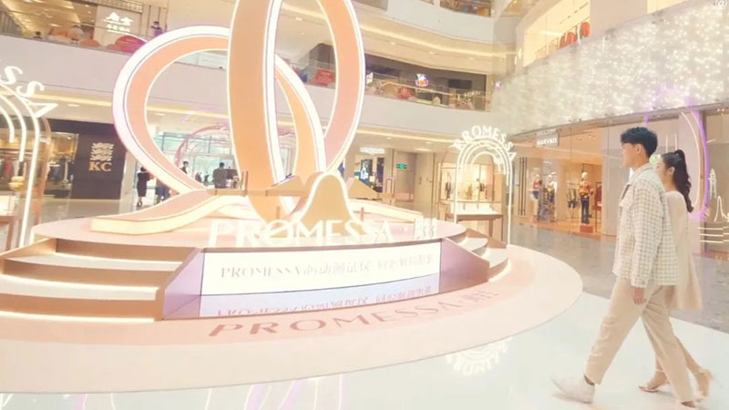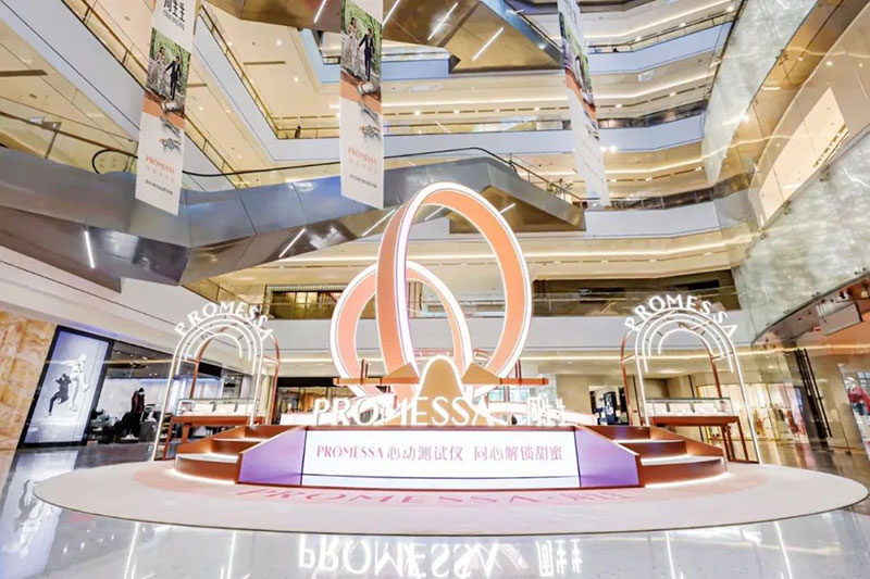 在周生生PROMESSA甜度体验馆整个快闪空间,以月老红绳造型打造巨型同心结装置——#Promessa# 心动测试仪,体验者坐上跷跷板即可知道彼此间的心动信号。快闪空间在设计上通过把代表爱情的心型的巨大化,达到吸引体验者的目的。