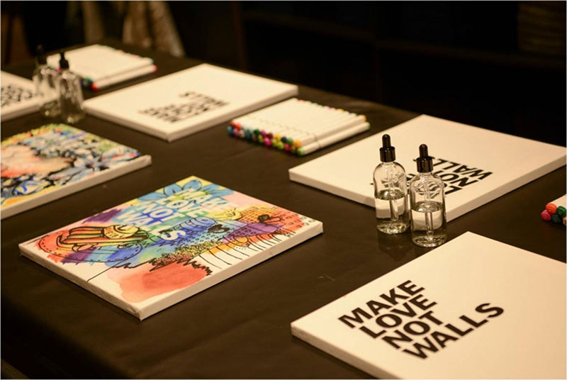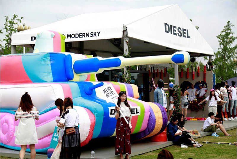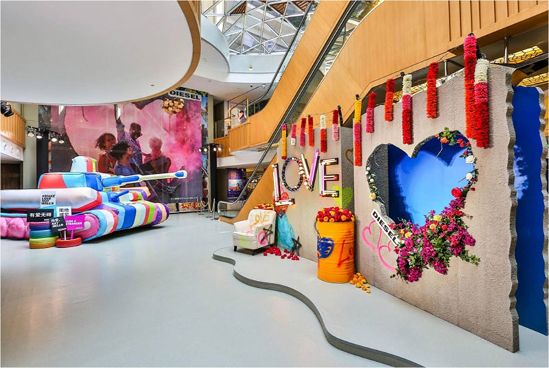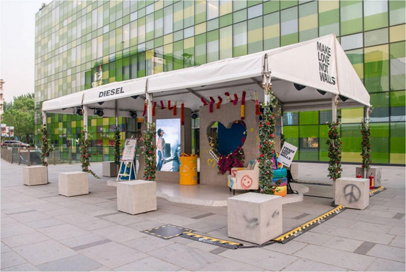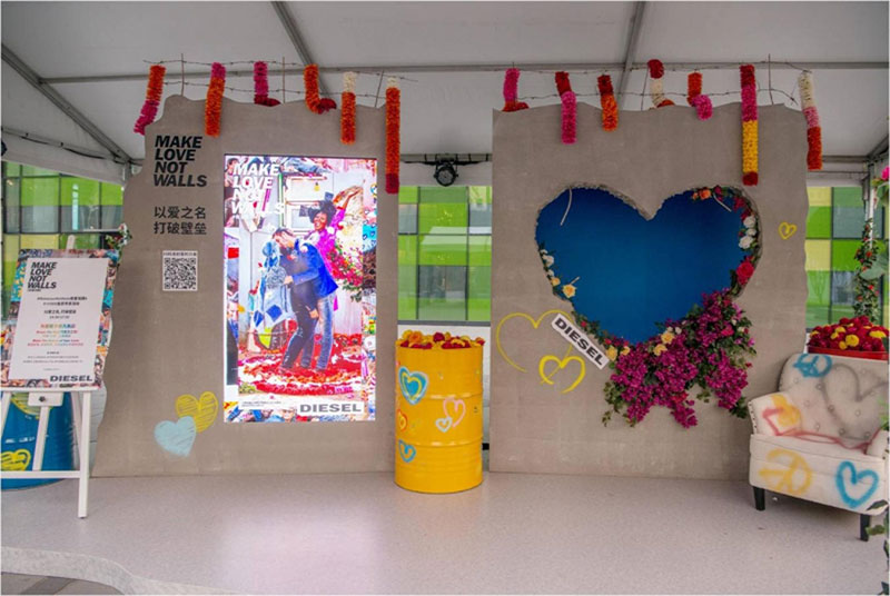 DIESEL把“墙”作为隔阂与束缚的象征,爱的“心墙”也将平等人权与世界的多样性分离。另一端的绚烂未来在召唤我们前行,积蓄足够的爱才能破墙而出。DIESEL以爱为名的七彩坦克打破壁垒,“爱心之路”随之而生,让分离与仇恨变成鲜花铺满的幸福之地,爱与自由,肆意宣扬。当墙裂,当有爱无碍,触手可及着理想社会:没有阶级的区别对待、不因为缺陷遭到嘲讽、所有的爱都予以祝福。活动中鼓励客人在墙面上表达自己对时事的创意宣言,一个五彩缤纷的充气坦克占据了其中一间客房。