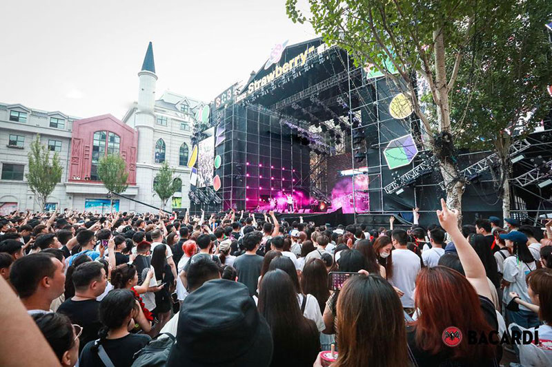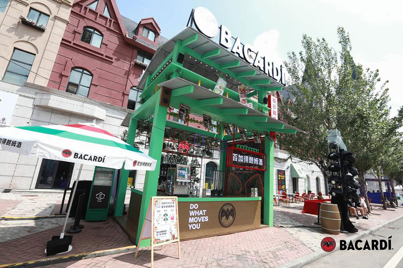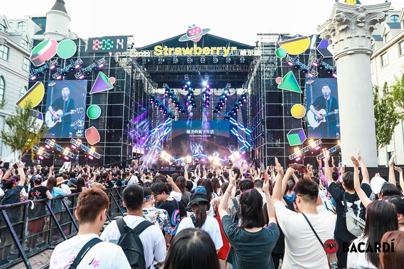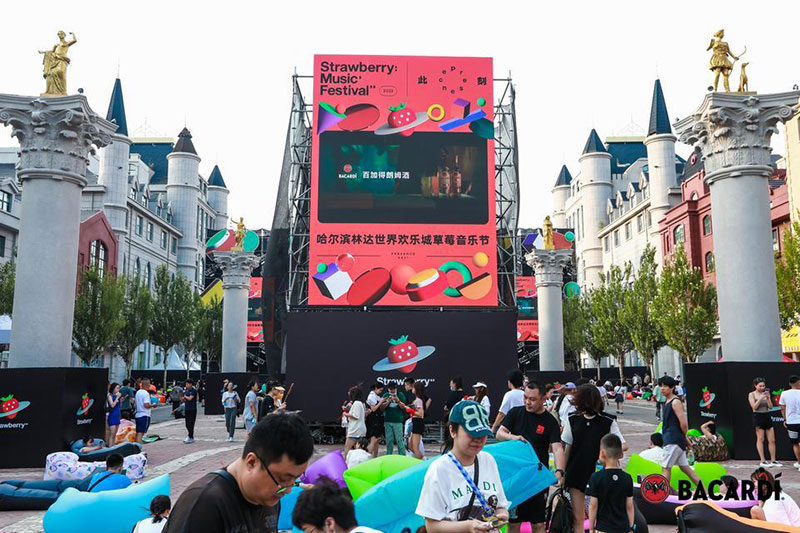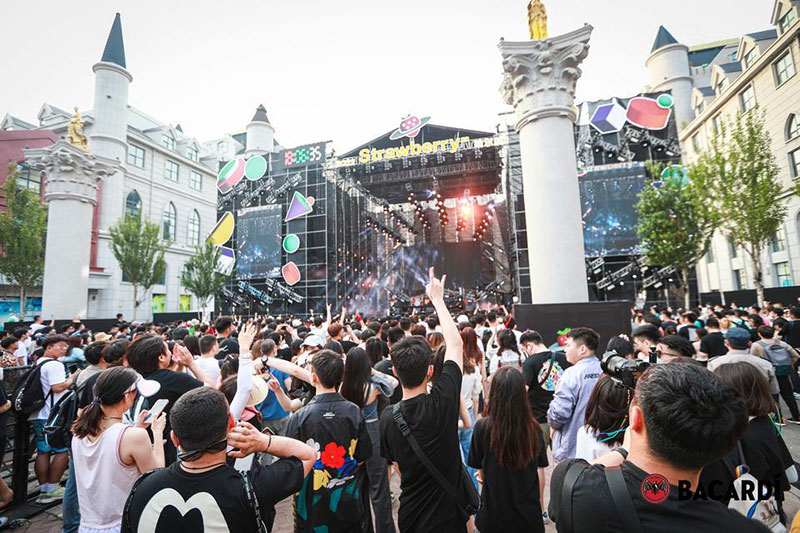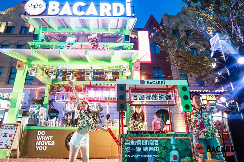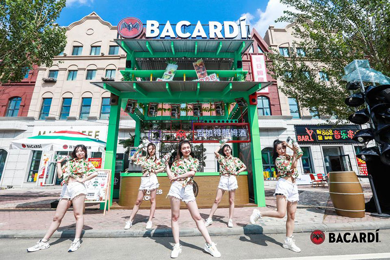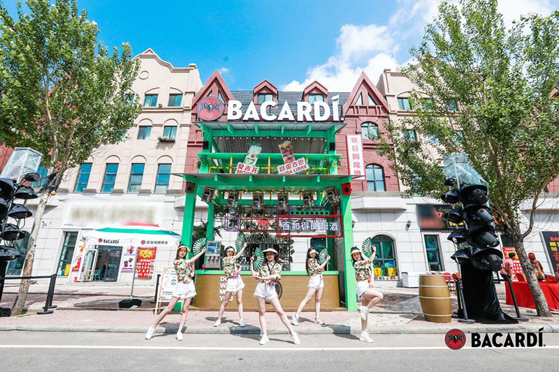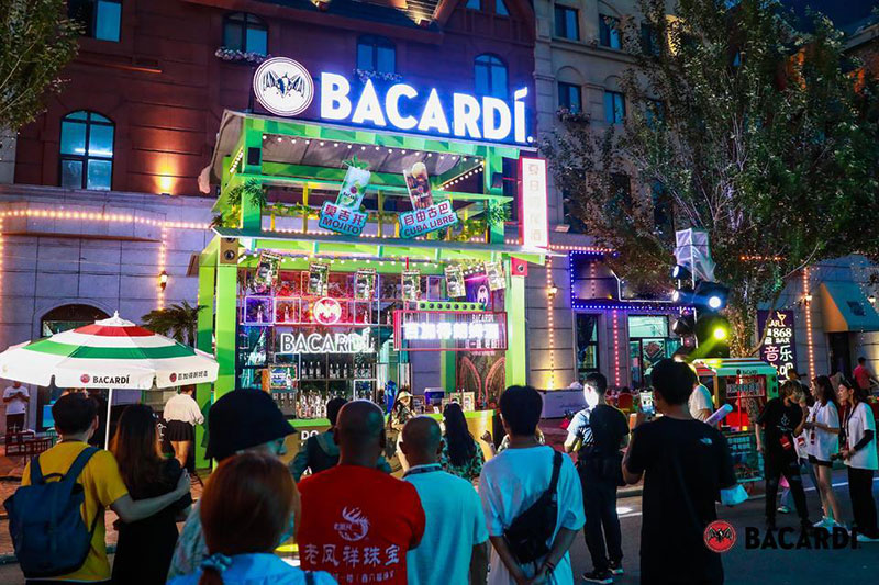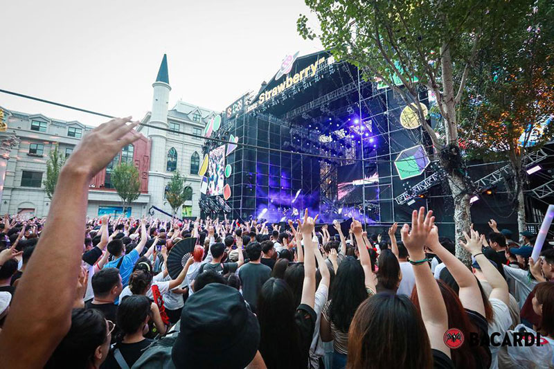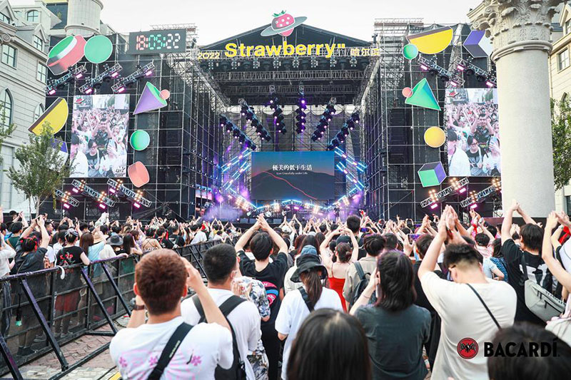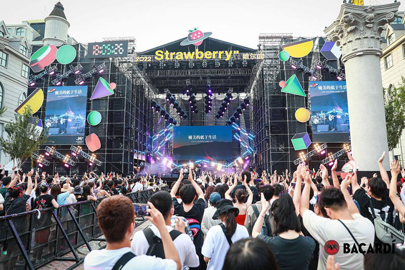 2022草莓音乐节(哈尔滨站)-百加得朗姆酒以「这一杯敬自由」为主题设置了百加得朗姆酒形象展台、百加得产品展示区、合影互动区、调酒区、试饮区、售卖区、表演区等。热辣舞蹈年轻时尚,符合音乐节到场观众审美,与草莓音乐节得热烈氛围相呼应!