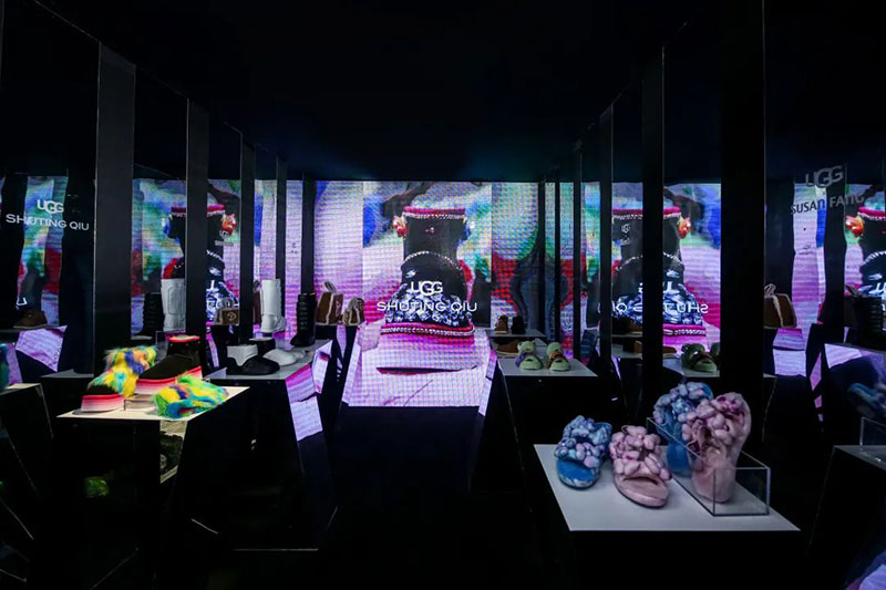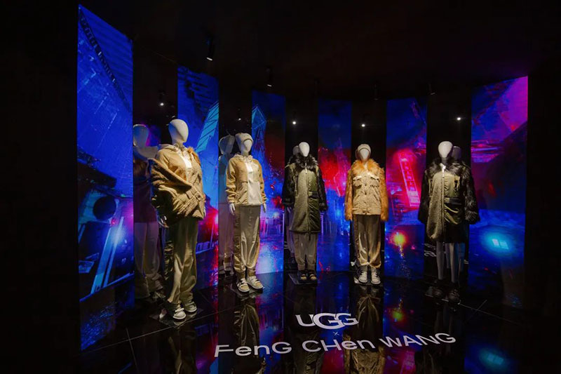 UGG®X Feng Chen Wang 联名系列展厅以“虚实相生”的概念开启创作,模特跨越虚与实的边界在不同镜面间穿梭,亦真亦幻,亦虚亦实。