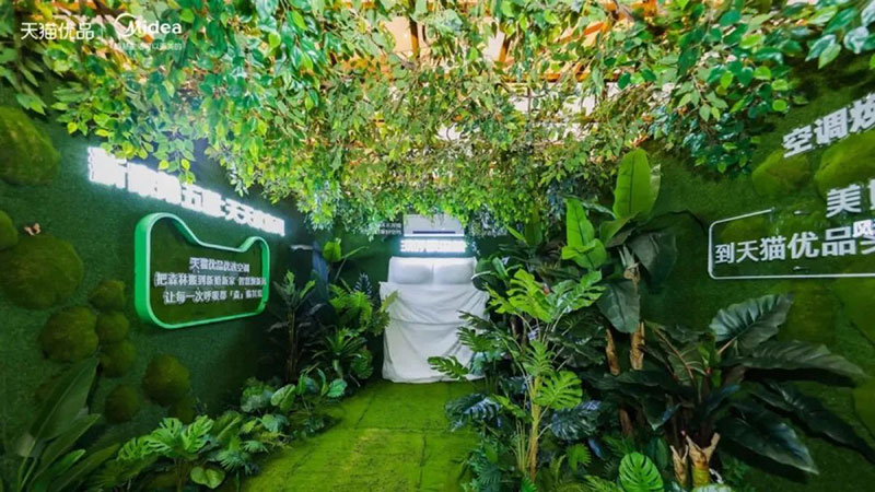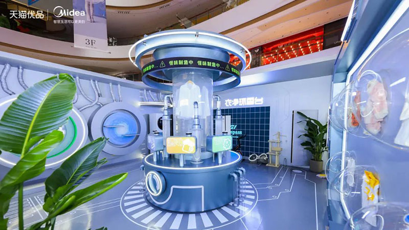 家电有囍事快闪店是由天猫优品与美的家电联合打造,品牌与平台的结合,线上同步宣发广告片。本次快闪动线设计分为6个区:家务回收区、养肤创造区、不想洗碗馆、生鲜大集市、深呼吸森林、衣净环香台等区域,通过将对应的系列产品融入场景,让用户在体验过程中接触产品。