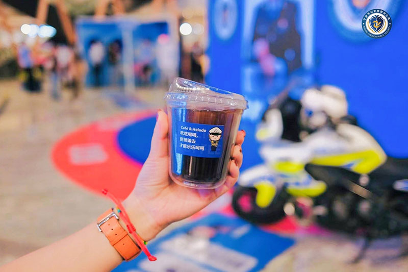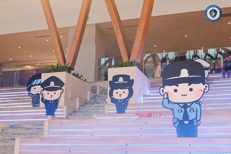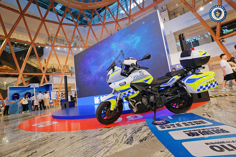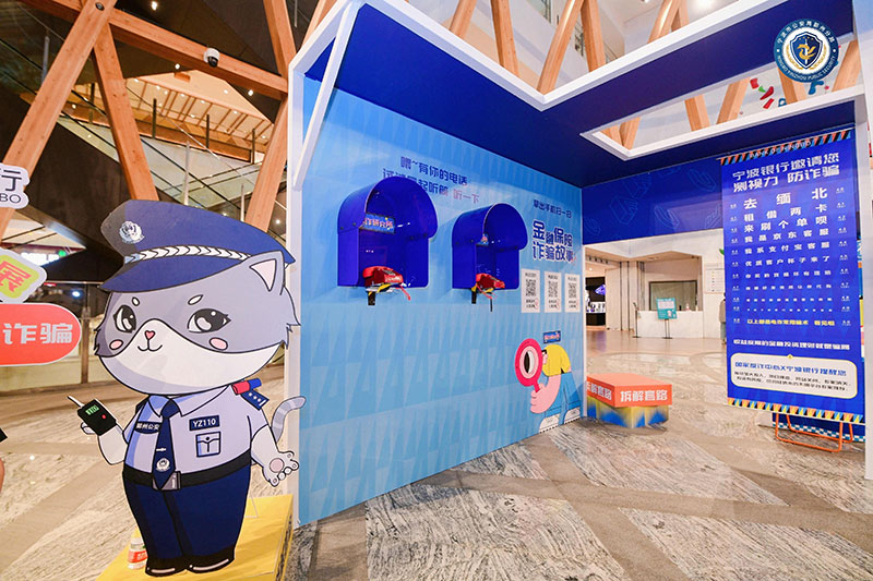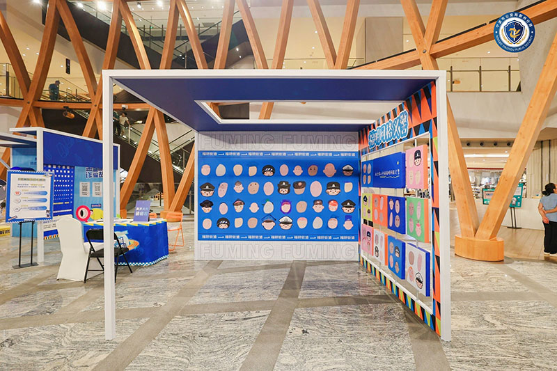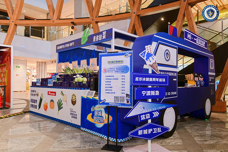 活动现场,一颗印着鄞州公安标志的蓝色星球悬挂在半空中,现场六个摊位的顶部字母组成了单词FUTURE,舞台边停靠着交警铁骑的重型摩托,阶梯台阶着排排树立着可爱的警察人形立牌,地面上张贴着十分有趣又吸引眼球的蓝色引导地贴,市民朋友期待已久的反诈冰麒麟车如期开到了现场。
