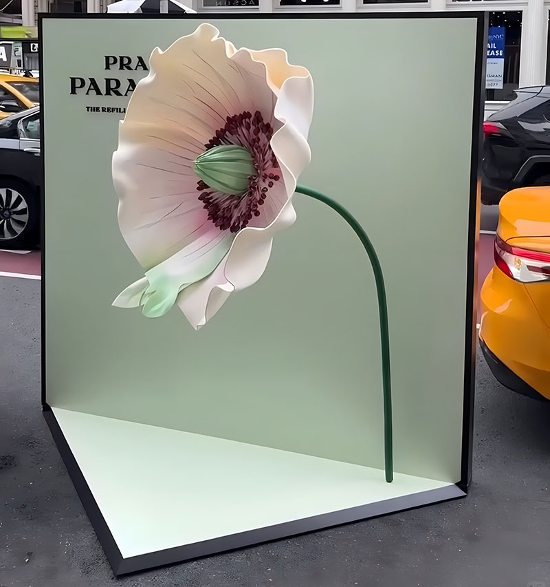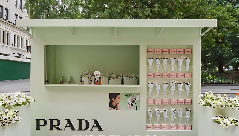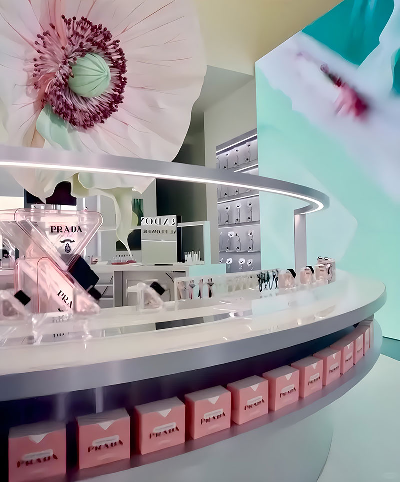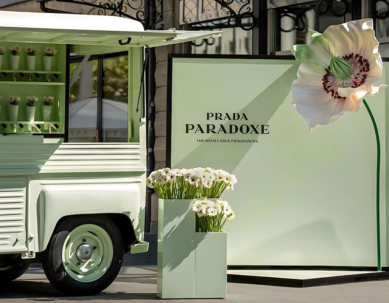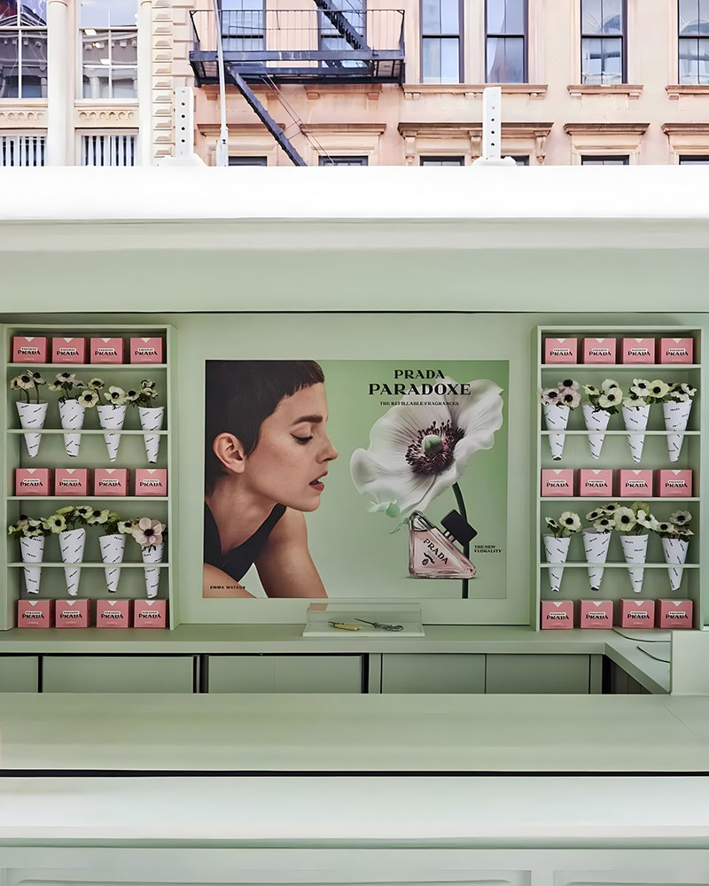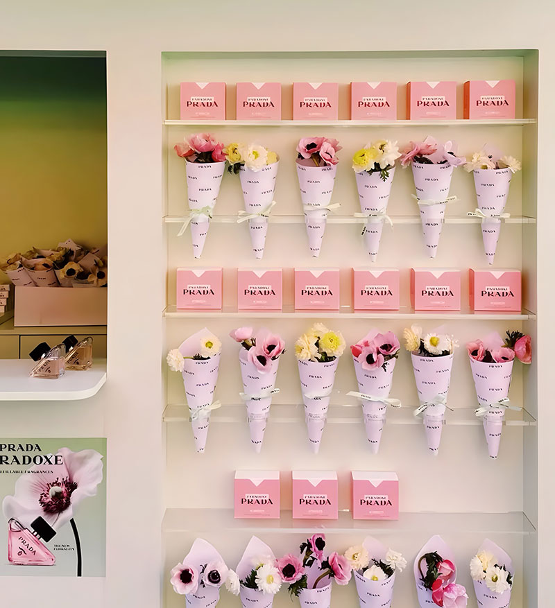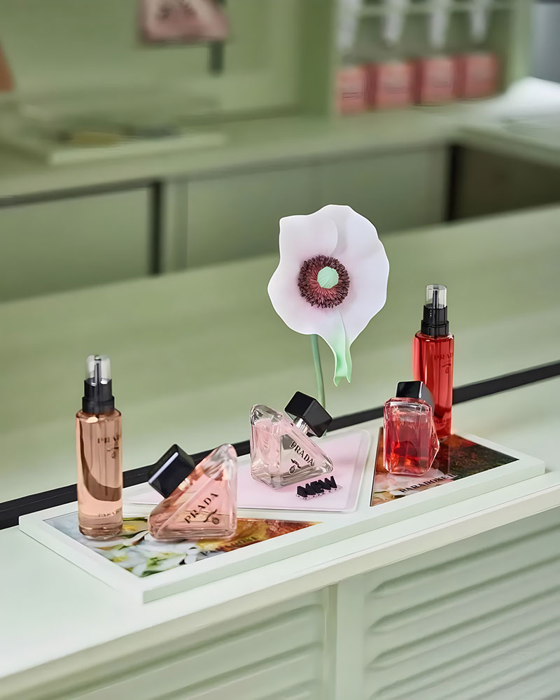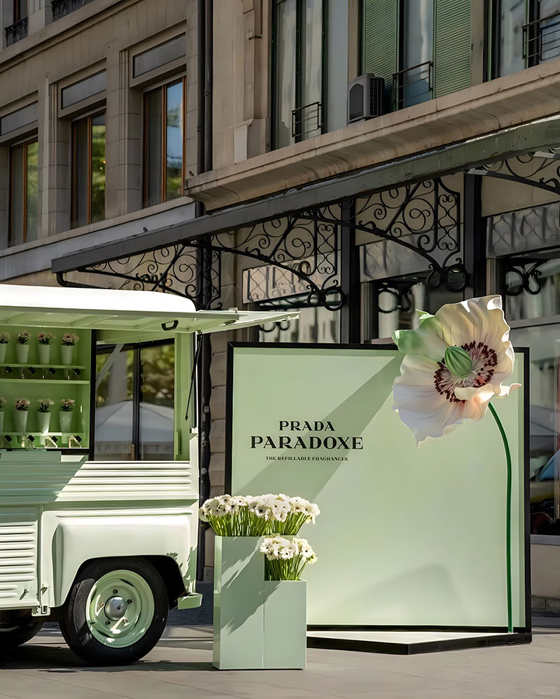 为了推广 Paradoxe Virtual Flower 香水,普拉达精心设计了备受瞩目的时刻,注重细节与设计,沉浸式的气味体验室,充满香水气泡,精心策划的花市。