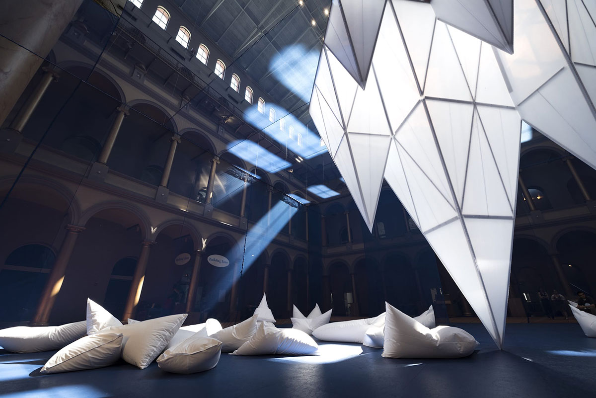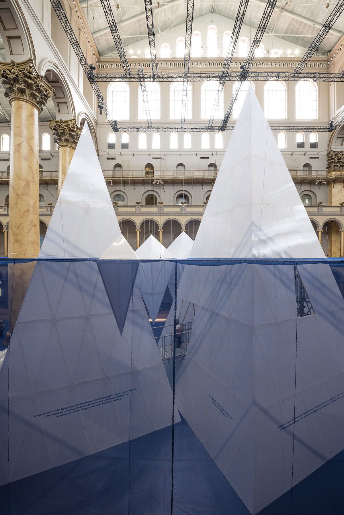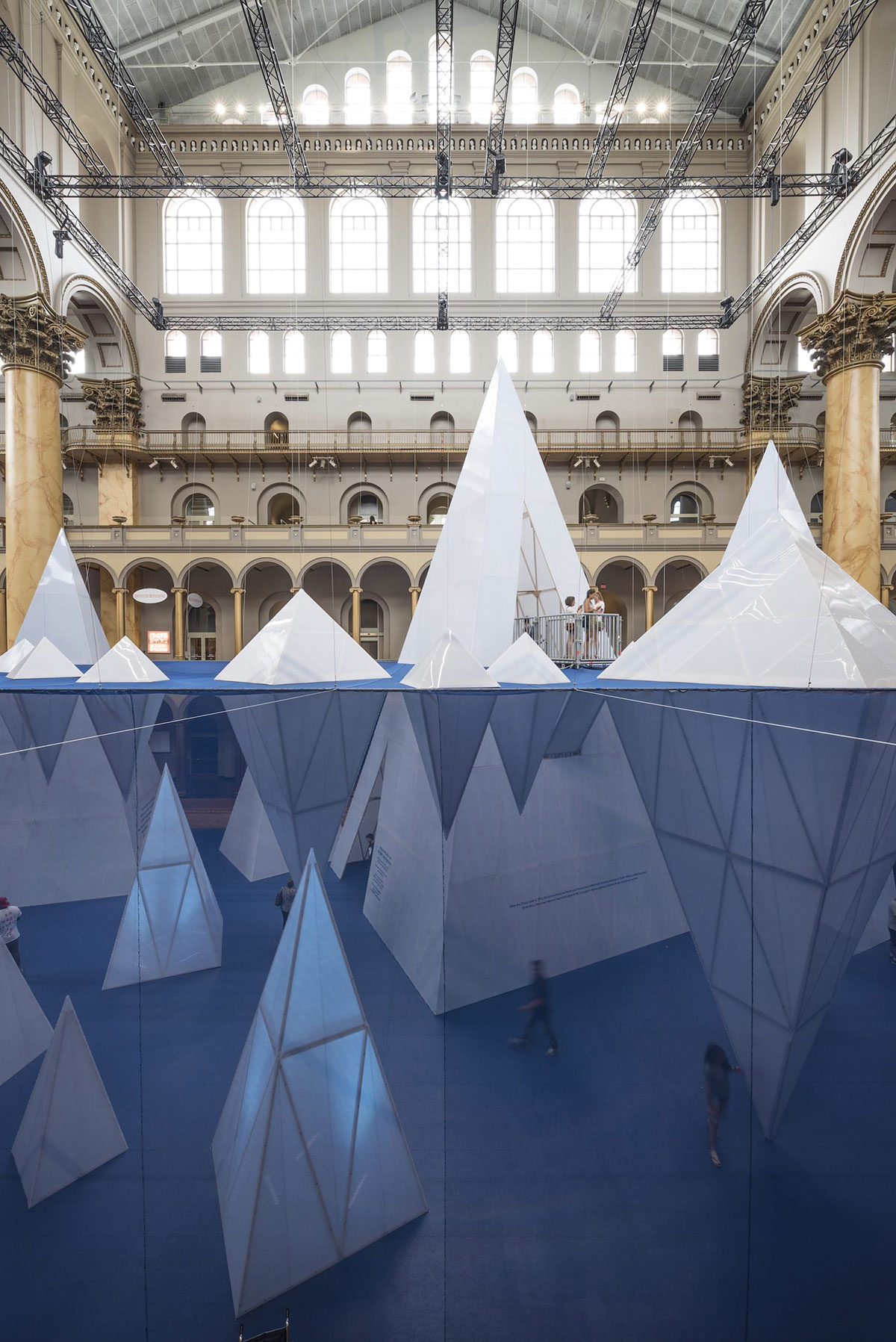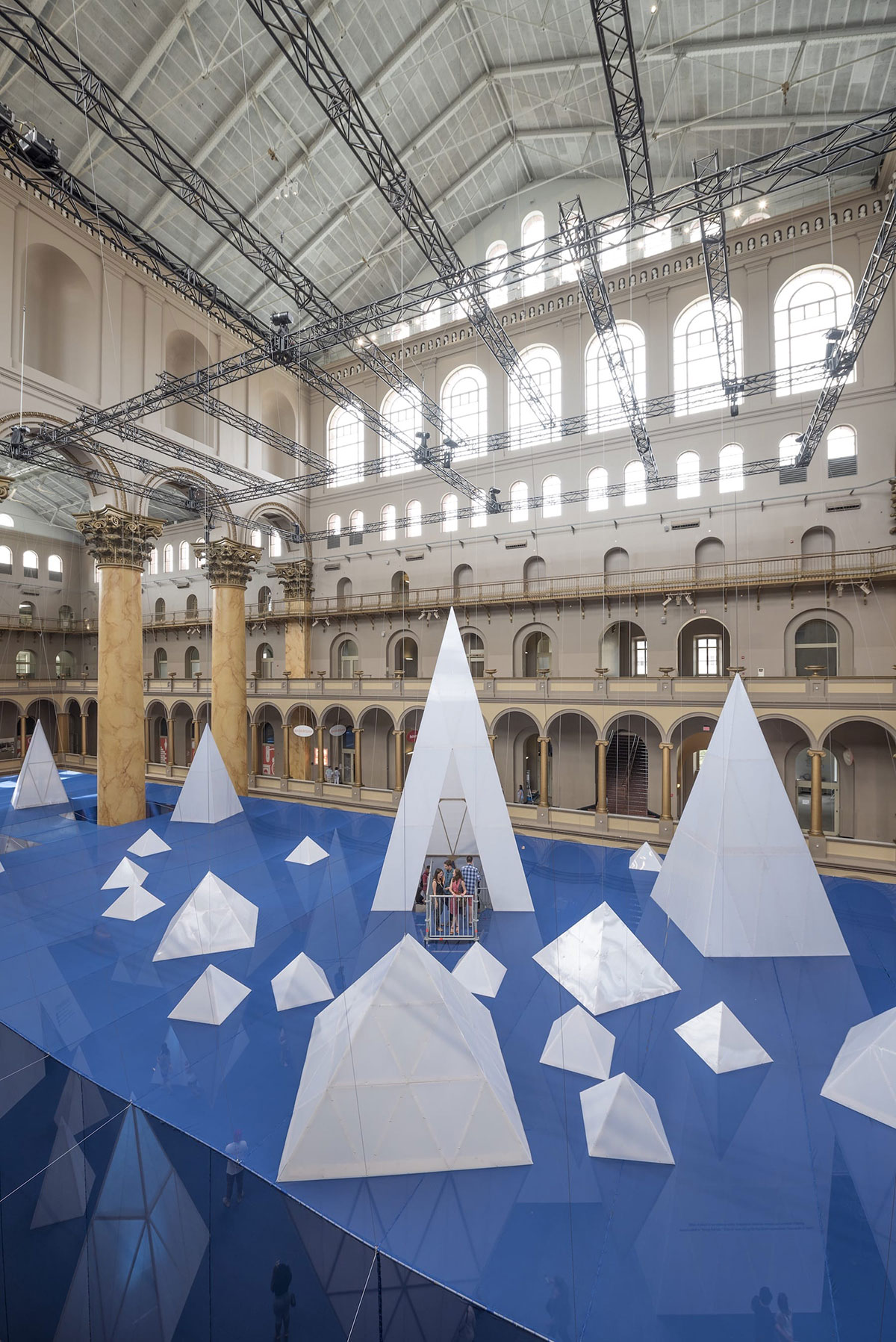 该装置以各种不同尺寸的装置元素为特色,由30多个半透明聚碳酸酯面板制成的棱柱形三角形五面体和八面体组成,高度从16英尺到56英尺不等,有些悬挂在天花板上,看起来像是漂浮着的,一个巨大的蓝网将其他冰山碎片包裹在一个巨大的三角形外壳和天花板基准框架内,地板上随机散落分布着许多三角形的豆包坐垫。