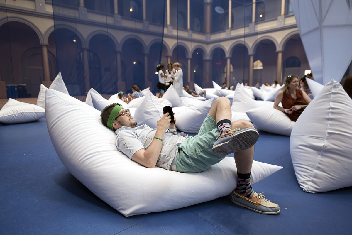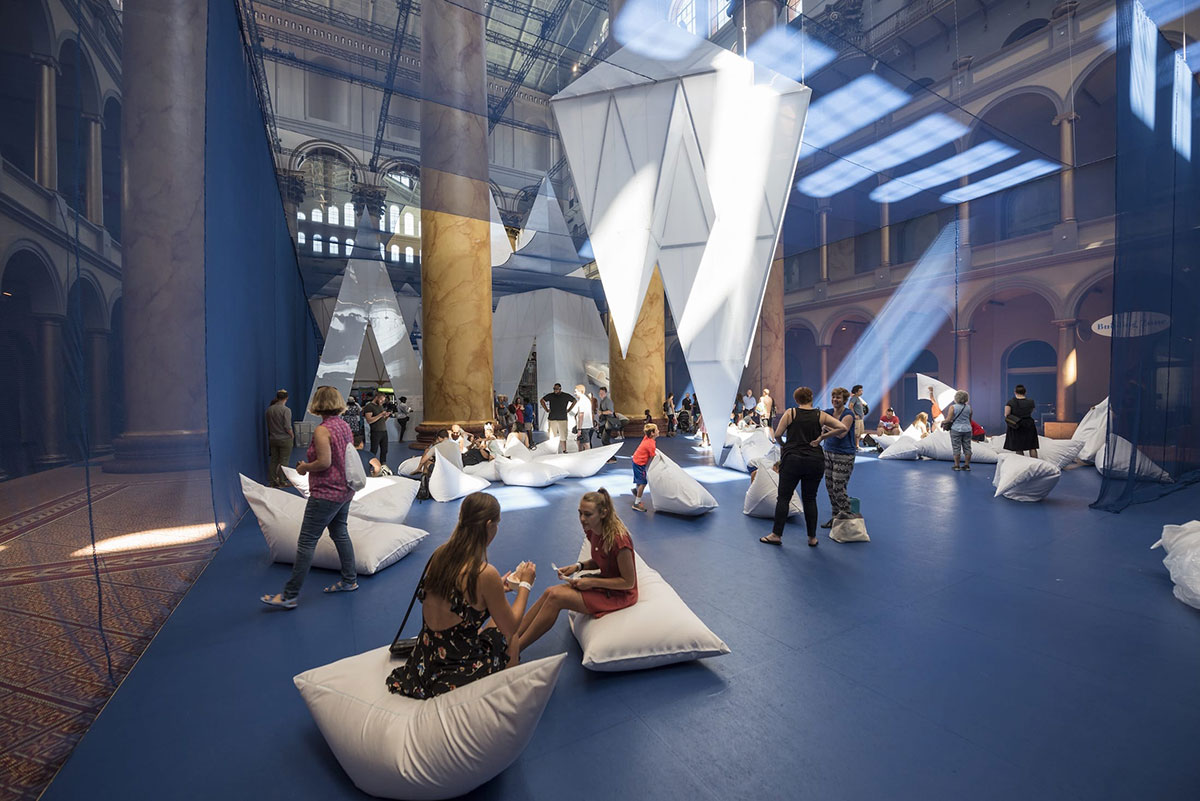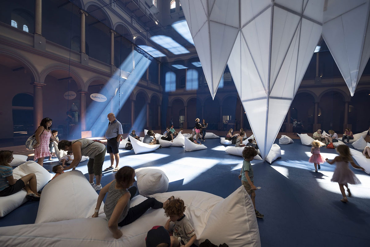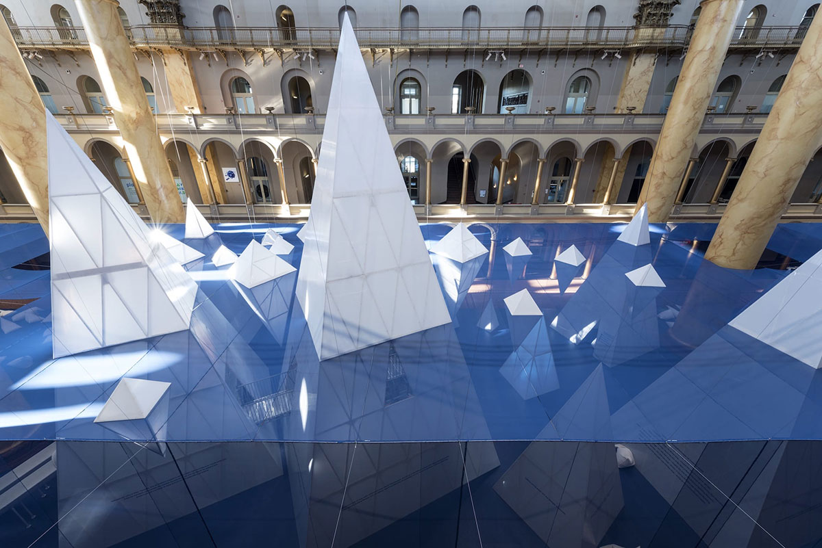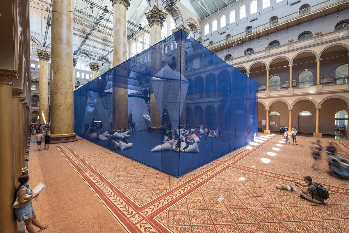 该装置以各种不同尺寸的装置元素为特色,由30多个半透明聚碳酸酯面板制成的棱柱形三角形五面体和八面体组成,高度从16英尺到56英尺不等,有些悬挂在天花板上,看起来像是漂浮着的,一个巨大的蓝网将其他冰山碎片包裹在一个巨大的三角形外壳和天花板基准框架内,地板上随机散落分布着许多三角形的豆包坐垫。