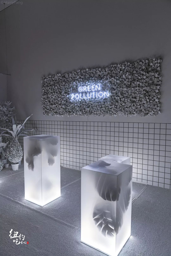 藤蔓植物、花丛、树木等场景统统被染成了纯白色,灯光忽明忽暗仿佛是植物们呼吸的节奏。而对面的墙上则是摆满了这个场景中不同种类“污染源”的采集样本。