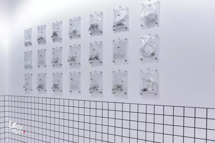 作为一个用心的展览,细节之处其实花了不少小心思。比如这里的样本区,有几件物品实际上是展览制作过程中,学生艺术家们实际用到的物品、比如喷漆用的口罩、拼装支架的组件,和原本的展品混在一起,承载了所有艺术家们的回忆。