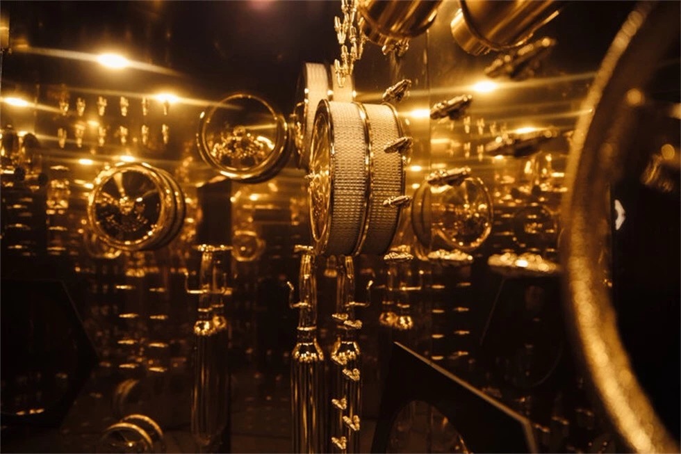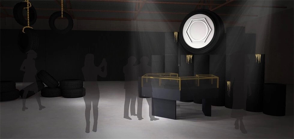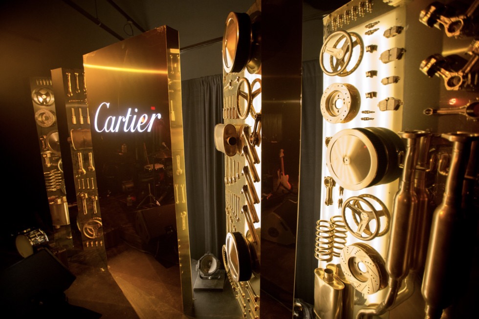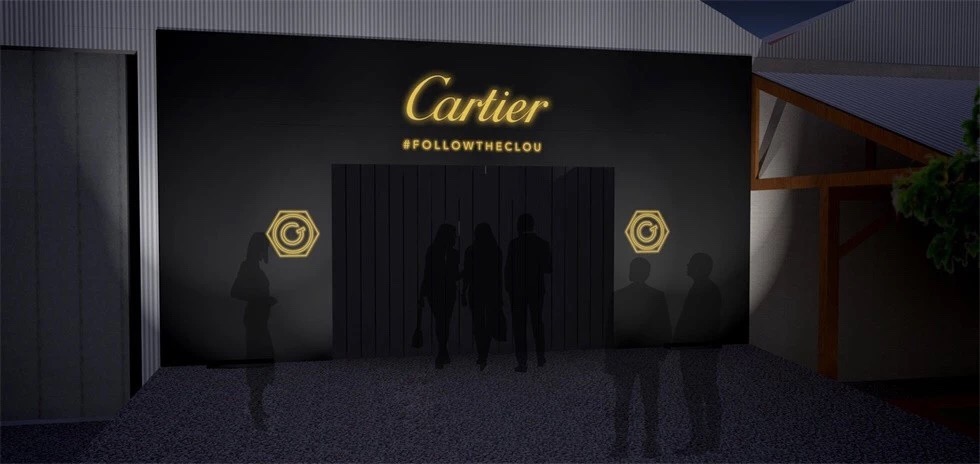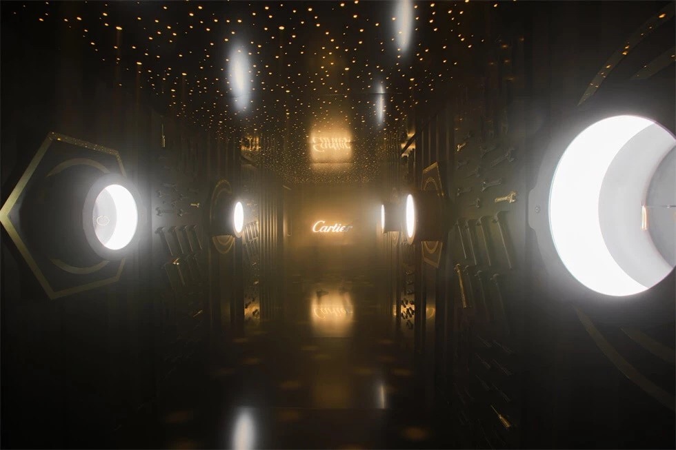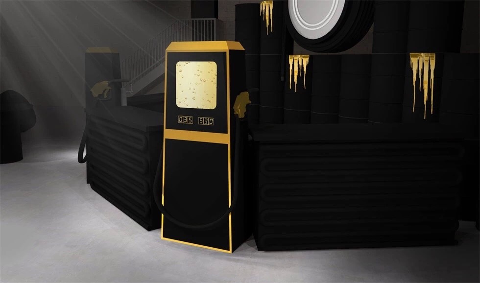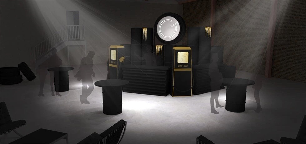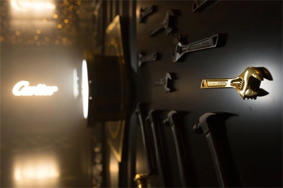 而田纳西州的纳什维尔市是“ Clou”之旅的第二站。由于卡地亚在这里没有很大的市场份额或客户群,所以它的出现给当地人带来了意想不到的快闪店式的感觉。当客人进入现场时,他们首先会看到金色的集装箱,独特装置的激动刺激他们探索这个空间。在活动中,客人可以触摸并品尝Cartu JUC(Juste un Clou)和Écrou珠宝。显示体验柜台后面叠放着一个锡油桶,上面有一个大的JUC灯箱。定制酒吧被设计为油轮,“gasker”显示屏采用透明玻璃制成,可以看到内部冒泡的香槟。夜幕降临时,机械钟clock嗒作响。舞台背景由覆盖着汽车零件和车库工具的金色面板组成,所有面板均带有金色光泽。当打开集装箱的门时,发现里面有一个自画像亭,客人进入三角形的房间,在用工具和汽车零件装饰的金色或黑色镜面墙上拍照。