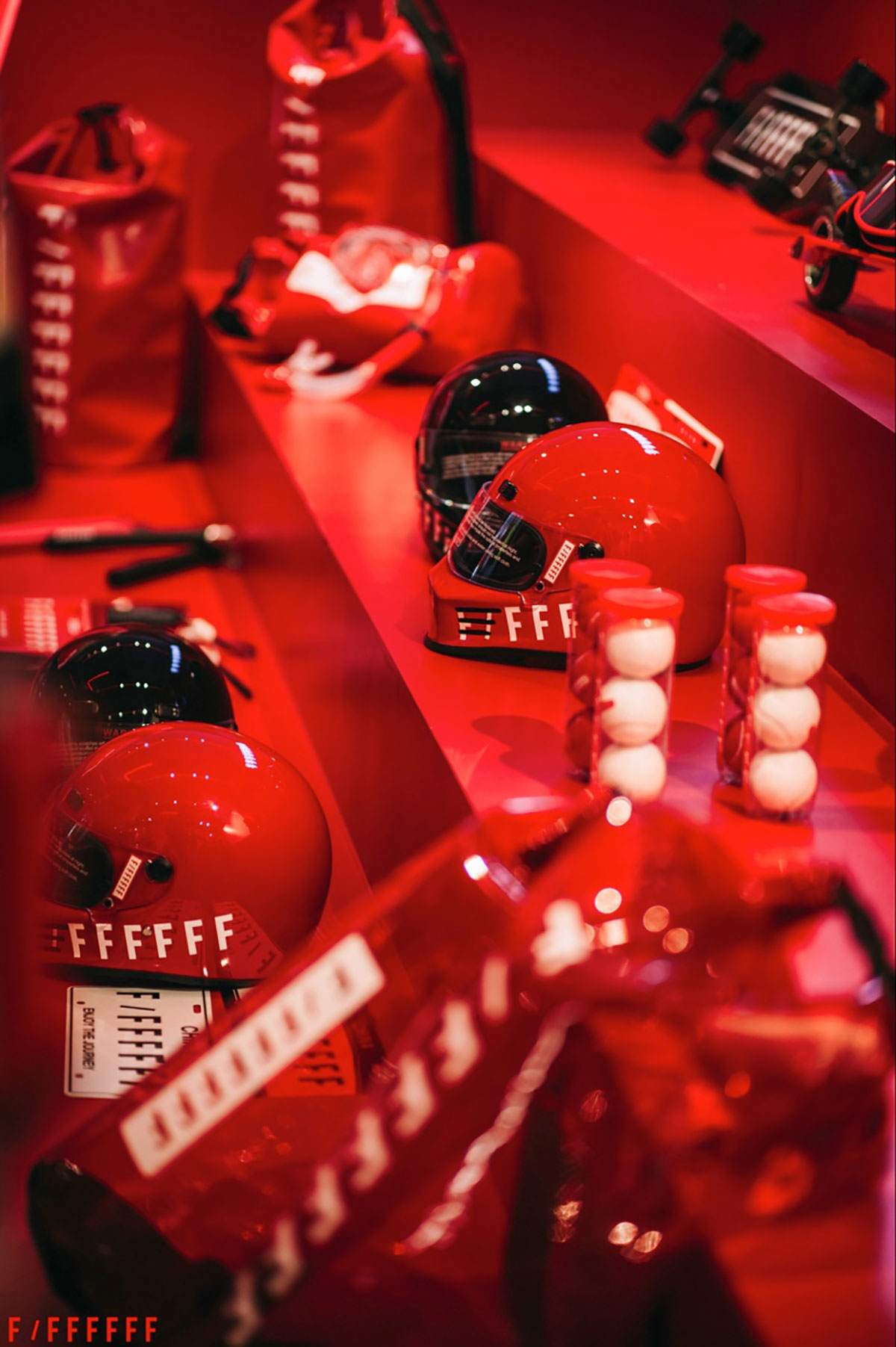 代表活力的红色,填充着店内的每一平米,如此大面积的大胆用色,却不曾感觉丝毫的单调。应接不暇的潮流服饰,创意产品,智能娱乐等诸多潮流周边,实现了F/FFFFFF品牌 “潮流融入生活”的理念。