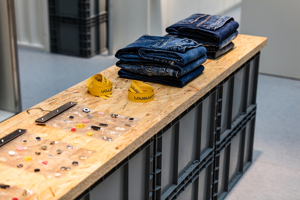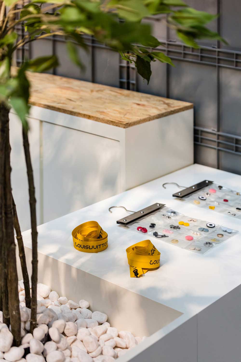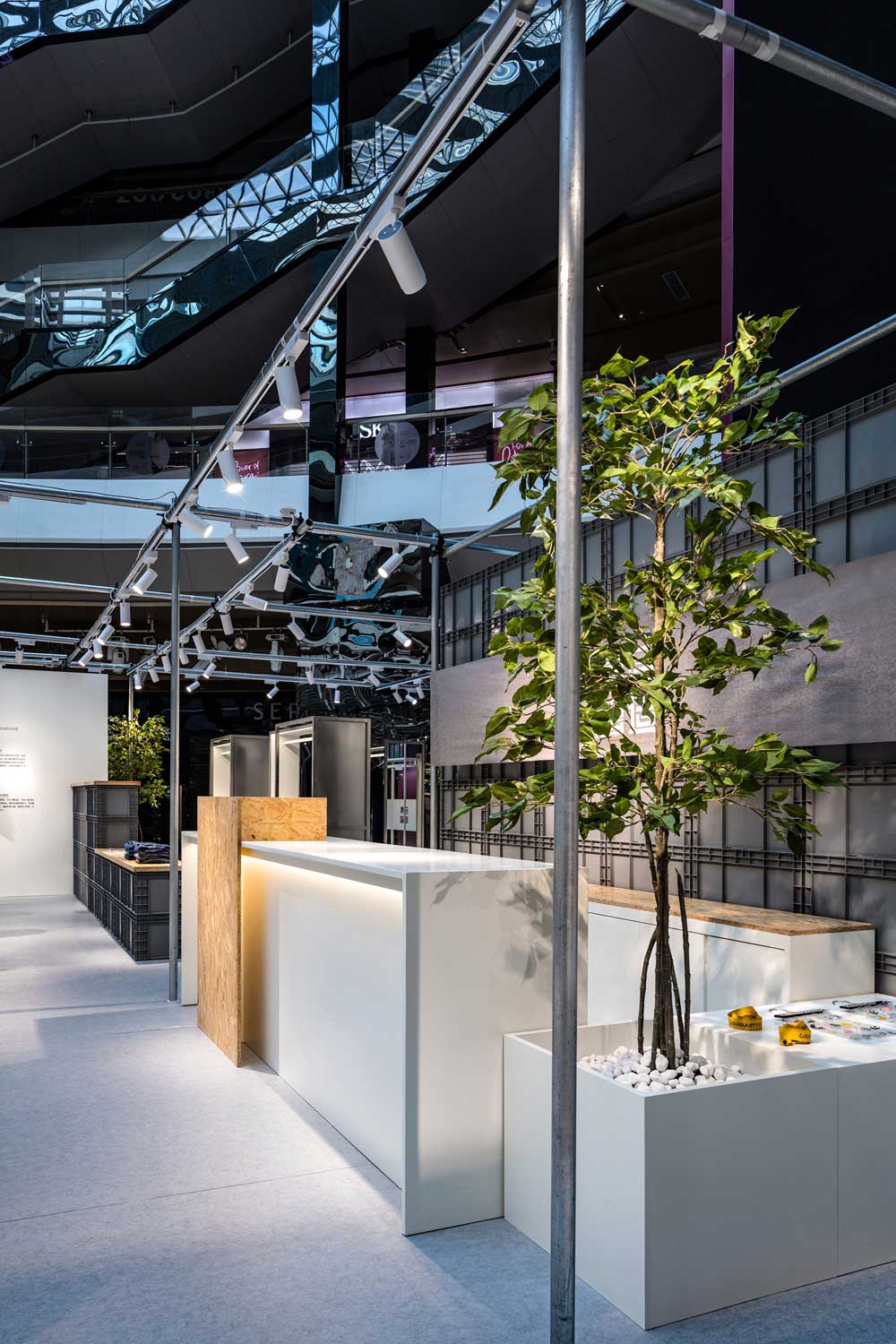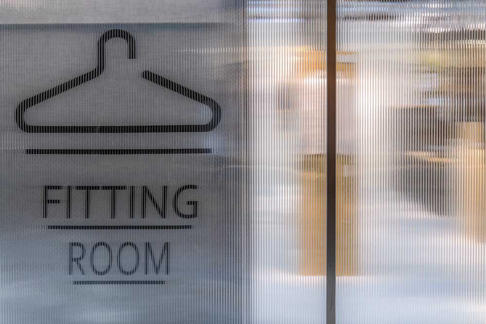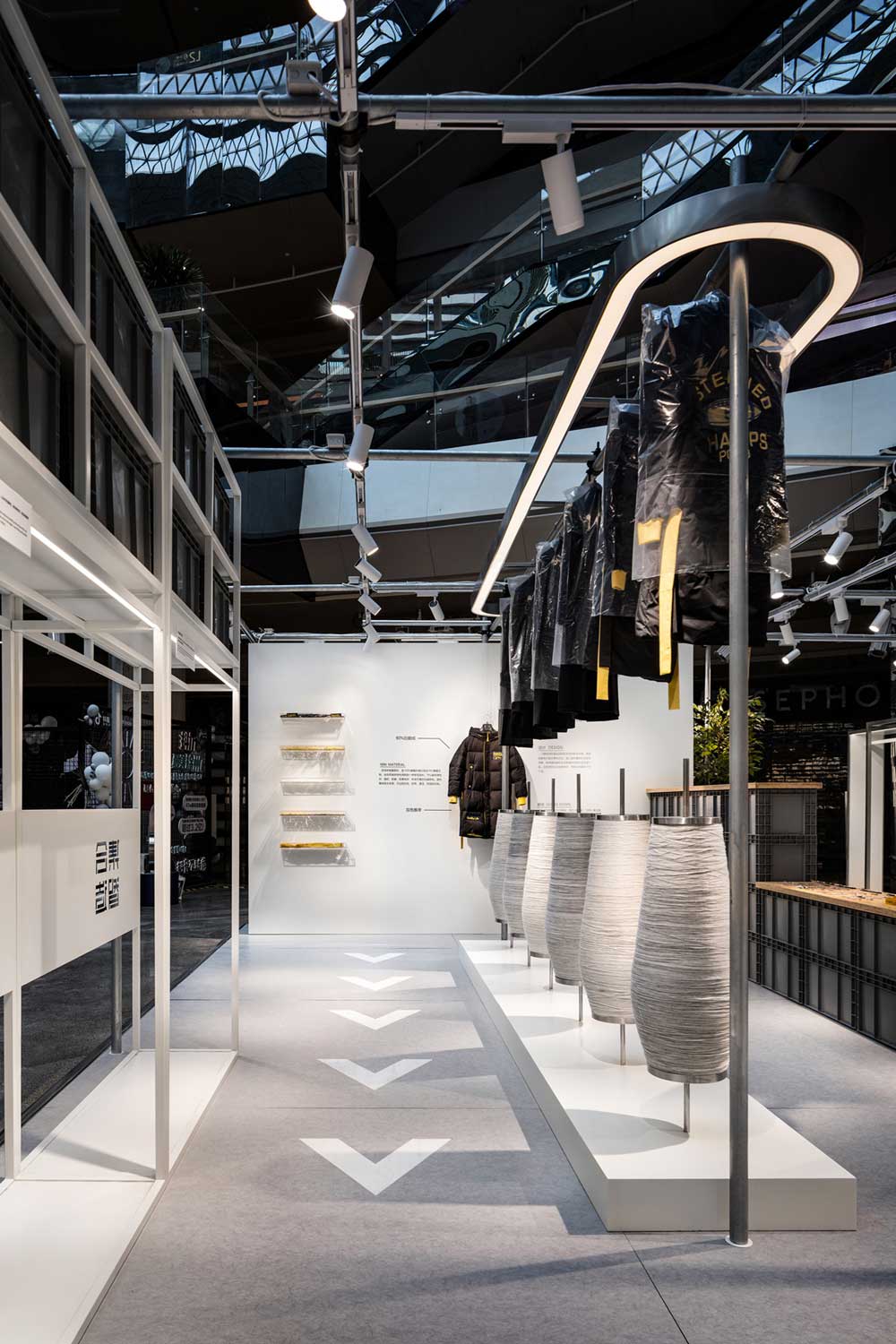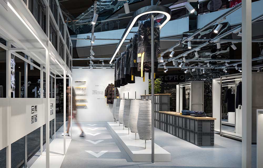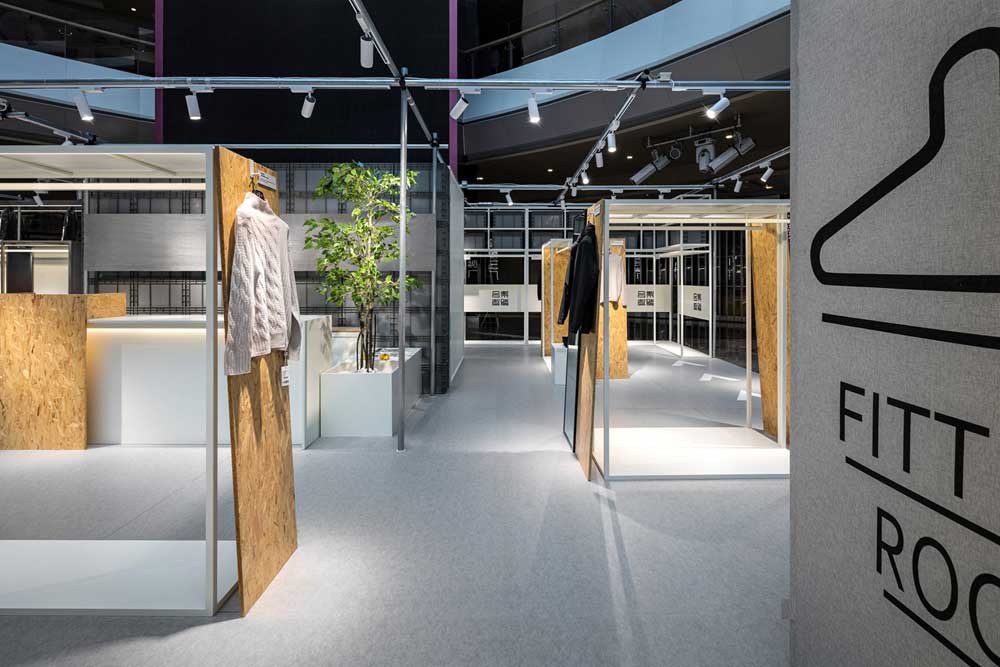整个快闪店都是采用环保材料制成,成本较低。 而为了创造一个方便使用的空间,建造了两个带轮的活动试衣间, 为了减轻试衣间的重量,用帆布建造了墙壁, 此外,每个高柜都有相应的产品信息。