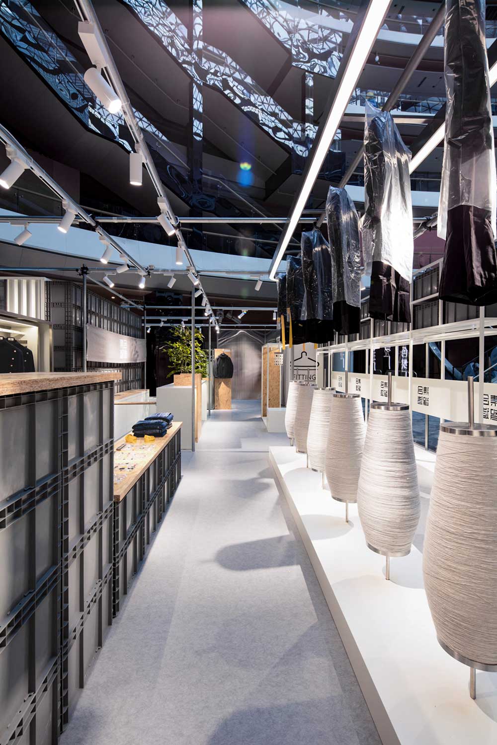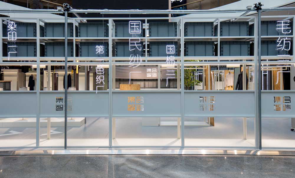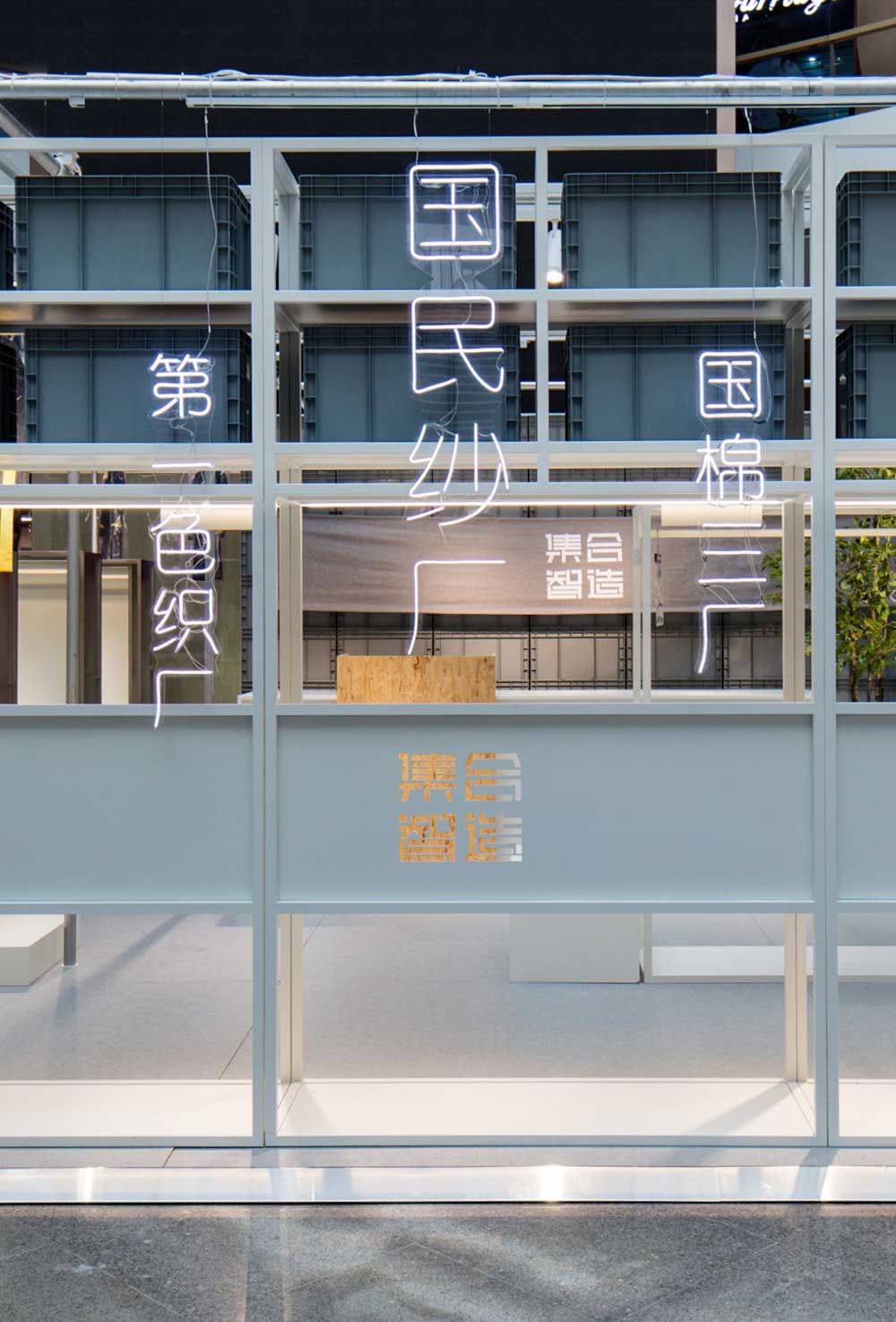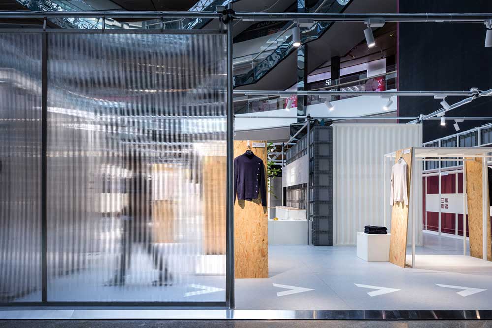 在EVE GROUP拥有的“ JIHEZHIZAO”的快闪店策划设计上,整体空间基本上由脚手架装饰,立面上装饰有常规的工业风格材料,例如聚碳酸酯中空板和PVC卷帘,霓虹灯的字样让人联想到旧工厂的招牌。