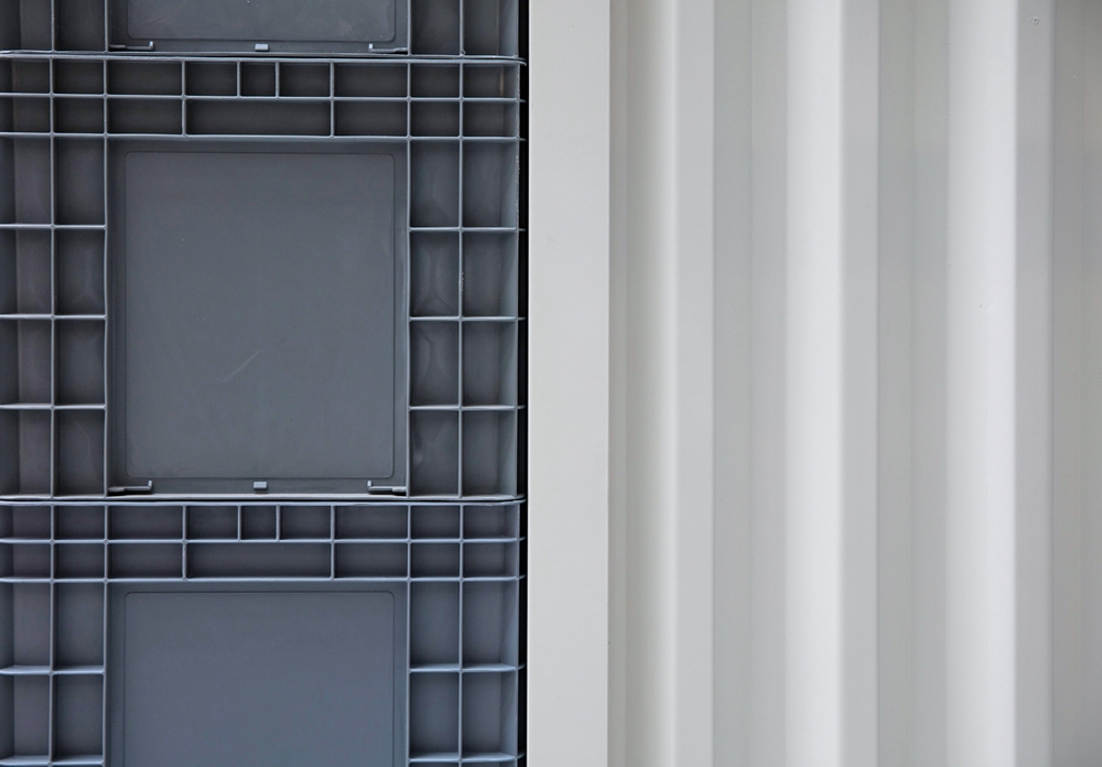 中型隔墙装饰有常规的物流箱,而仓库壁则装饰有波纹板, 陈列柜上装饰的展示板指示在此出售产品。