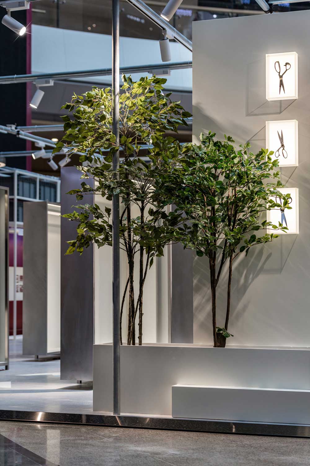 在空间外围区域的展示墙上装饰了各种剪裁剪,消费者可以在多功能椅子和展示柜上休息,拍照,为电子设备充电等。
