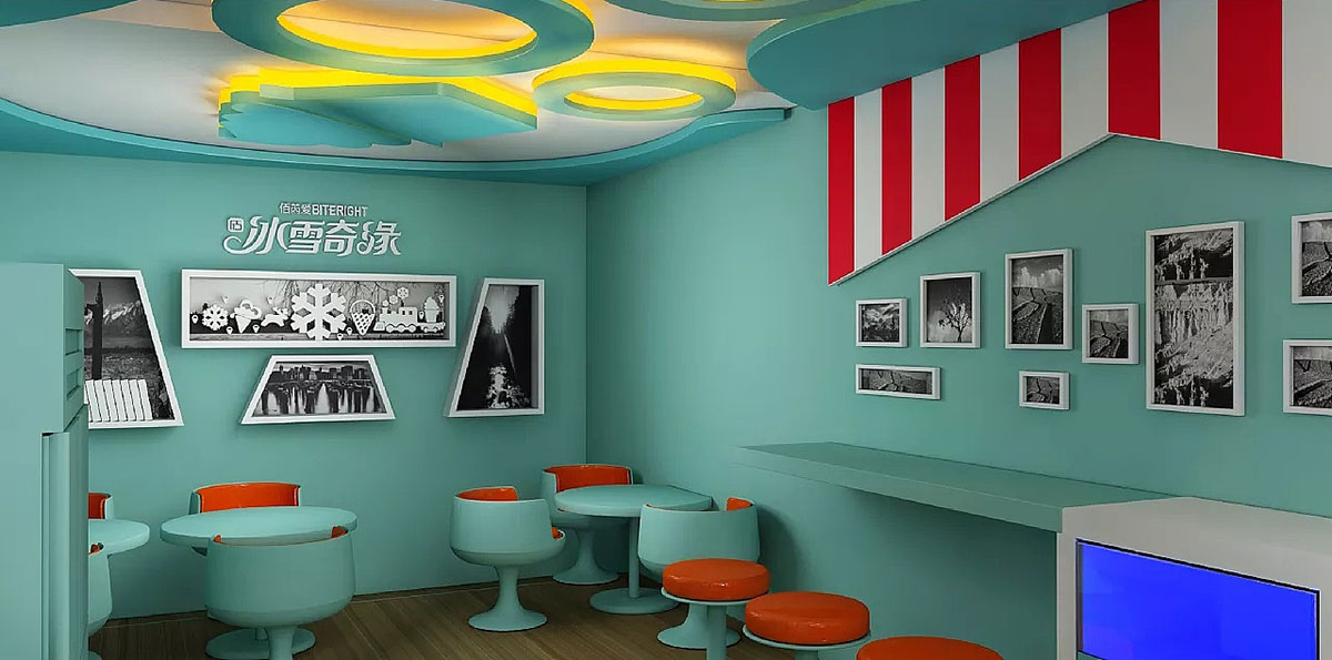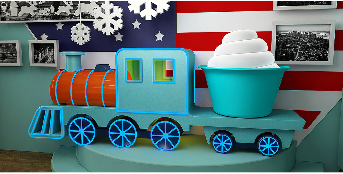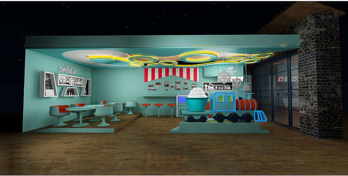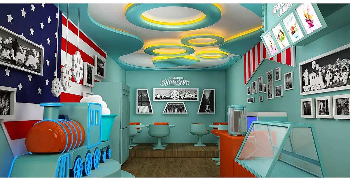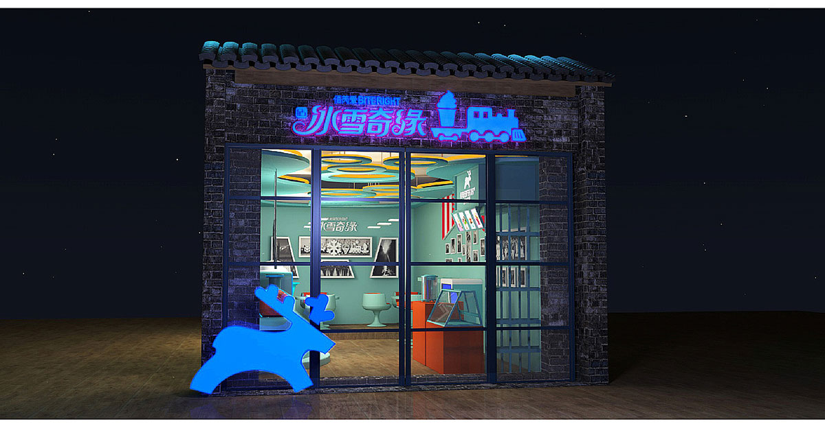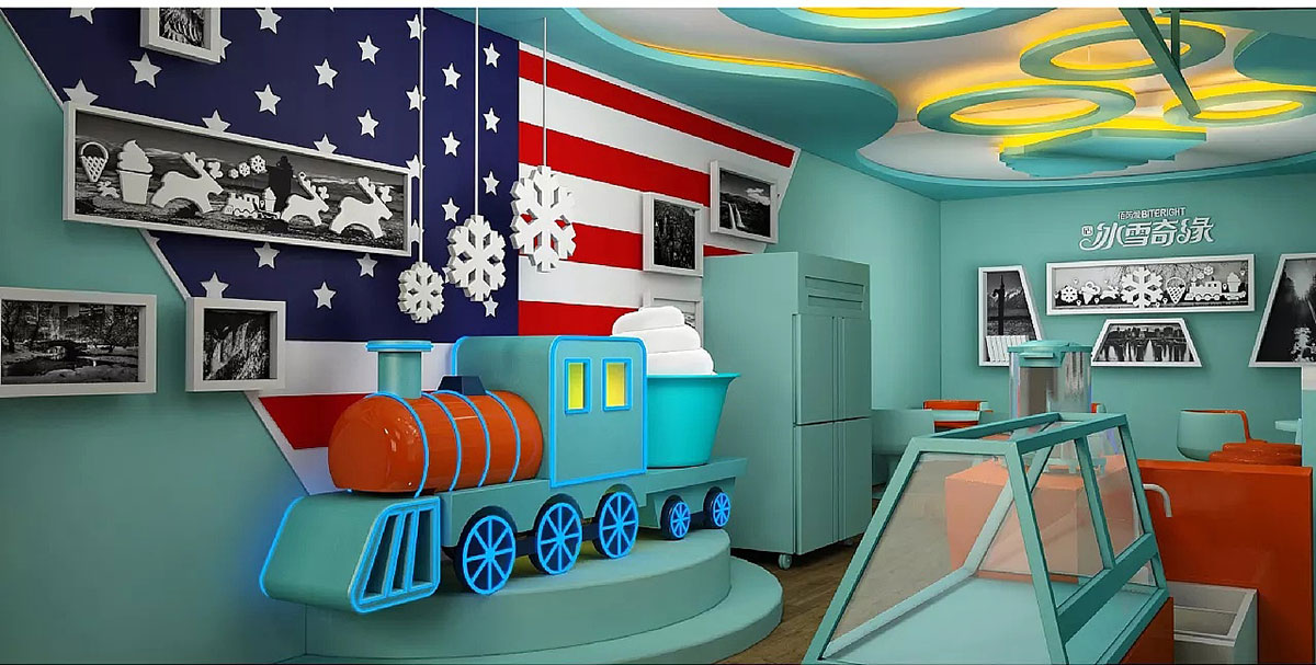 冰雪奇缘这家快闪店策划设计了一个有夜景效果的招牌吸引消费者进店消费,其店内设计也符合冰淇凌的特征,颜色清新冰爽,有一些像小火车这样可爱色拍照造型,整体还加入了美国元素体现美国手工的特性。整个设计规划面积运用合理,紧凑且玲珑,从店外一看就可以很明显地看出店里的风格与亮点。