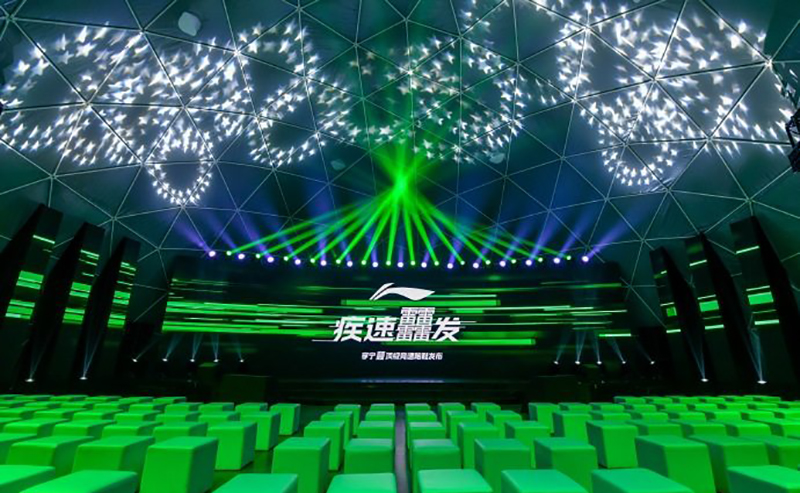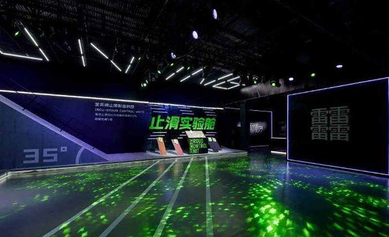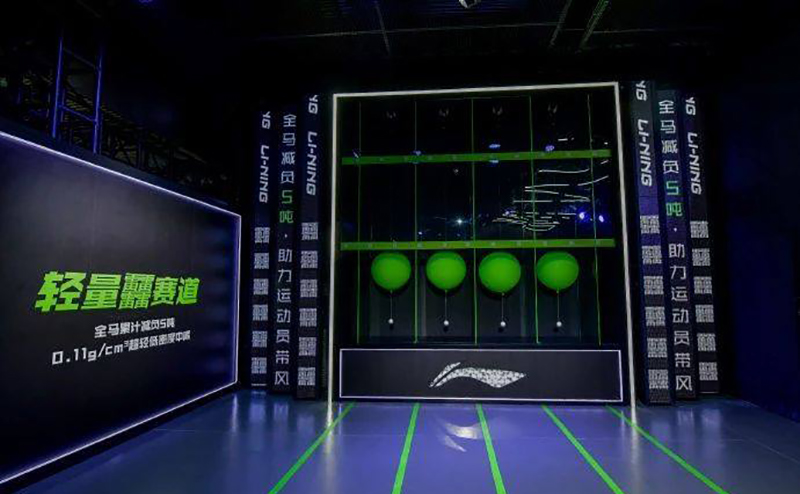 在这个疾速䨻发体验空间的沉浸式交互设计中,使用了“轻量”、“回弹”、“止滑”等多项关键产品功能,设计了由轻量䨻赛道、回弹解码室、䨻速追光等互动区域组成的李宁疾速䨻发体验空间,通过有趣的体验设备为媒体和公众“解构”真实数据,并以极富创造性的方式呈现李宁䨻疾速系统。