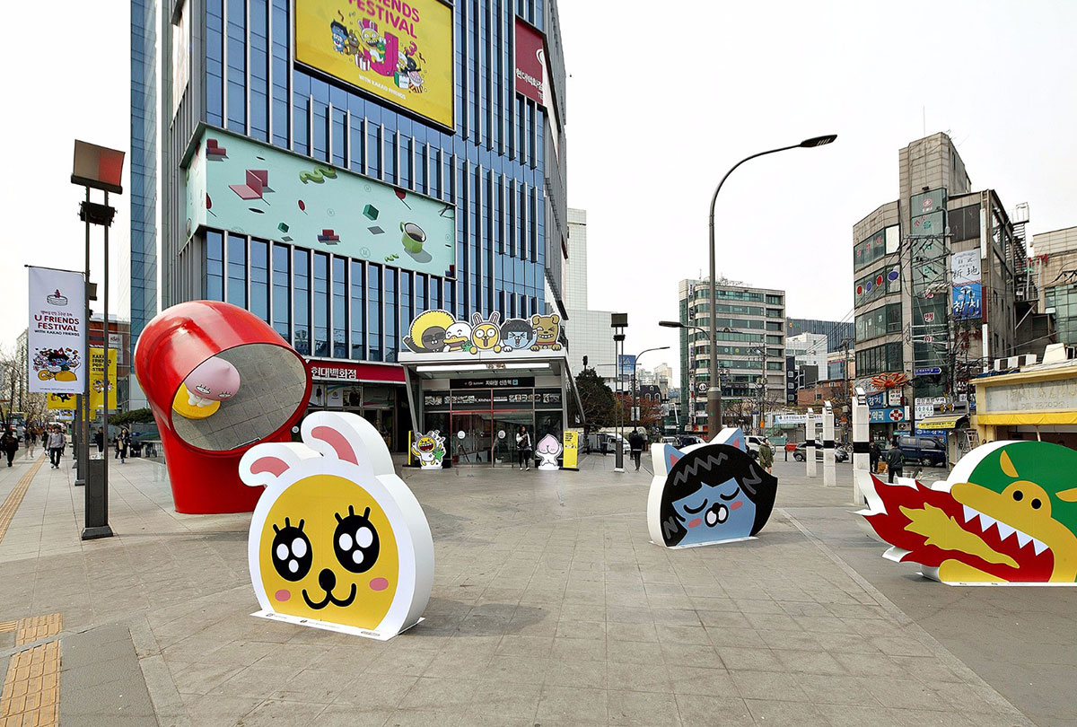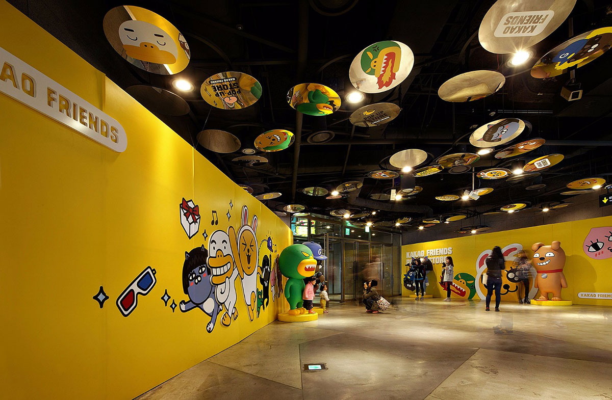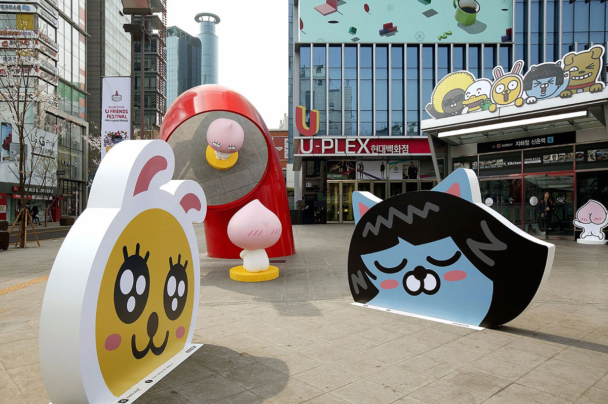 KAKAO FRIENDS主题商店内卡通原型取自韩国国民软件KAKAO TALK。此次KAKAO主题展览策划了很多特色表情人物,而且每个人物都有自己的名字,像是可爱的小兔MUZI、粉嫩的小桃APEACH、大嘴TUBE等等。一进入商店迎面而来的就是巨型卡通人物的展示区。看到萌萌的MUZI在朝你微笑,怎么能不去和他来张亲密合影呢?在KAKAO FRIENDS SHOP主题店里陈列着各式各样的周边商品,大部分以实用的生活用品为主。