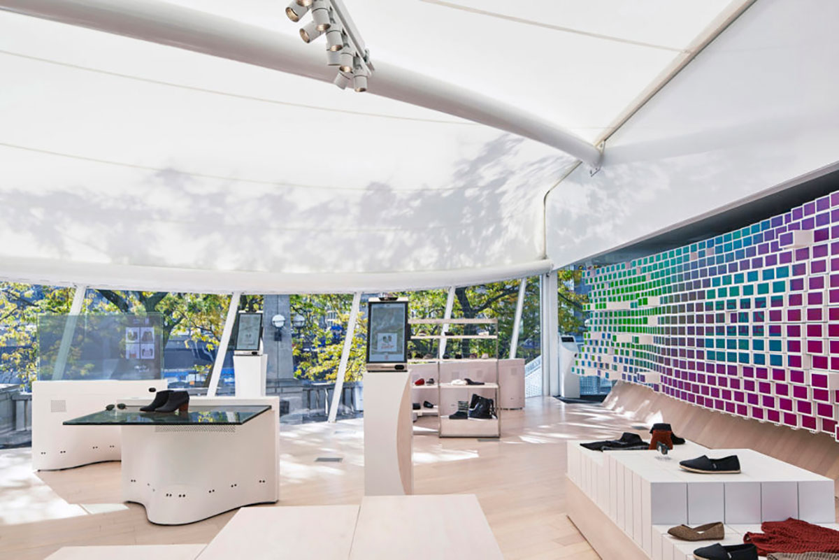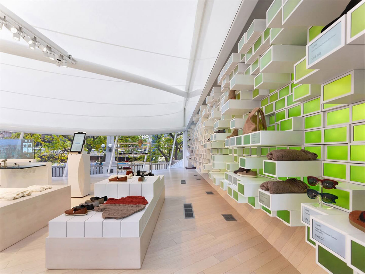 芝加哥的WithMe Mobile快闪店共279平方米,该快闪店引入了一个新的零售模型,其像素墙为900个7英寸屏幕,形成一个小型电动伸缩架。每个电动可伸缩搁架可以与墙壁齐平放置或延伸,以提供放置产品的位置。所有产品都预先嵌入RFID标签中。当消费者拿产品查看时,读取器因无法读取产品标签来过滤数据以获得产品的相关数据,当消费者选择靠近像素墙的产品时,产品信息会自动显示在数字屏幕上。
