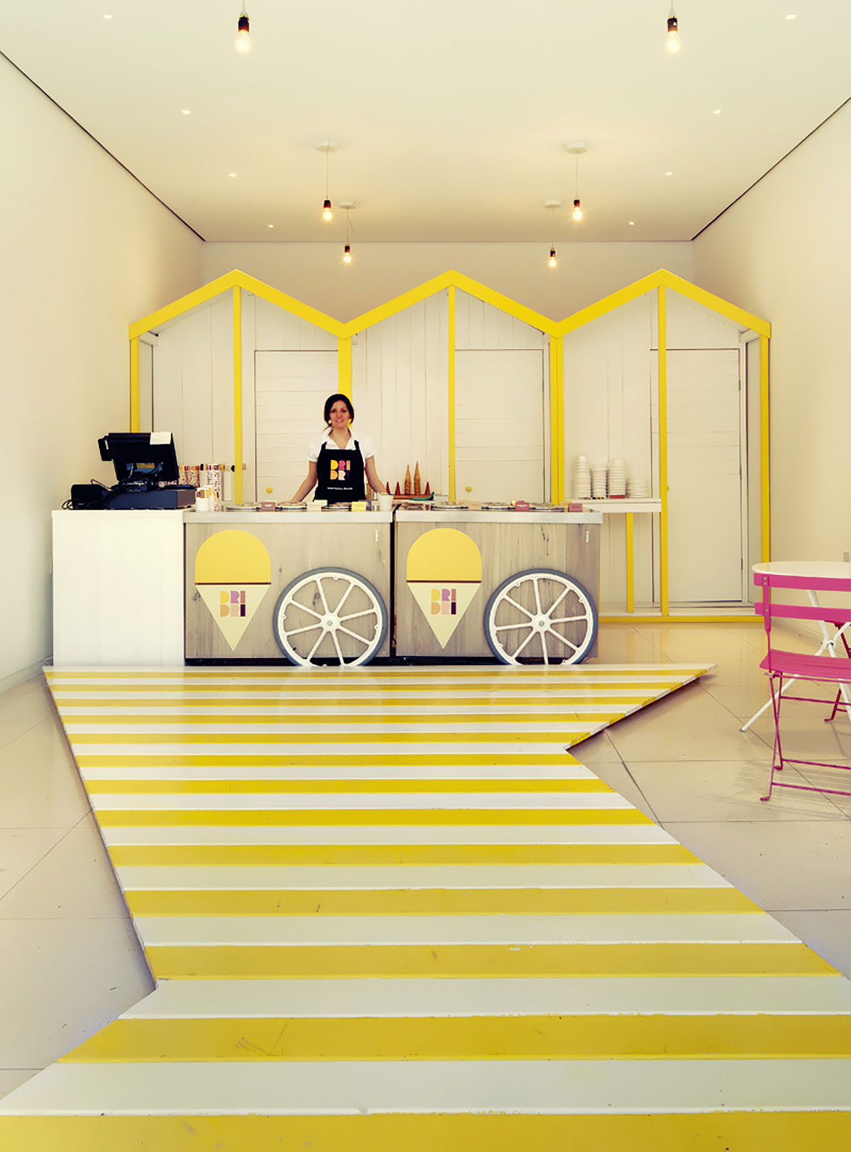 这家冰淇淋店拥有传统的装饰,色彩缤纷的海滩小屋,太阳伞,椅子和桌子,所有这些都让人联想到海滩上的黄色海滩小屋和条纹。 桌子后面的“海滩小屋”分隔了空间,也可以作为存储项目。 带有太阳伞图案的墙贴为整个二维空间增添了视角。