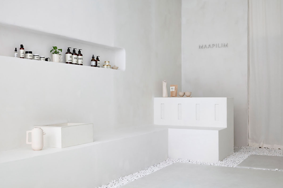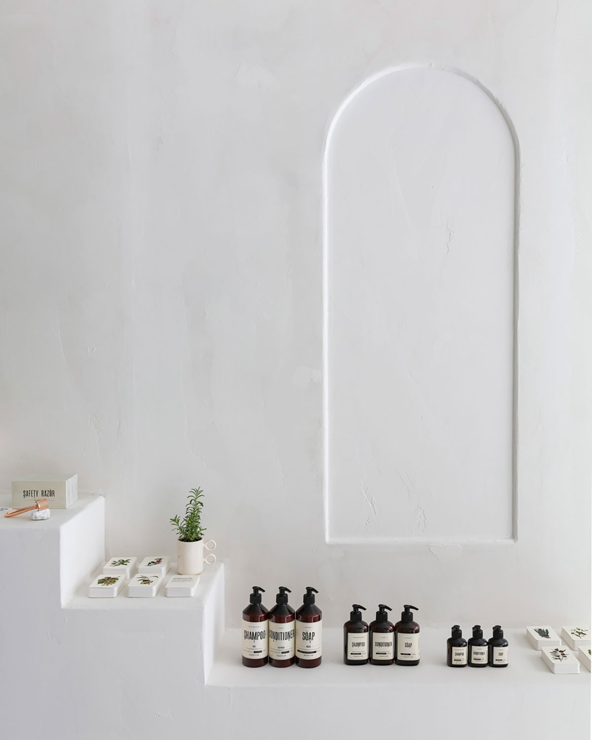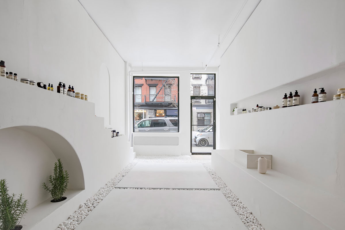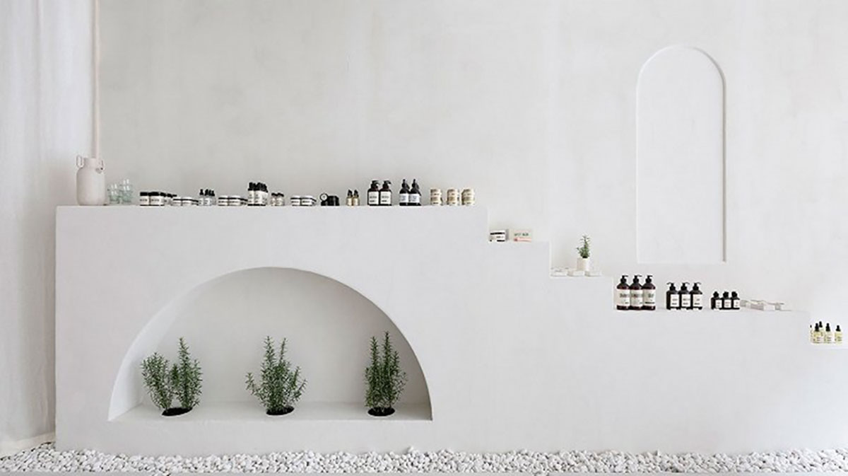 这家快闪商店就是一个微型的希腊花园,拱形的角落、白色鹅卵石和地中海草本植物是此次设计的亮点,其目的是体现该品牌的起源,及其使用来自以色列城市附近地中海的天然成分。这次的快闪商店展示的柔和线条和不完美的形状,给顾客创造了一个平易近人的场景,品牌方希望有一种邀请顾客进入度假模式而不是现代化展示中质朴干净的线条。