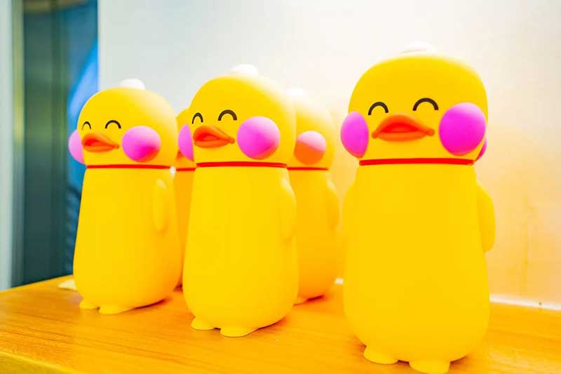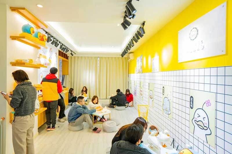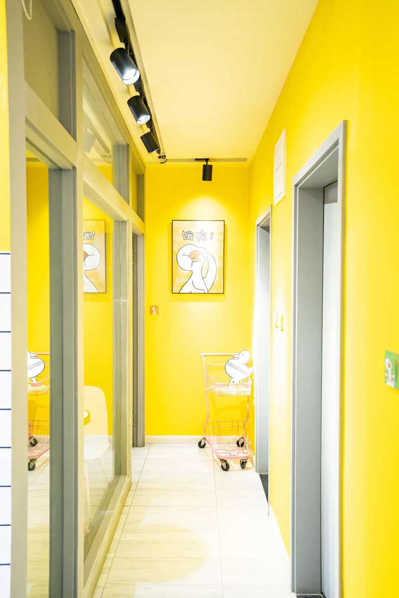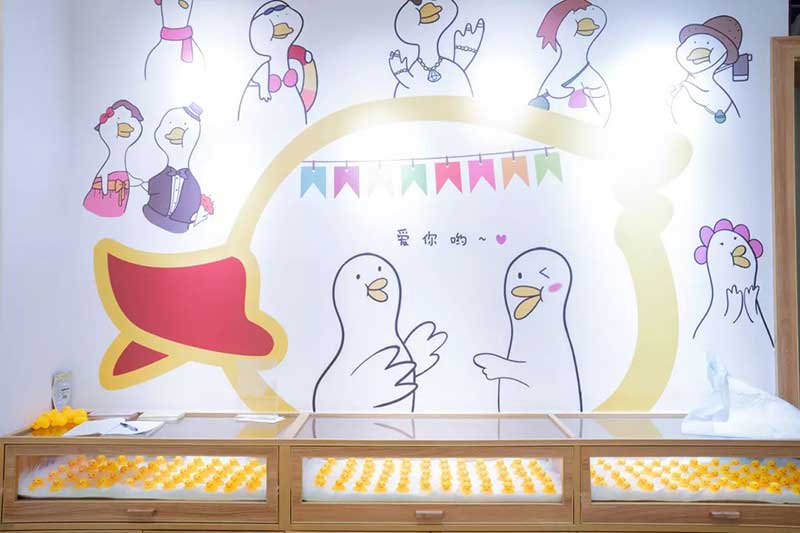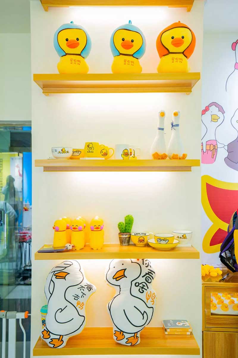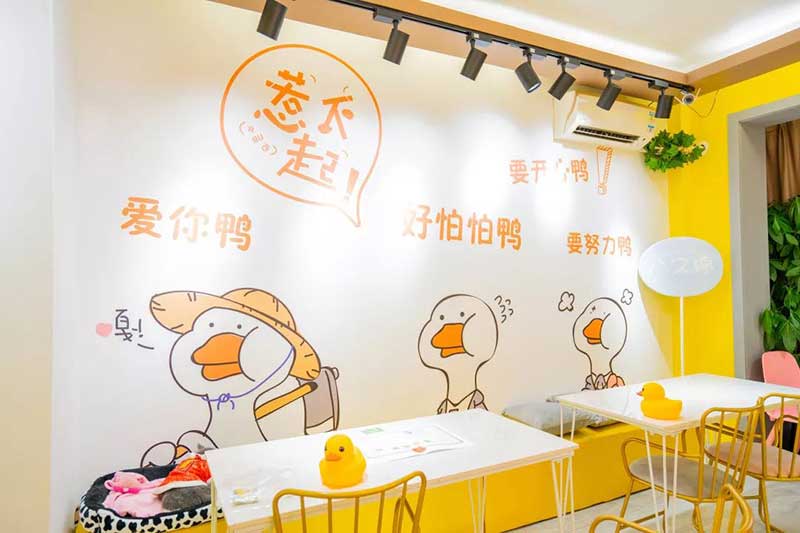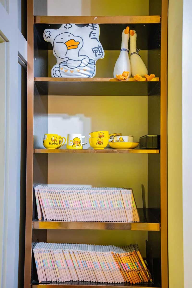 黄色与白色是冲鸭俱乐部的主色调,明亮又温馨的环境让每一个进来的顾客都能感受到心情愉悦,门口的架子上摆放了许多鸭鸭周边,抱枕、玩偶、杯子……每一个都可爱到爆棚!墙面铺设的表情包和明信片秒变拍照打卡点,抱着可爱的鸭鸭来一张合影,2020年也要一起努力鸭!走廊的尽头藏着一个僻静的小房间,房间内的架子上除了满满的鸭鸭周边,下层的柯南漫画也可以随意翻阅。小房间里还隐藏着一位“镇店元老”猫咪元宝,作为一只曼基康矮脚猫,似乎天然就带着萌萌的属性,肉乎乎的脸蛋搭配超级温顺的性格让人一下子陷入两难境地,温顺的猫咪、活泼的鸭鸭,到底选哪个?