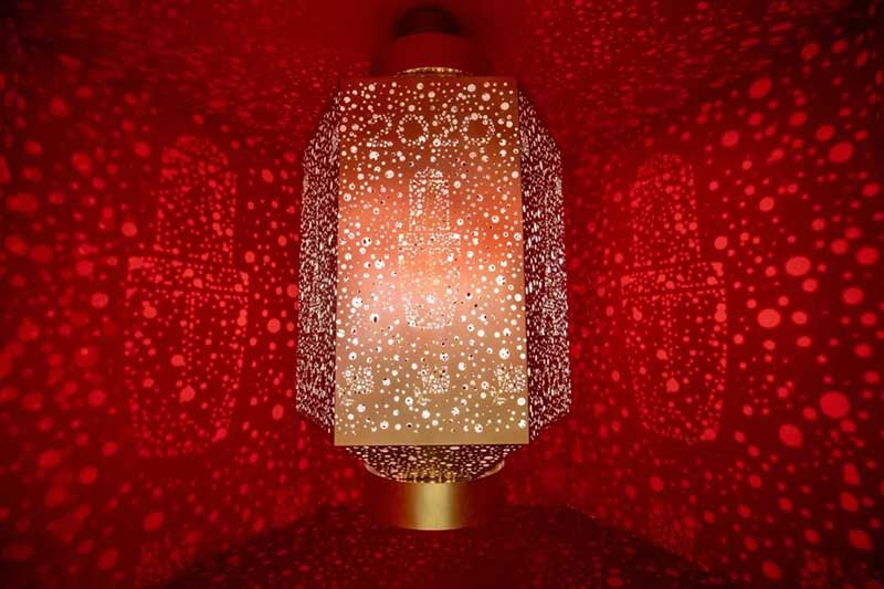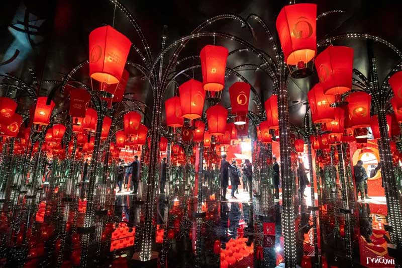 兰蔻新春游园会整个赏新灯区域被镜面覆盖,头顶是忽明忽暗的兰蔻灯笼,光怪陆离的世界中许下新年新愿愿新年胜旧年,这里可是赏新灯和打卡拍照的最佳位置哦,随手一拍出片率特高,大型的灯笼装点着整个空间,墙面上洒下星星点点的光斑,小黑瓶和埃菲尔铁塔的元素交替着,一旦进入就沉醉其中,快去看看现场吧。
