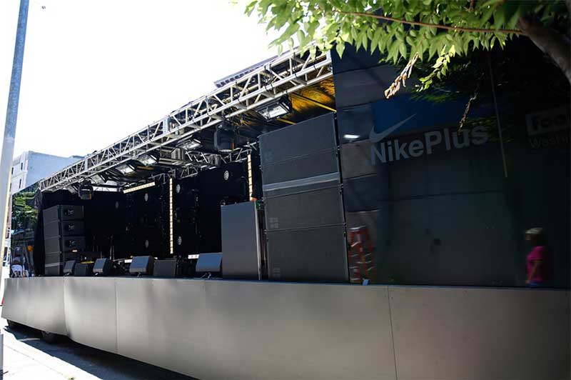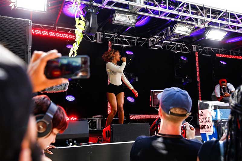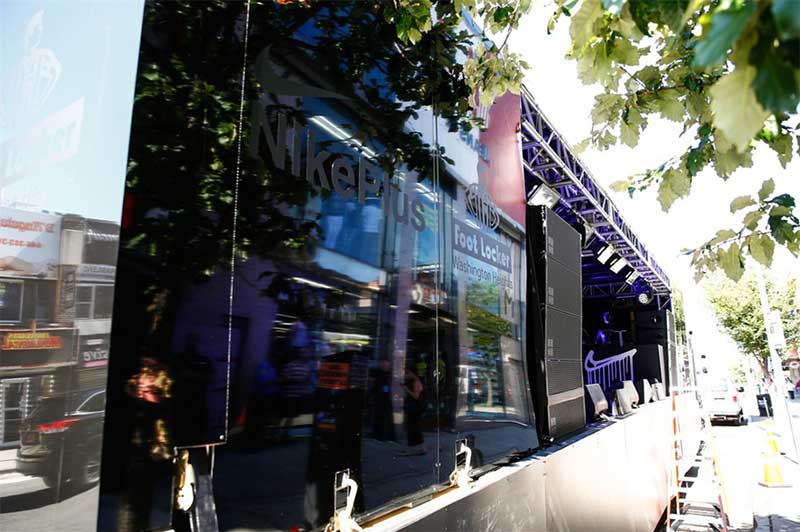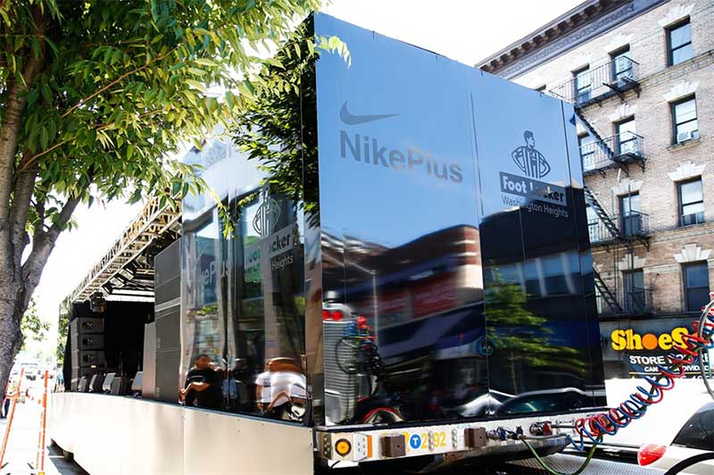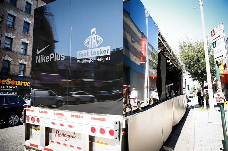 耐克与Foot locker合作举办了一场令人惊喜的快闪式音乐会,庆祝纽约华盛顿高地的Foot Locker店盛大开业,以此来刺激消费者。此次快闪店活动是在一个平板拖车上设计制作了一个定制的移动舞台,当地的天才歌手Melii和DJ Frank Roth在舞台上进行了表演,并欢迎粉丝们体验新的零售店。