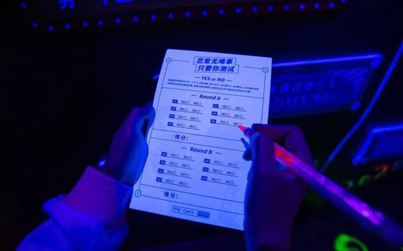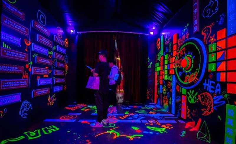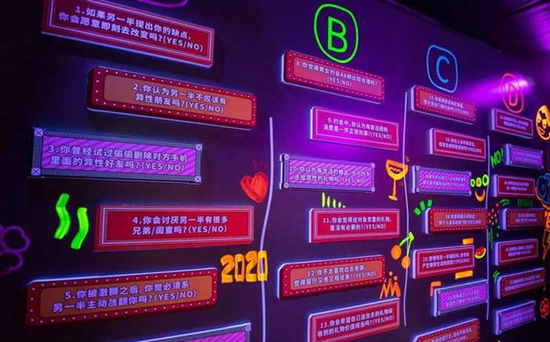 此次展览快闪店活动现场七大主题区可与回忆互动,测试自己恋爱人格的题目,还可听到双低以往的节目,简直是低迷们的集体回忆!17年来的金牌片段通过图片、声音重温,当年的感动故事,还有“急CALL”热线即时连线节目主持人。缘分学研发中心作为真个展览的C位,里面就像一个夜光艺术馆,在黑暗中发出了绚丽的荧光,布满了在紫外线照射下发光的绘画壁纸,只要你穿着白色衣服鞋子,都会有夜光的效果,酷炫爆表!
