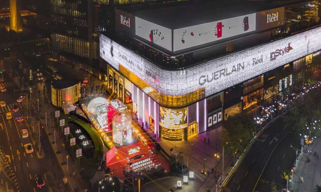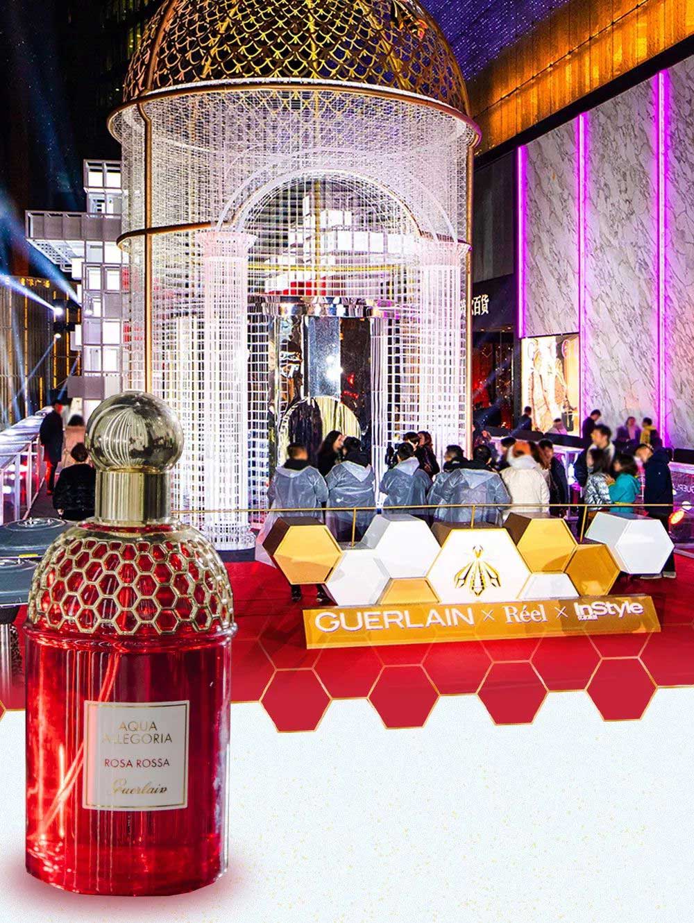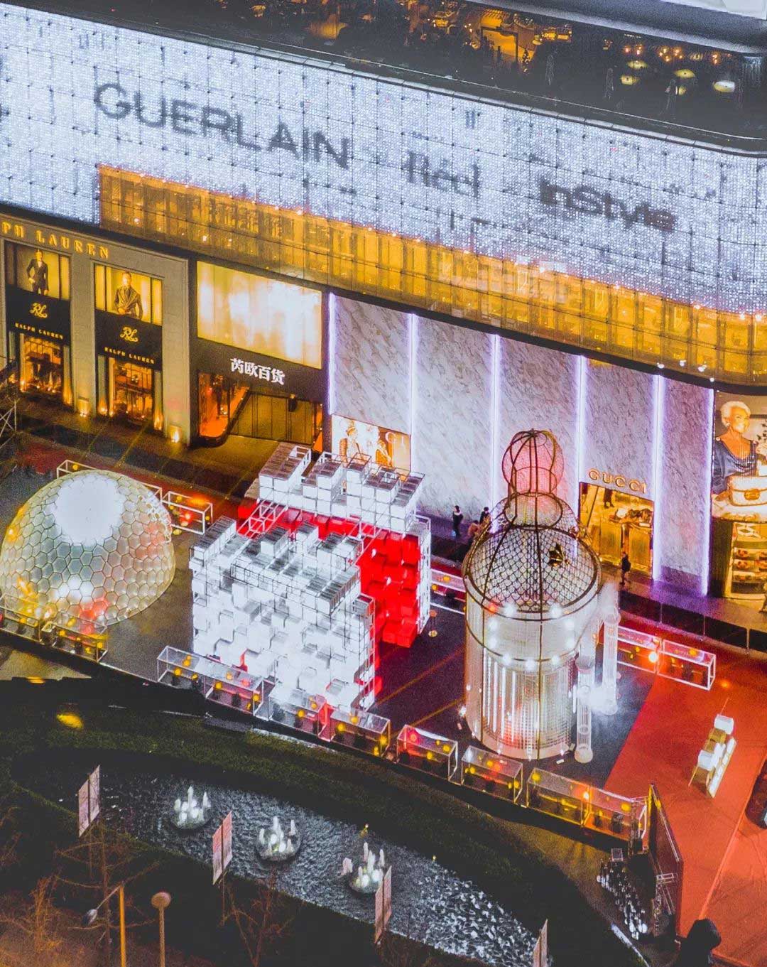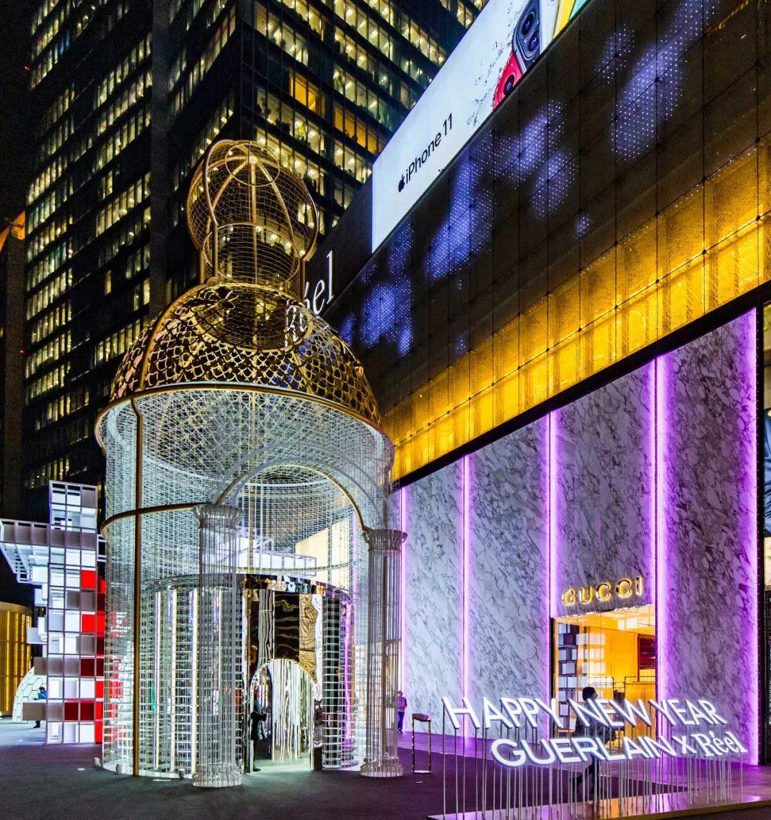夜幕降临,华灯初上,嘉宾们共同按下亮灯装置,法国娇兰标志性的金色小蜜蜂从礼盒上翩翩起飞,将三个艺术装置依次点亮,充满爱与感恩的新一年由此绽放。
