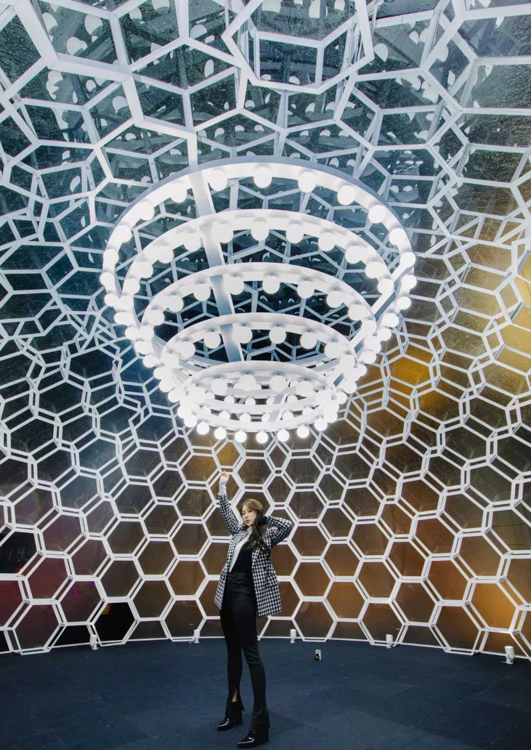 源自娇兰标志性蜜蜂的“光之肌”,巨大的蜂巢造型吸睛十足,灯光映衬下更是显得光彩逼人。走进蜂巢内部,穹顶之下,熠熠生辉,365个灯泡寓意散发光芒的365天,一步一个脚印,汇聚成迈向未来的新起点。