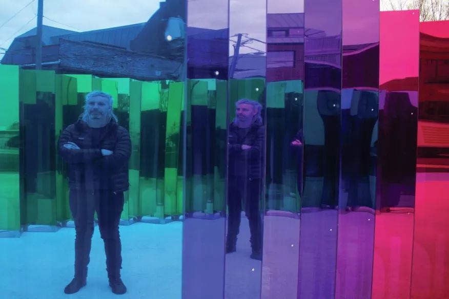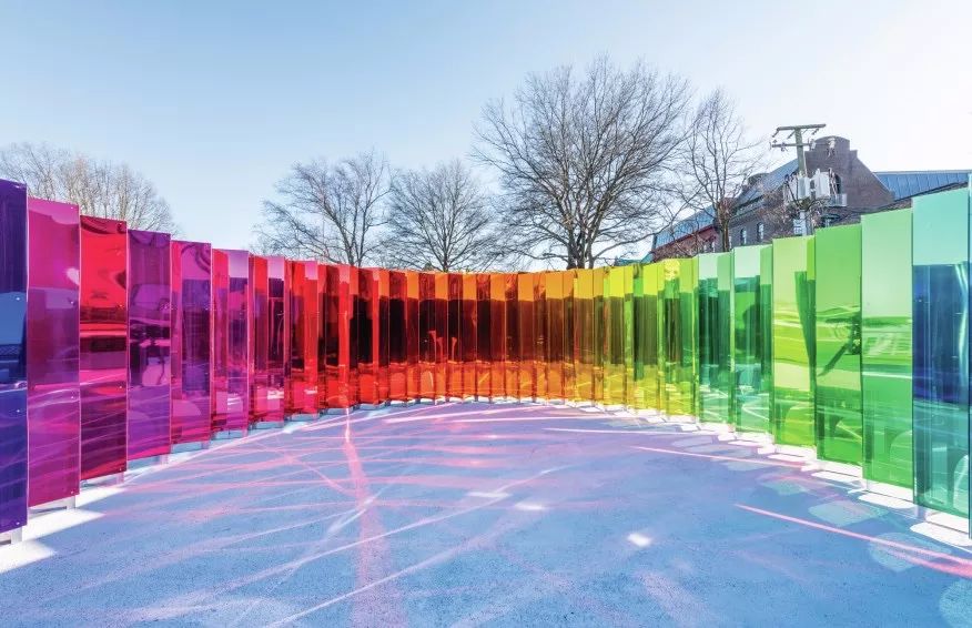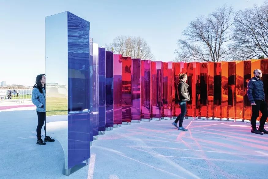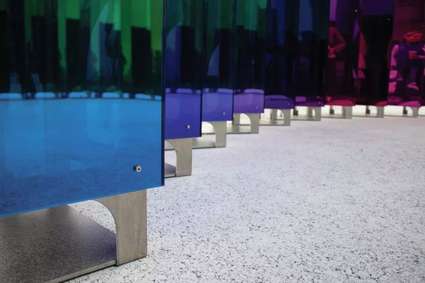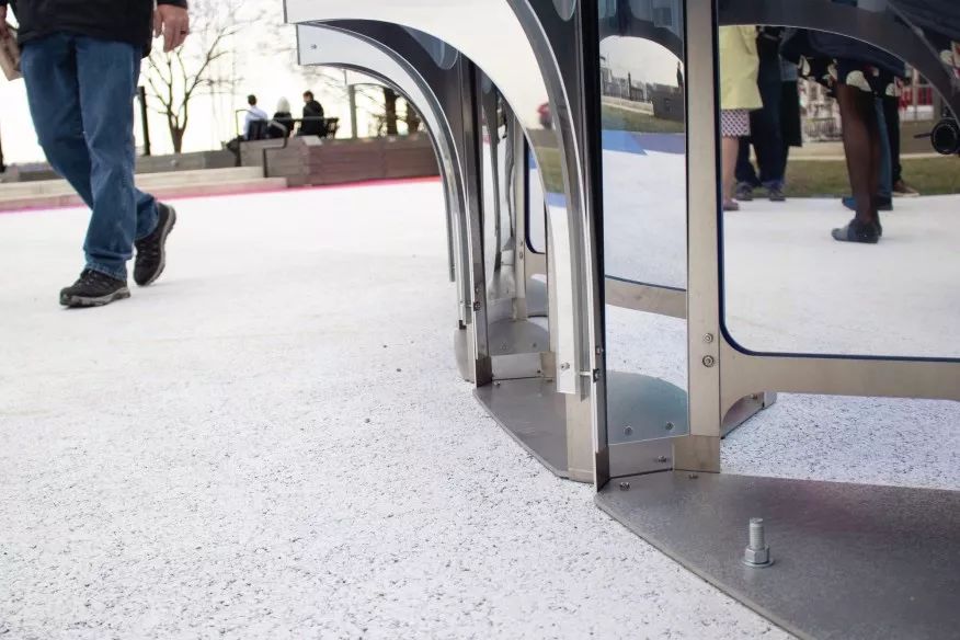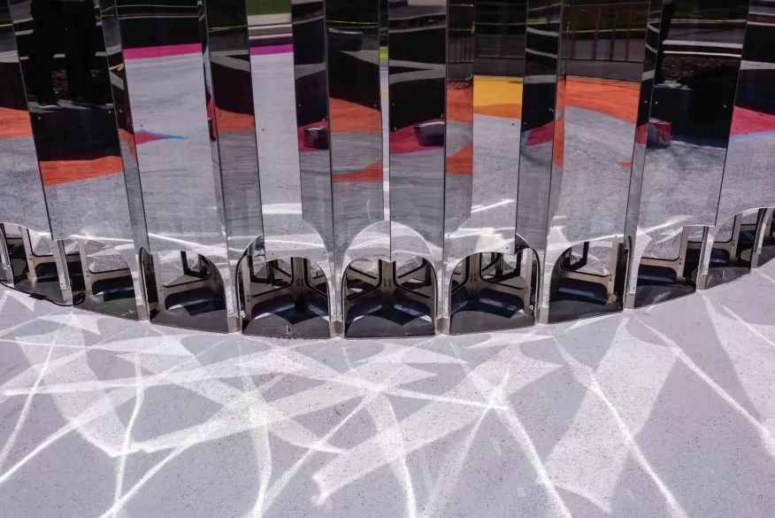 SoftLab的设计采用垂直面板的开放圆圈的形式,访客可以进入和进入。外表面镀有镜面涂层,可反射环境和现场周围的行人。在圆圈内,表面覆盖着一系列光谱。面板上装有定制的LED管,可响应声音:柔和的声音会引起随机的光突发,类似于颤动,而较大的声音会产生脉冲。随着夜幕的降临,表面变得更加透明,使光线透过面板发光并从面对面的镜子反射出去。Szivos说,装置所在的人行道被漆成白色,以使灯光“在地面上形成壁画”。