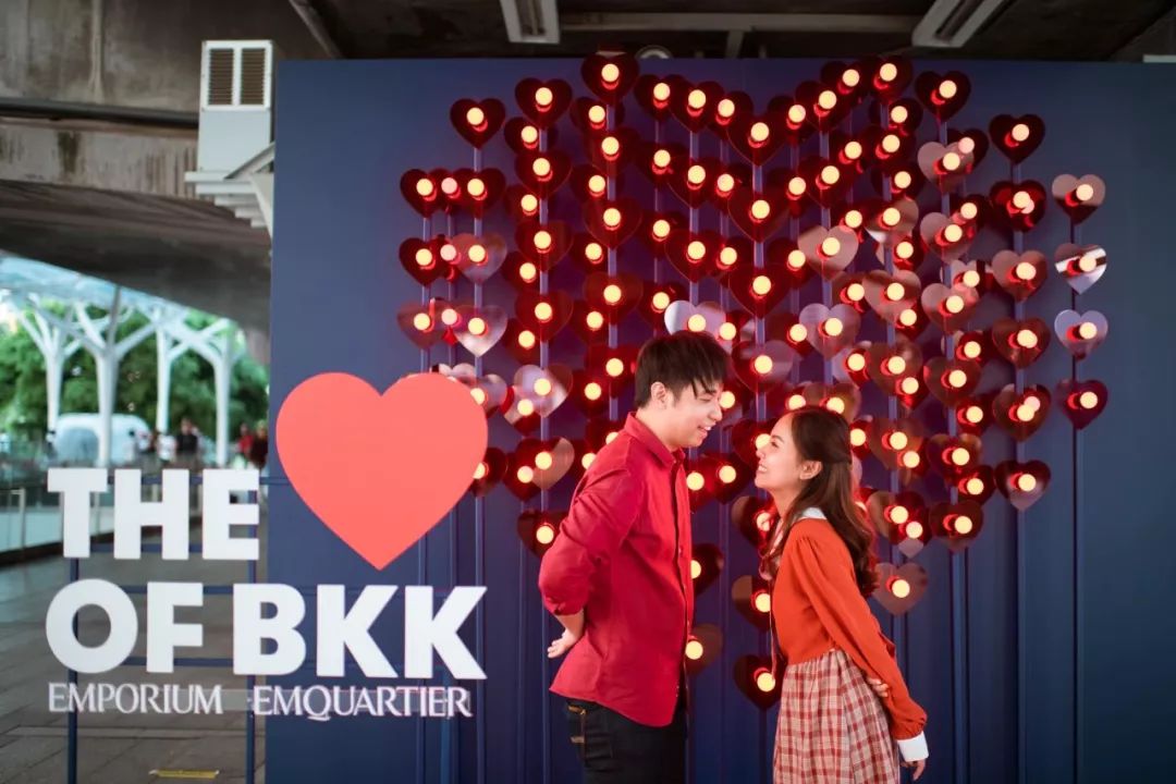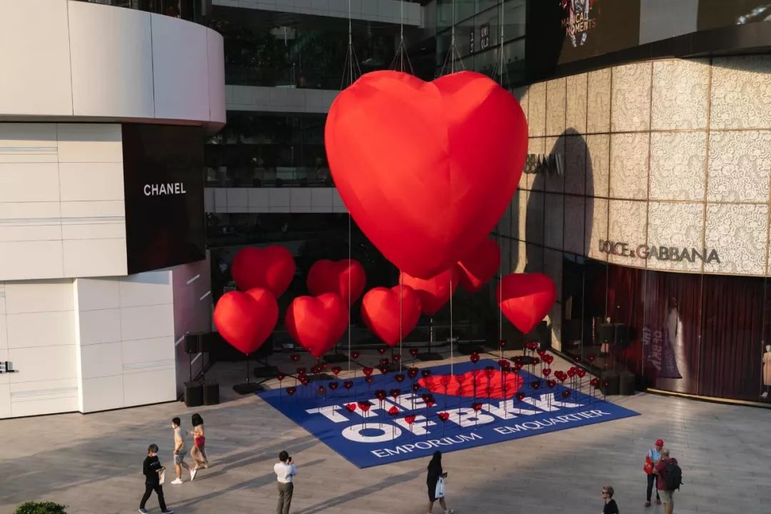 泰国曼谷Emporium and Emquartier购物中心多处被爱心装置占领,成为情侣们必去的打卡点。最惹眼的就是超10米高的红色爱心气模,晚上还有爱心夜灯亮起,让爱侣们置身浪漫空间,再次怦然心动。